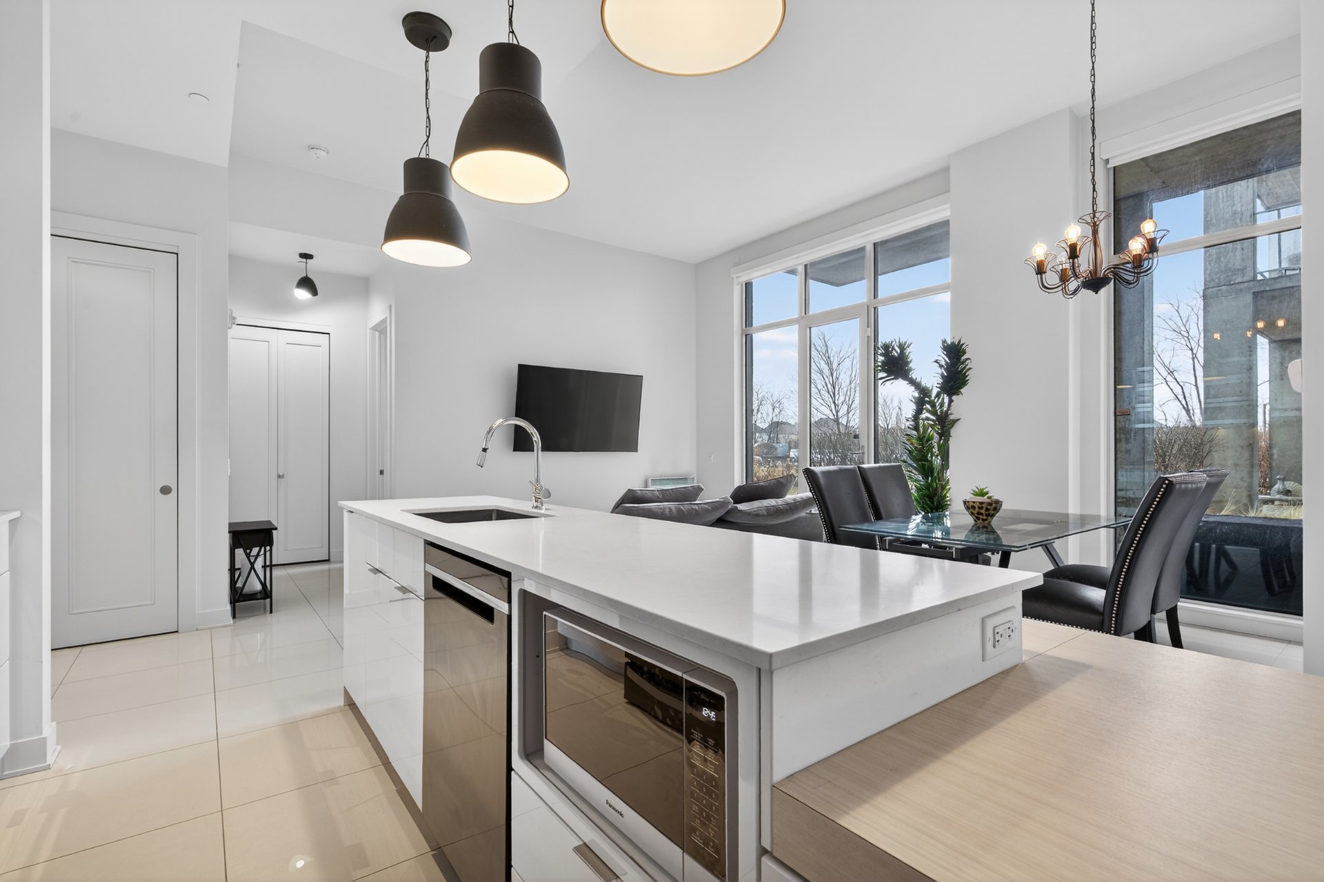 Stunning upscale condo in a sought-after modern building in the heart of Laval. Bright open-concept layout with floor-to-ceiling windows, contemporary kitchen with large island, and elegant finishes throughout. Features 2 spacious bedrooms, including a primary suite with ensuite, plus a second full bathroom. Enjoy automatic blinds, integrated speakers, private terrace, and indoor garage parking. Well-maintained building with elevator and professional management. Prime location close to highways, transit, restaurants, shopping, and services. Turnkey opportunity offering comfort, style, and urban living.