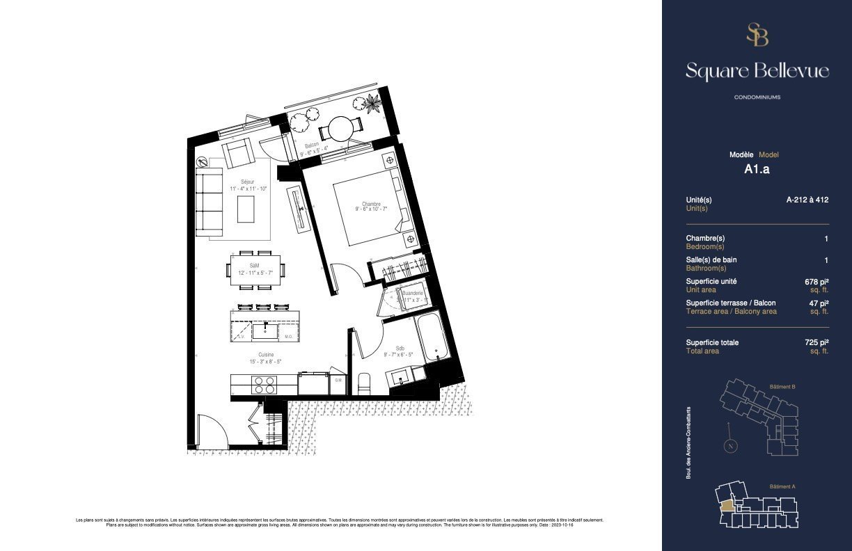 Square Bellevue --1 bedroom condo, large kitchen with a big island and 4 appliances, a spacious and open living area, and a balcony. Enjoy central A/C, heat, and hot water included in condo fees.