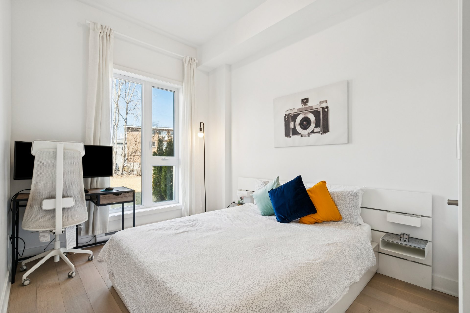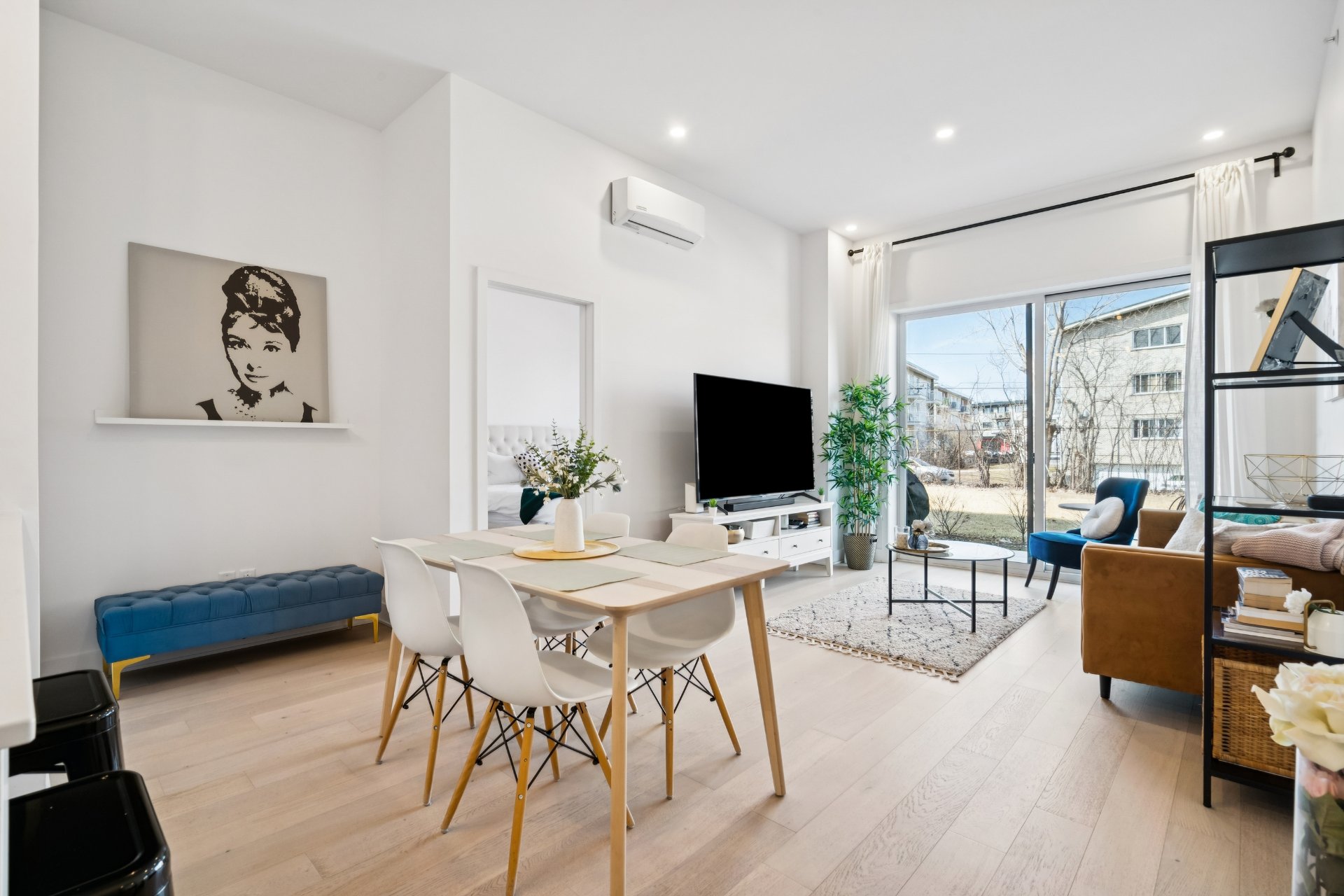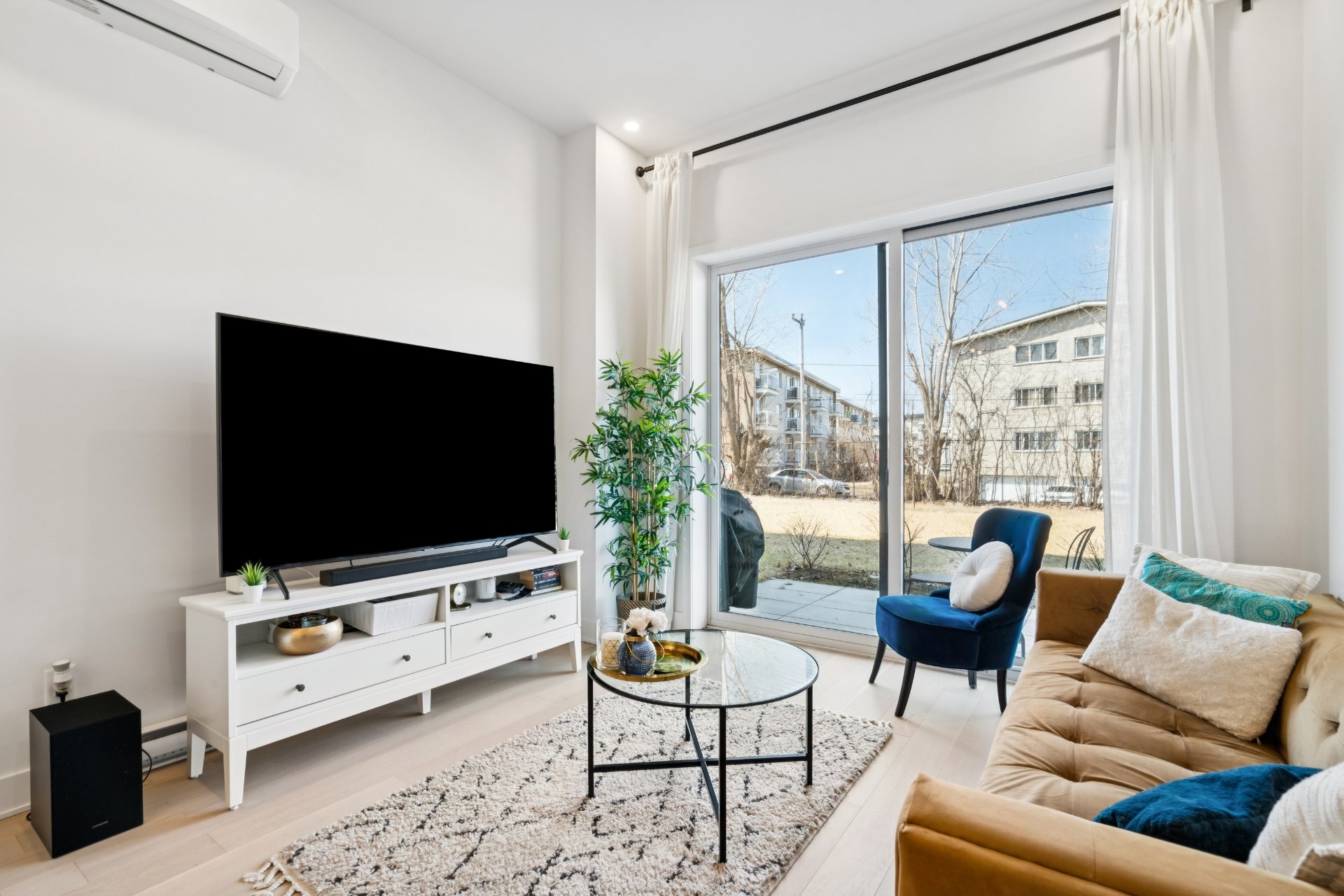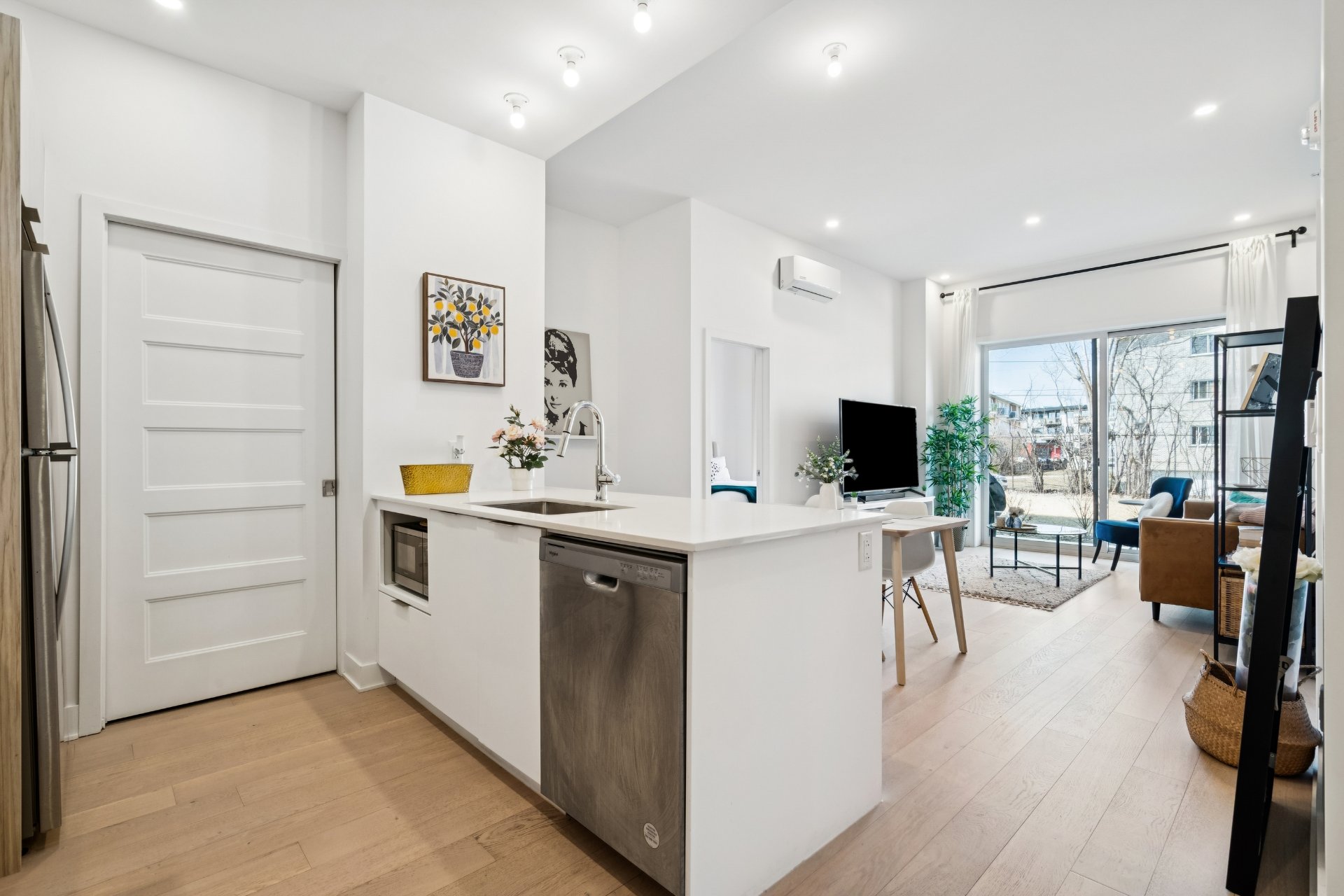 Stunning modern condo in Ahuntsic, steps from Saint-Benoît Park and a 5-minute walk from Fleury West. This light-filled unit features an open-concept living space with a contemporary kitchen and central island, open to the living and dining room with ceilings over 10 feet. Large windows ensure abundant natural sunlight. There are two generously sized bedrooms, one with a walk-in closet, and two modern bathrooms. Enjoy a pleasant private terrace, perfect for relaxing. Garage and storage locker included. The building also offers an exercise room and a common terrace. Still under builder warranty