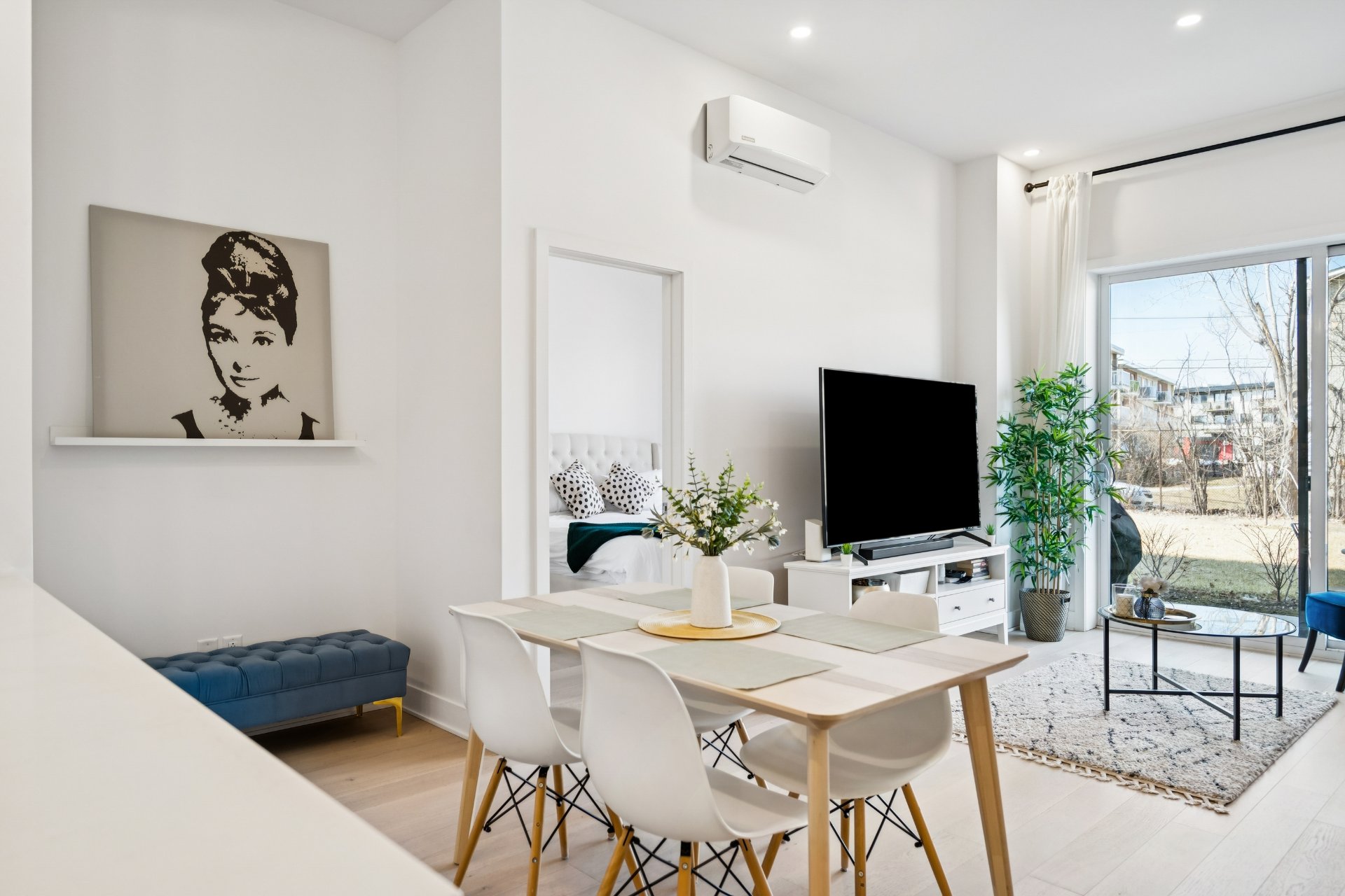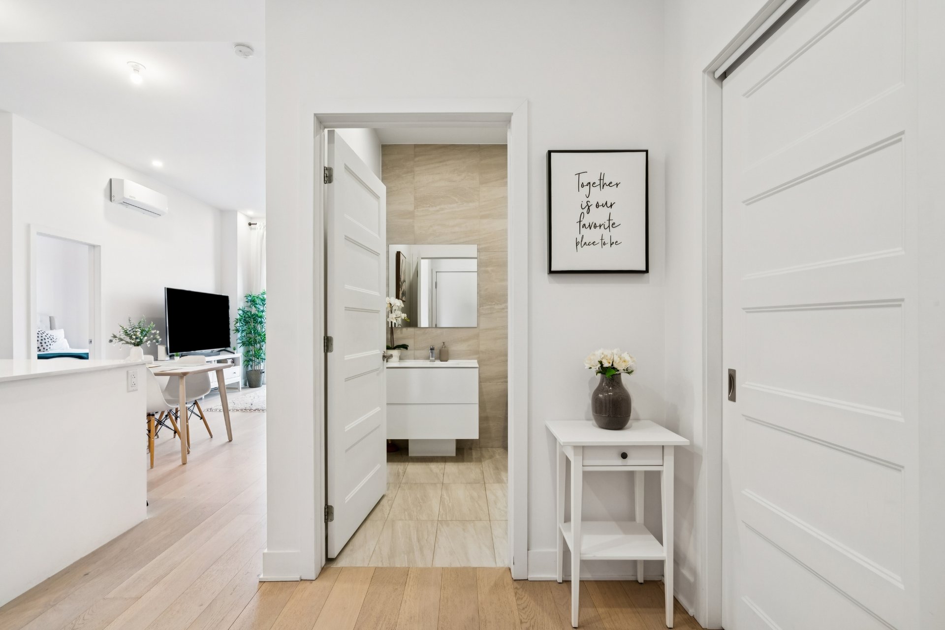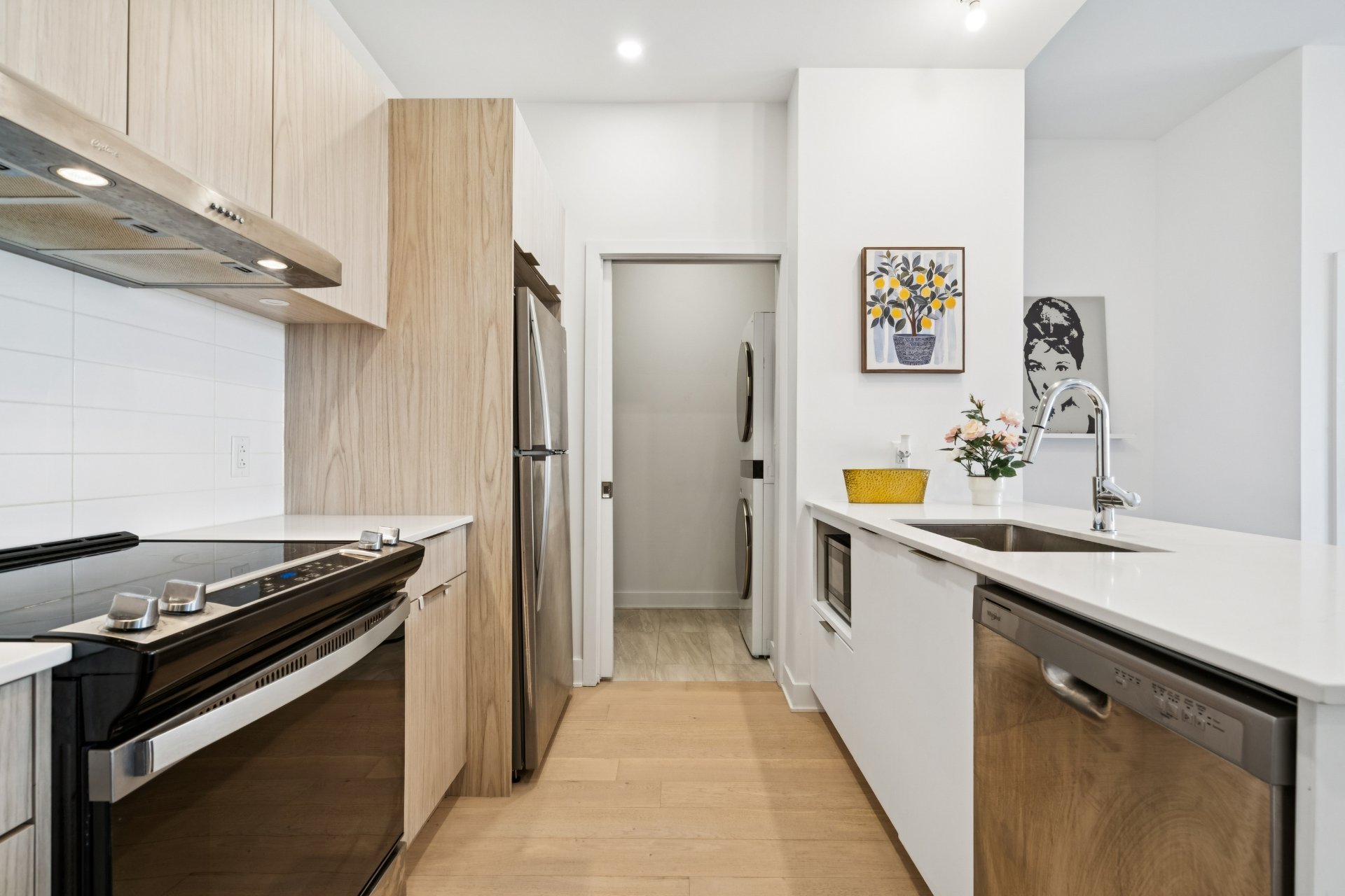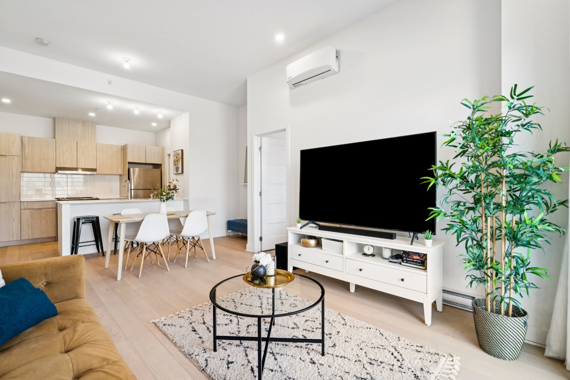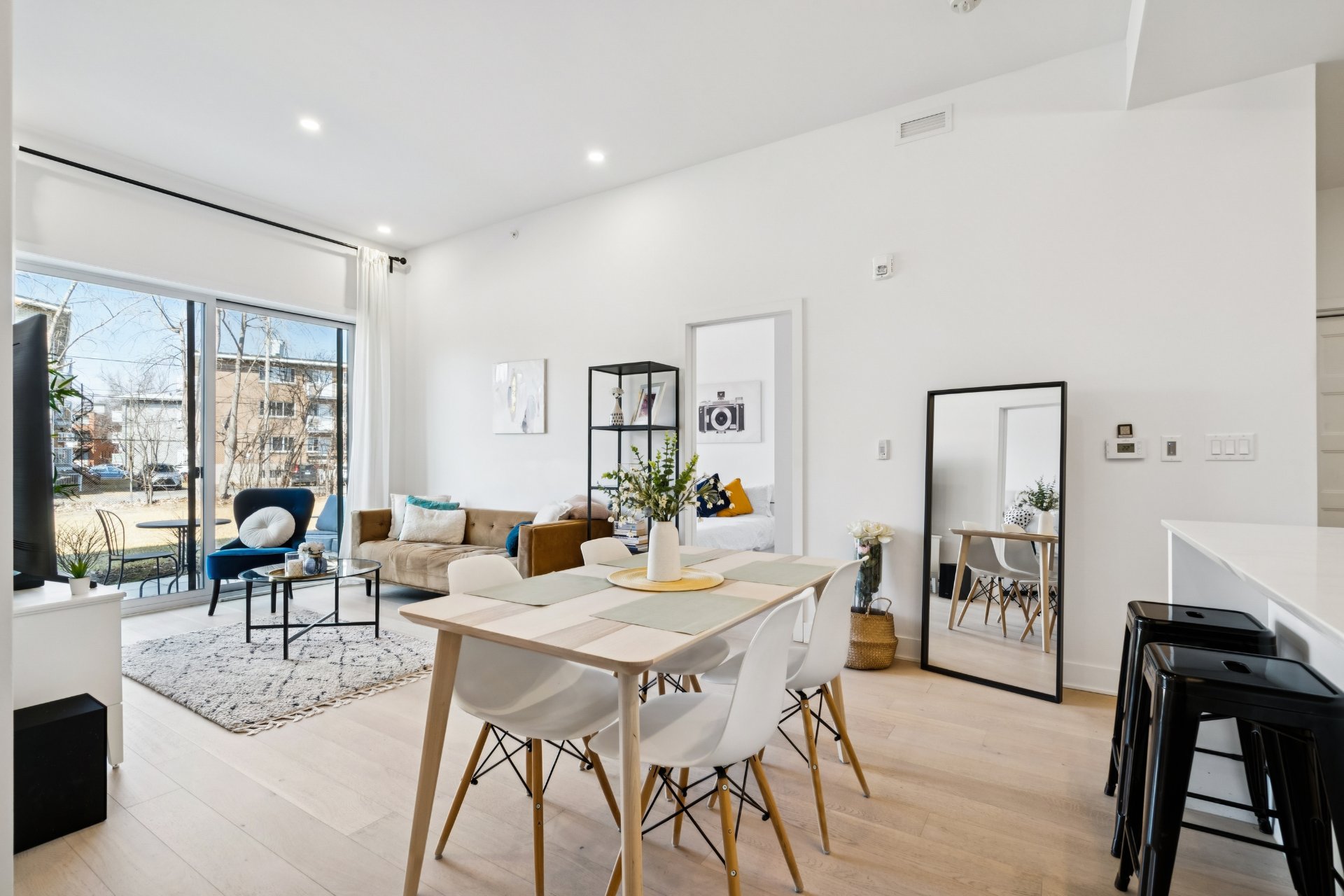 Stunning modern condo in Ahuntsic, steps from Saint-Benoît Park and a 5-minute walk from Fleury West. This light-filled unit features an open-concept living space with a contemporary kitchen and central island, open to the living and dining room with ceilings over 10 feet. Large windows ensure abundant natural sunlight. There are two generously sized bedrooms, one with a walk-in closet, and two modern bathrooms. Enjoy a pleasant private terrace, perfect for relaxing. Garage and storage locker included. The building also offers an exercise room and a common terrace. Still under builder warranty