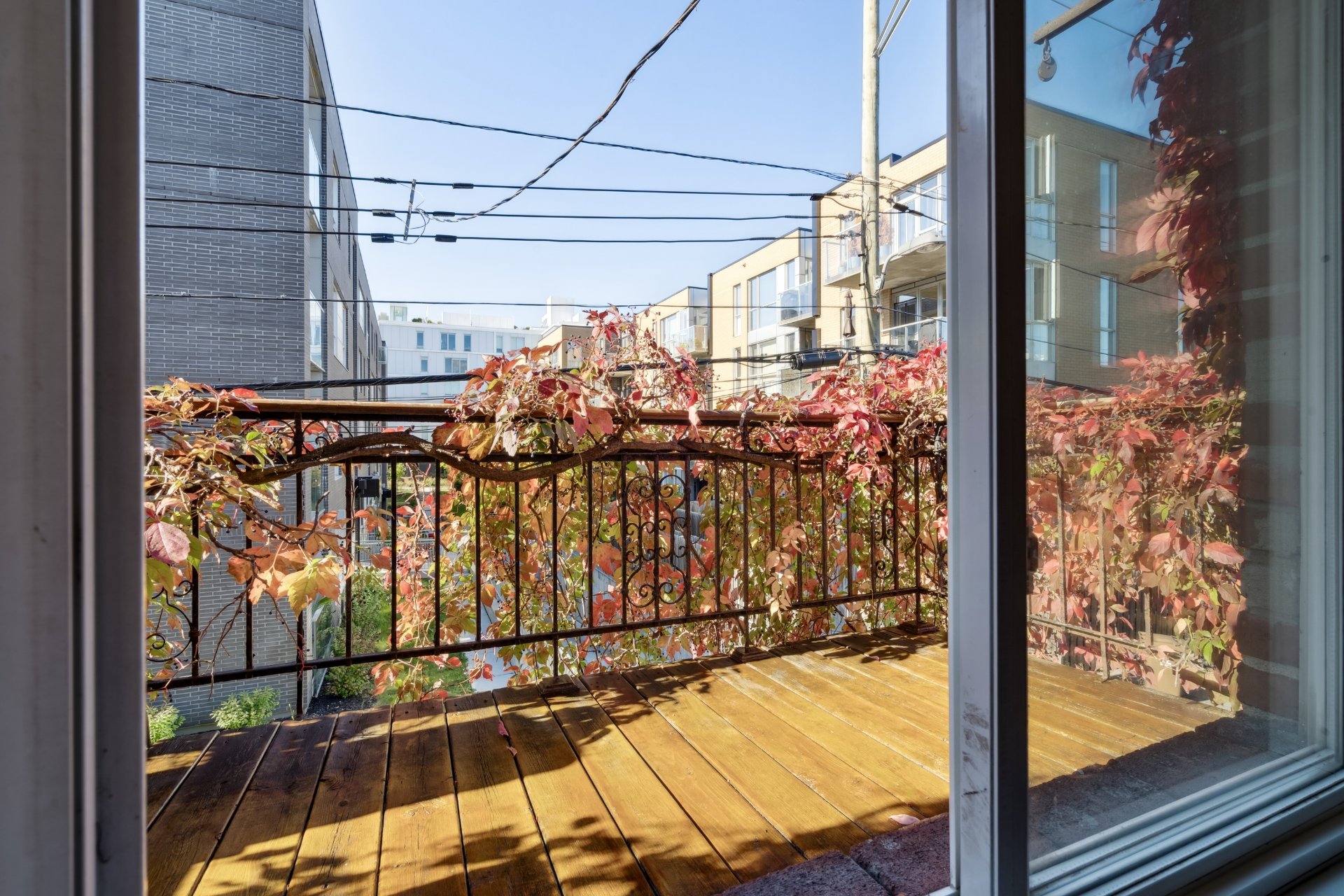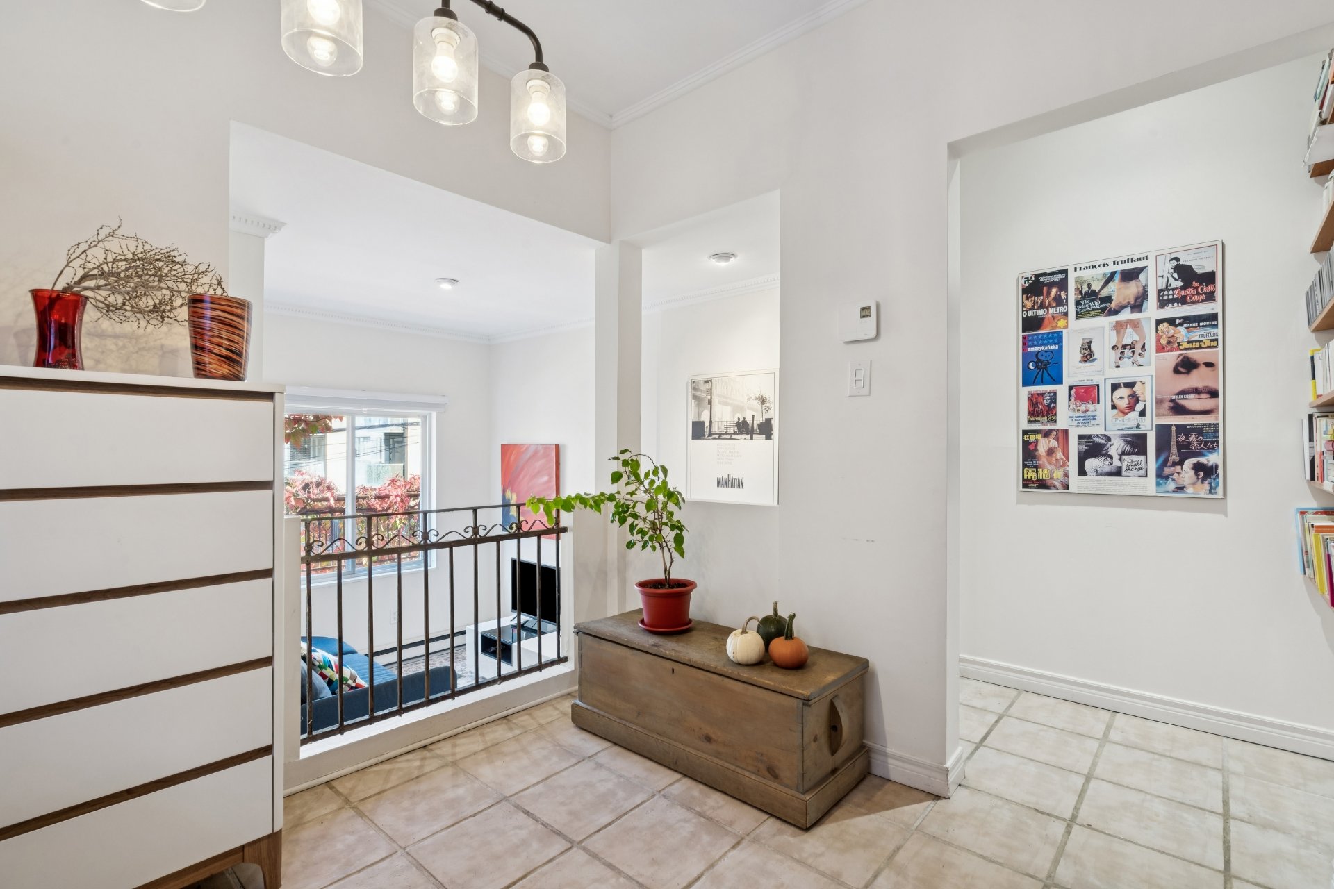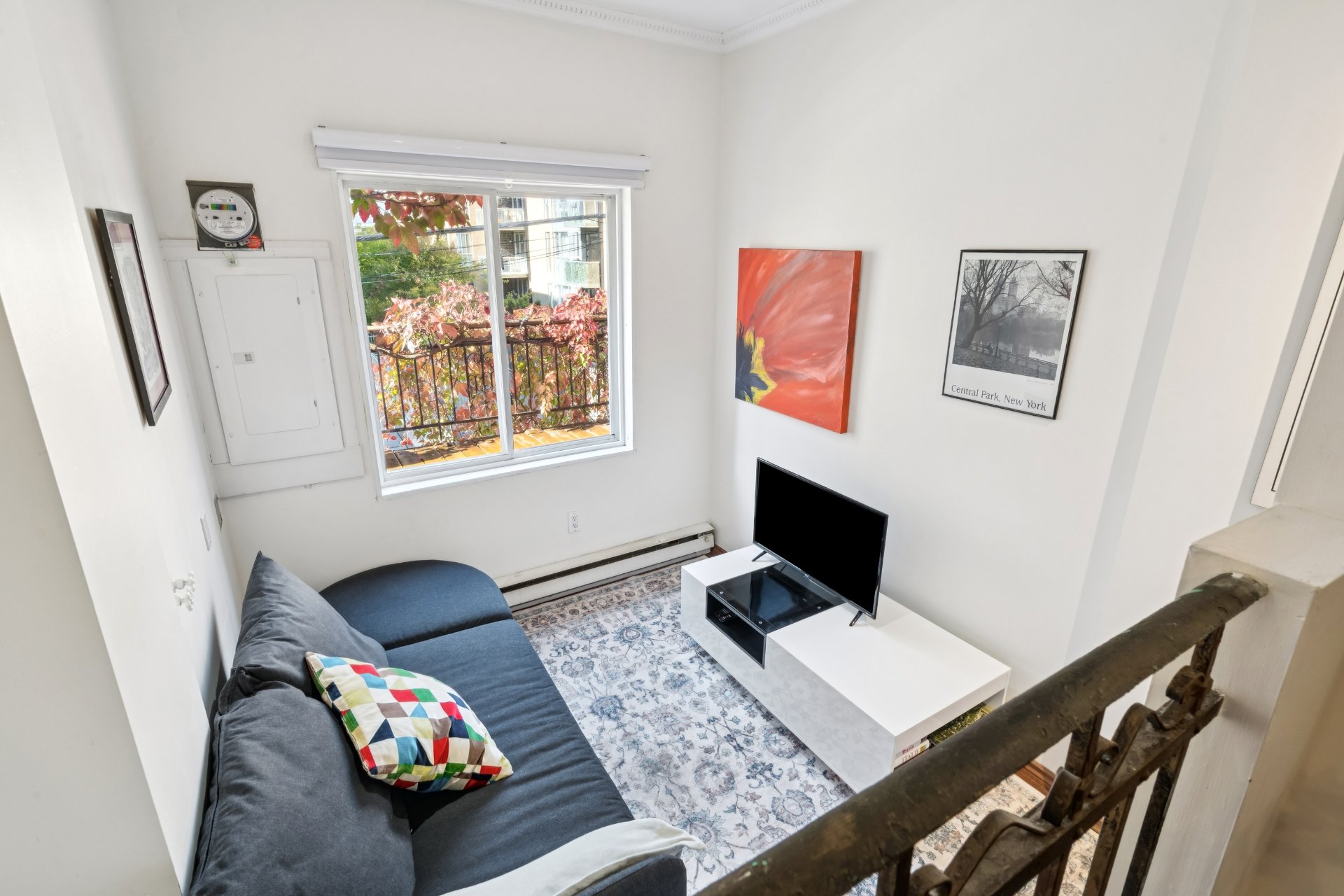 iron interior railing and charming French folding doors.