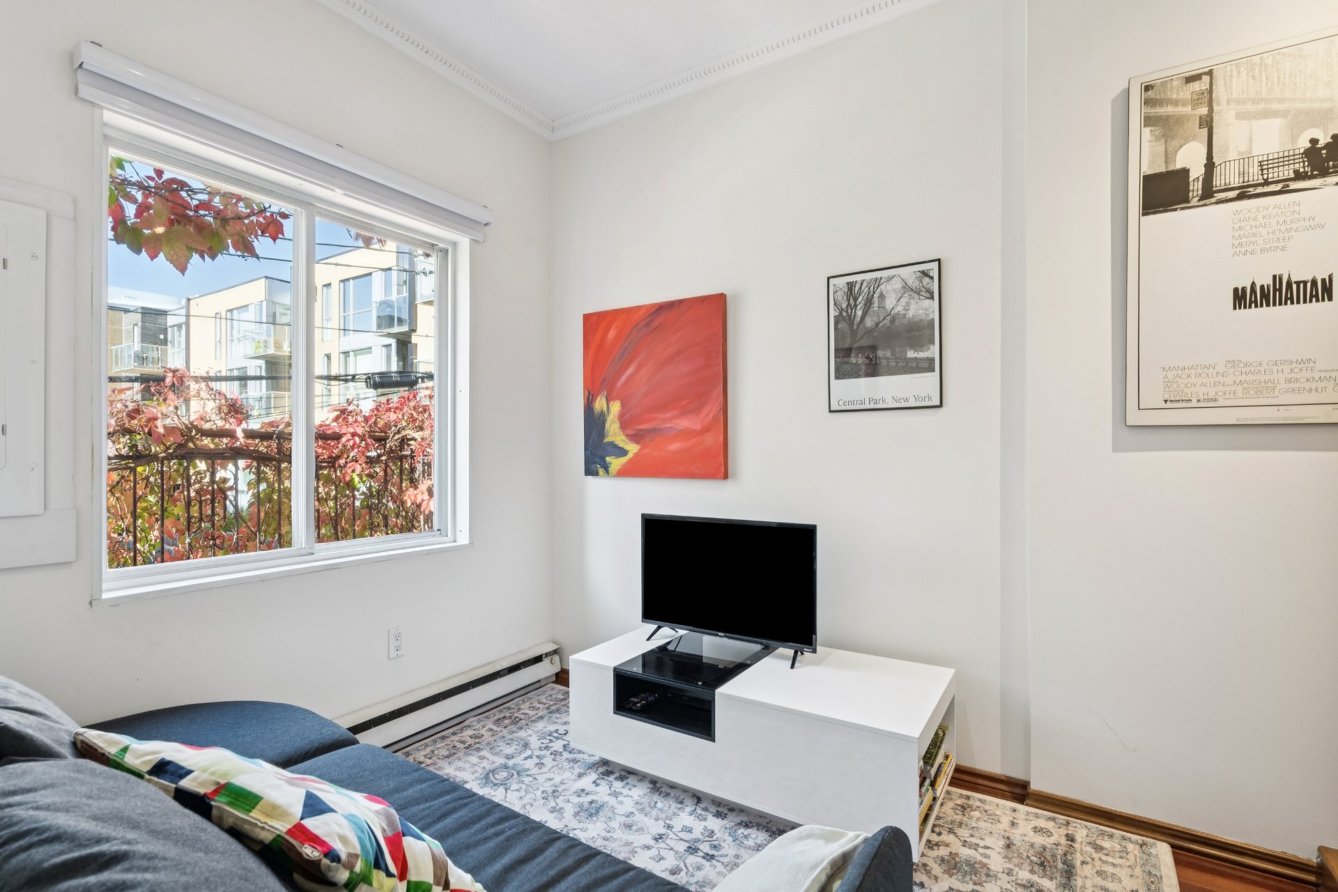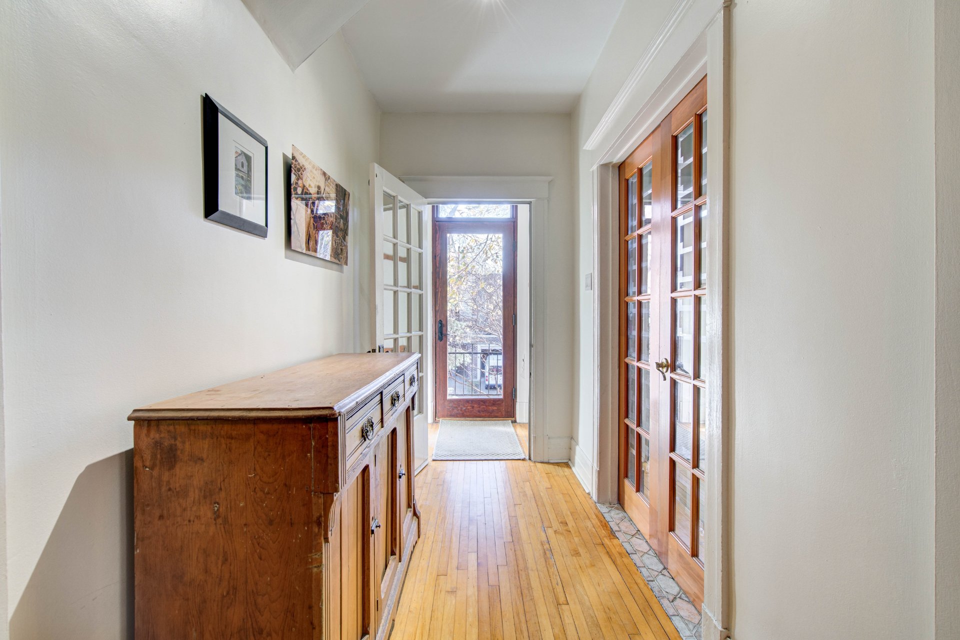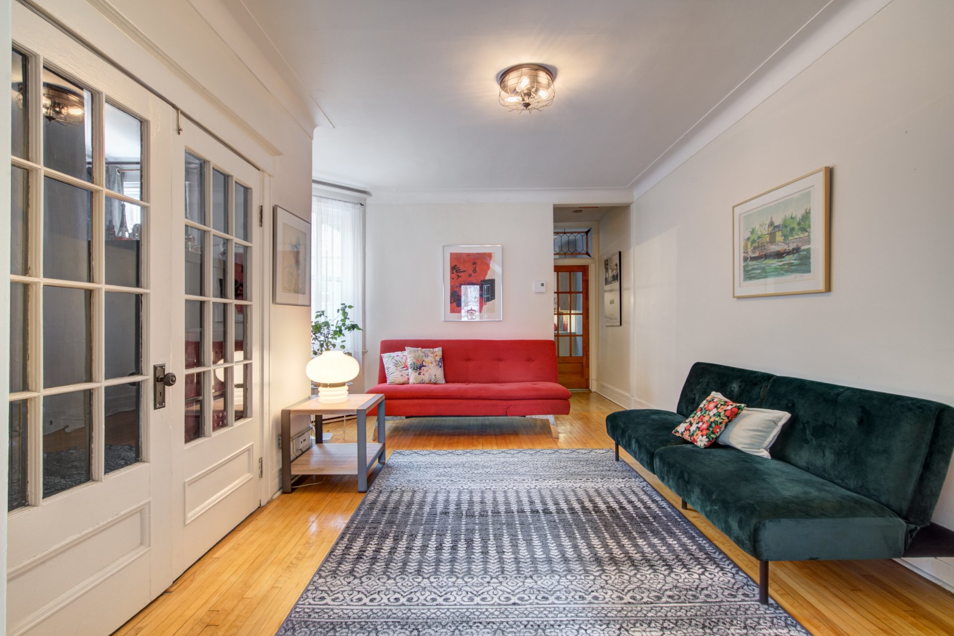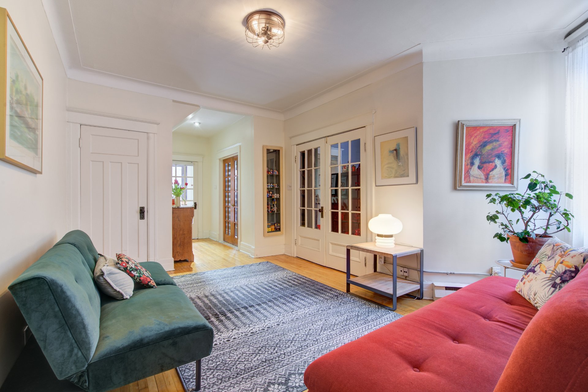 iron interior railing and charming French folding doors.