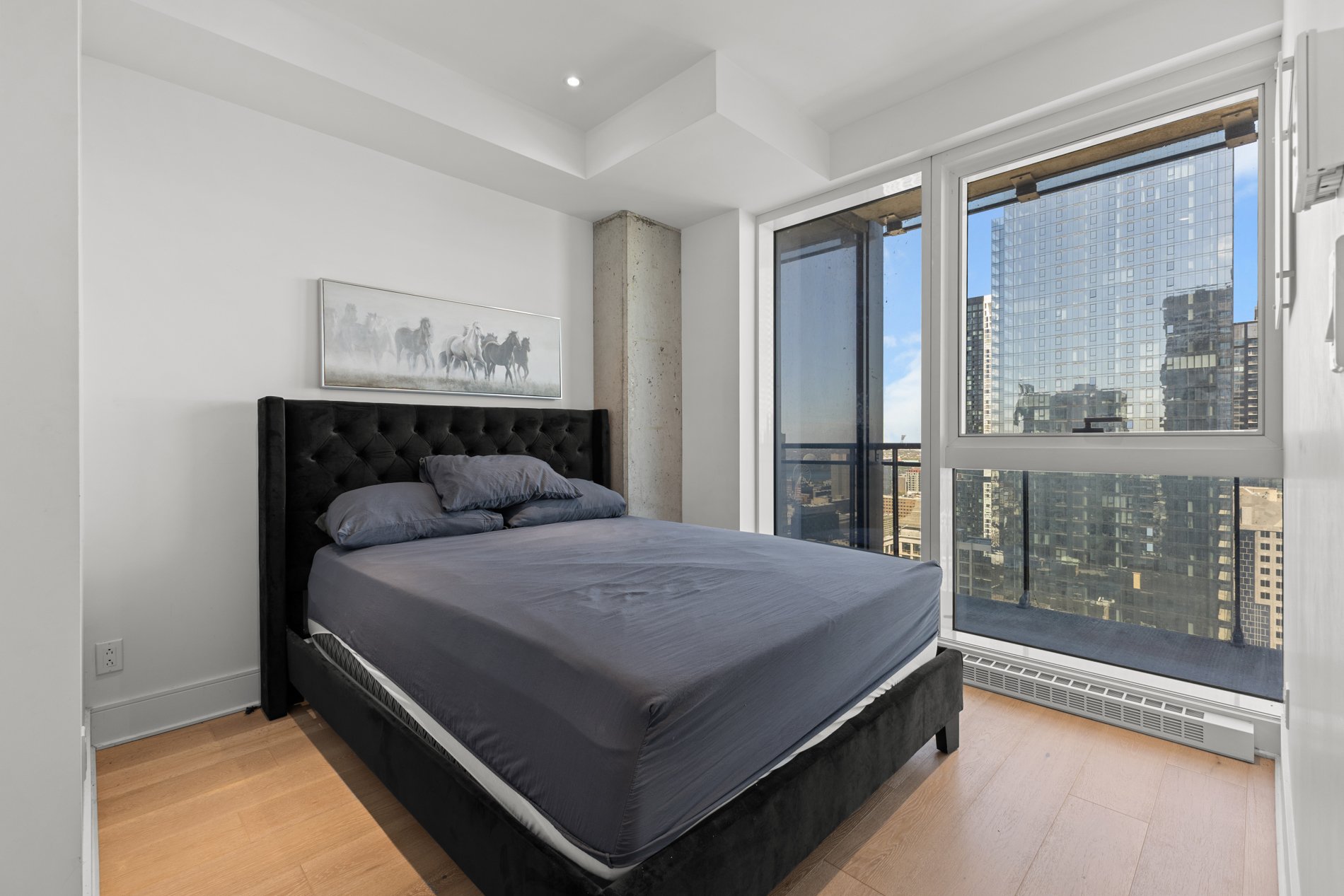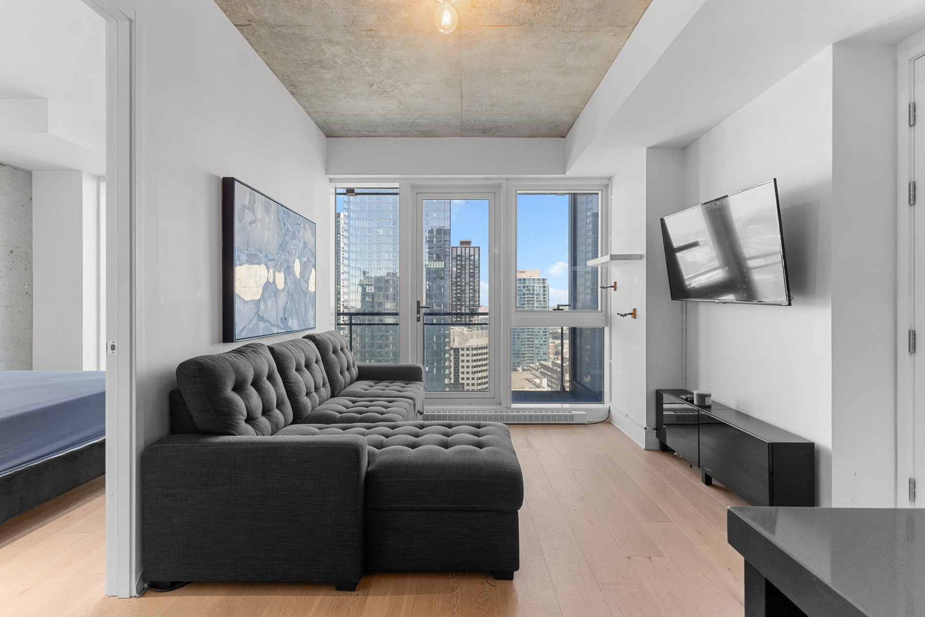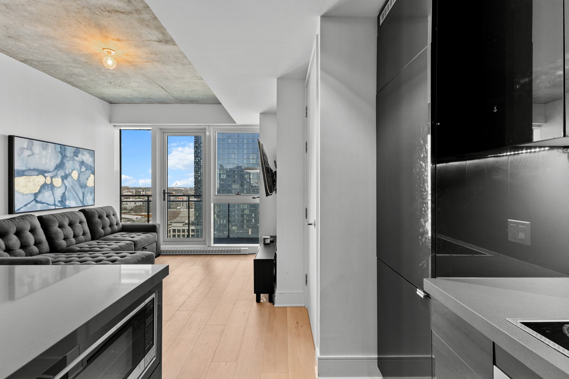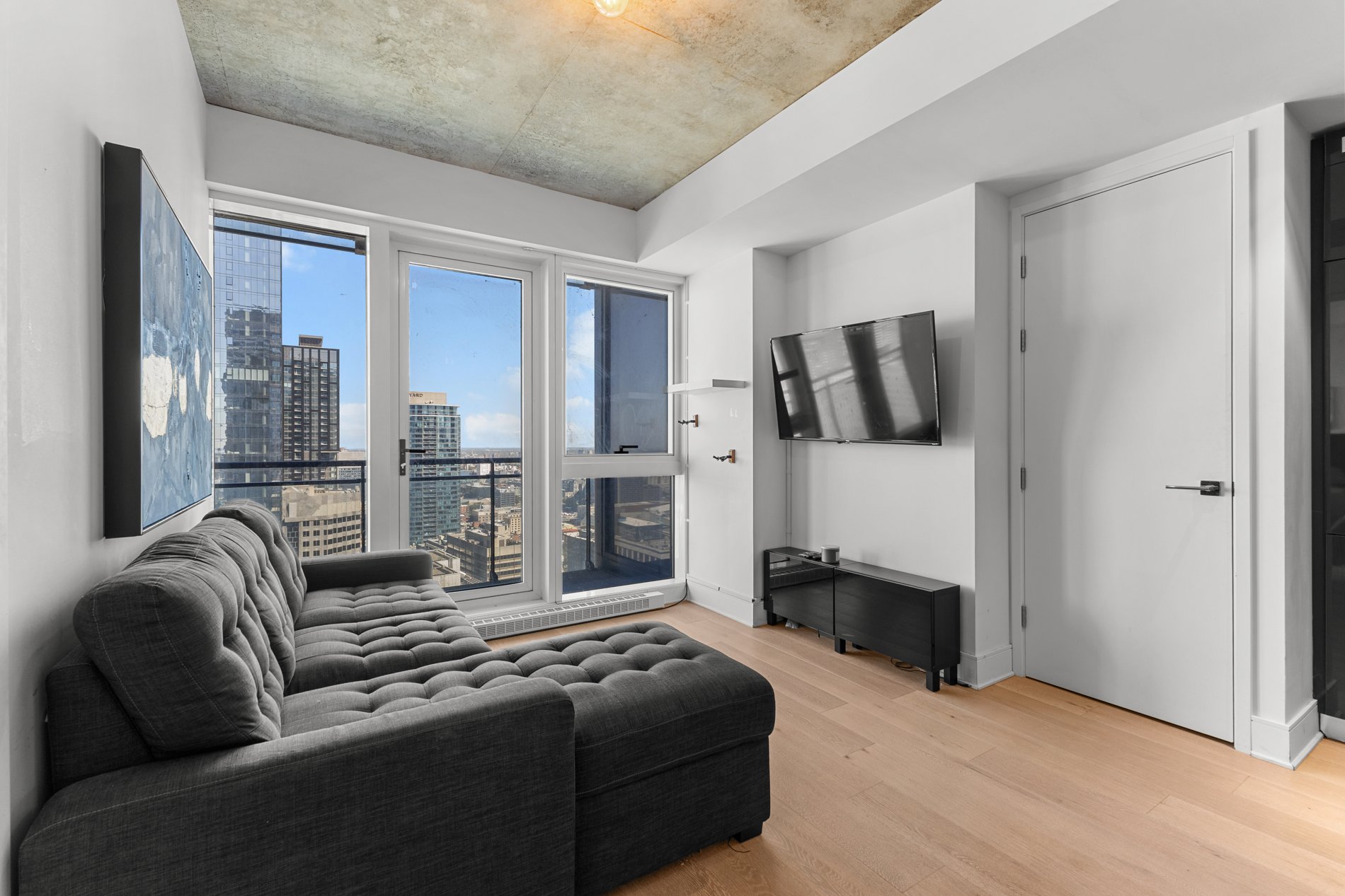 Welcome to the luxurious TOM condominium project. This high-end condo is located on the 33rd floor and features a large balcony offering a breathtaking view of Montreal. Situated in the heart of downtown, it's close to everything the vibrant Montreal lifestyle has to offer. Enjoy abundant natural light throughout the day. Concrete construction between floors ensures excellent soundproofing, offering you the privacy you deserve! An indoor pool with sauna and spa, as well as a fully equipped gym, provide an exceptional quality of life. A security guard present 24h/7 . Ideal for students, professional or as a secure investment!