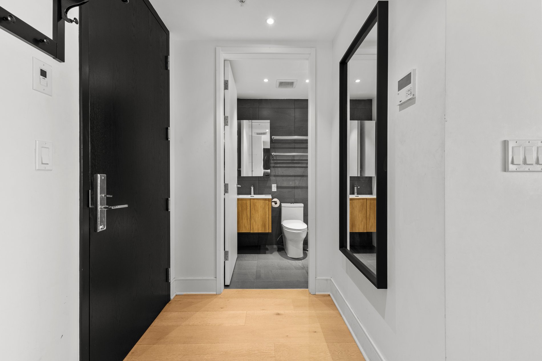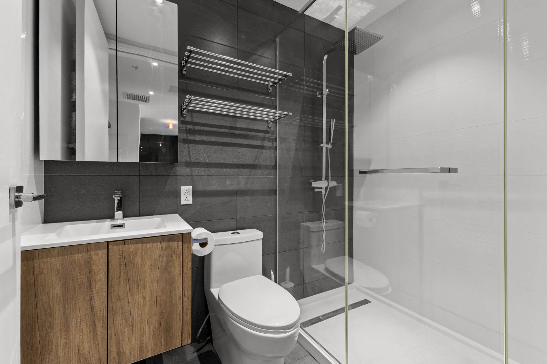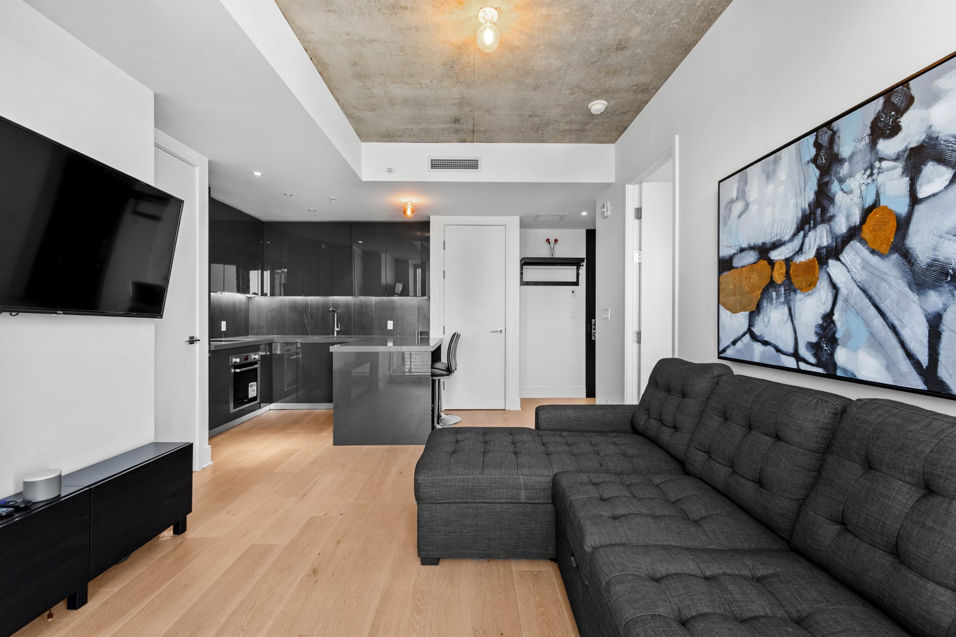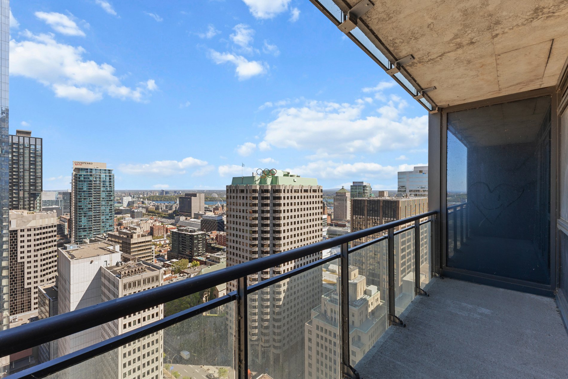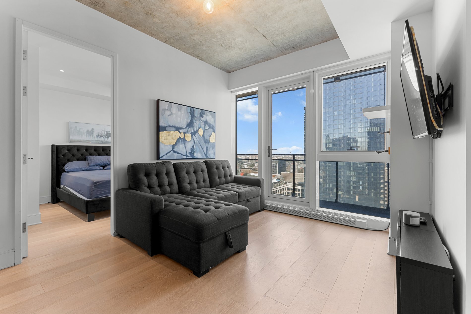 Welcome to the luxurious TOM condominium project. This high-end condo is located on the 33rd floor and features a large balcony offering a breathtaking view of Montreal. Situated in the heart of downtown, it's close to everything the vibrant Montreal lifestyle has to offer. Enjoy abundant natural light throughout the day. Concrete construction between floors ensures excellent soundproofing, offering you the privacy you deserve! An indoor pool with sauna and spa, as well as a fully equipped gym, provide an exceptional quality of life. A security guard present 24h/7 . Ideal for students, professional or as a secure investment!