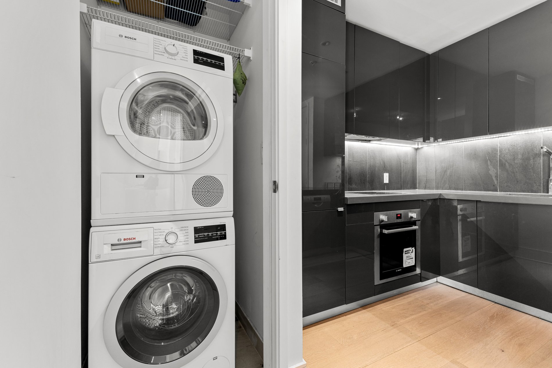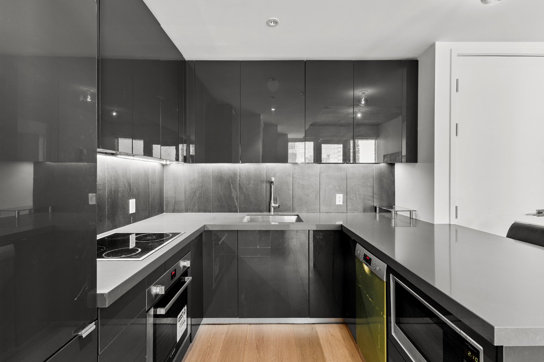 +Quartz countertops and glossy lacquer cabinetry--ideal for