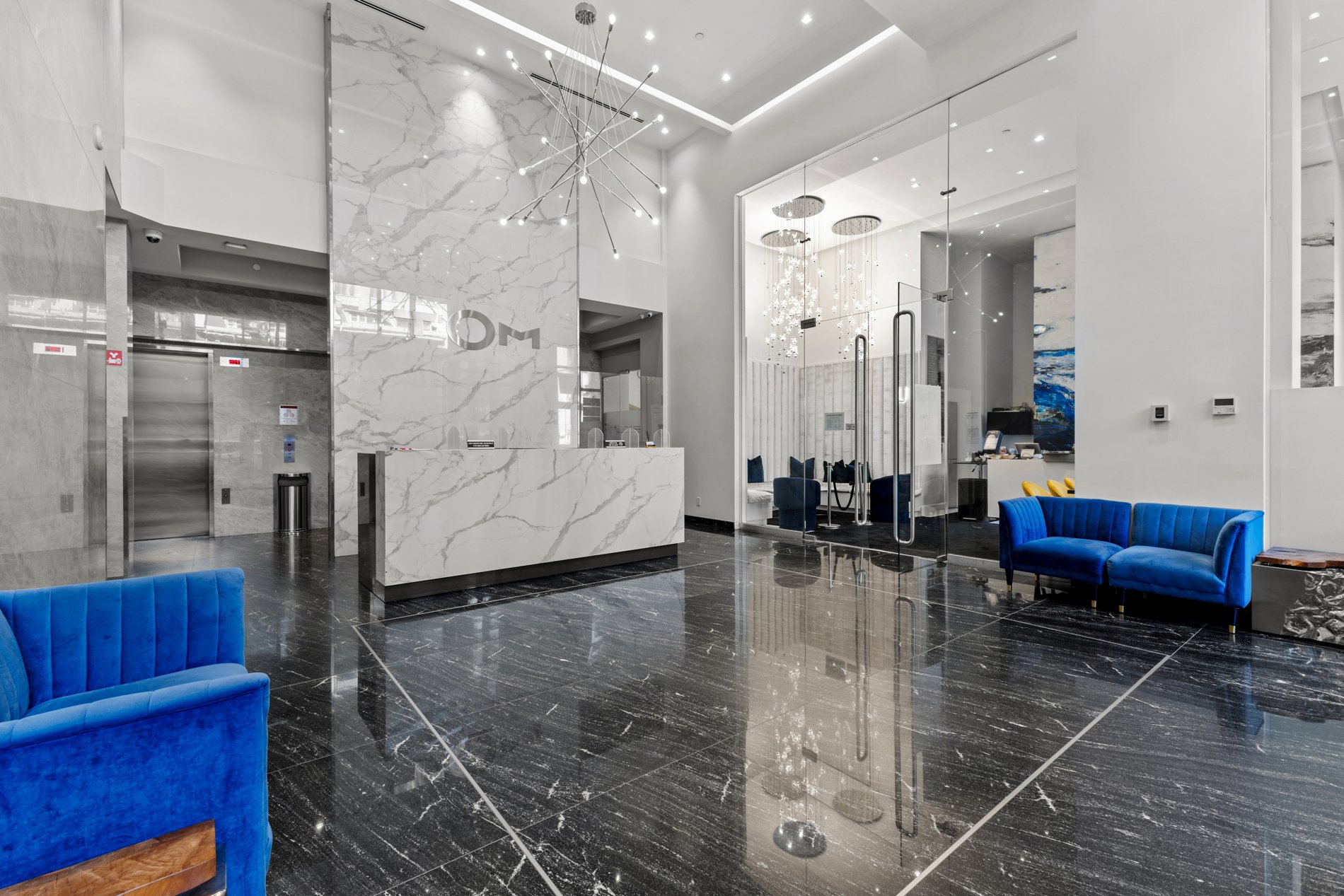 Elegant party room with kitchen; avant-garde lobby and