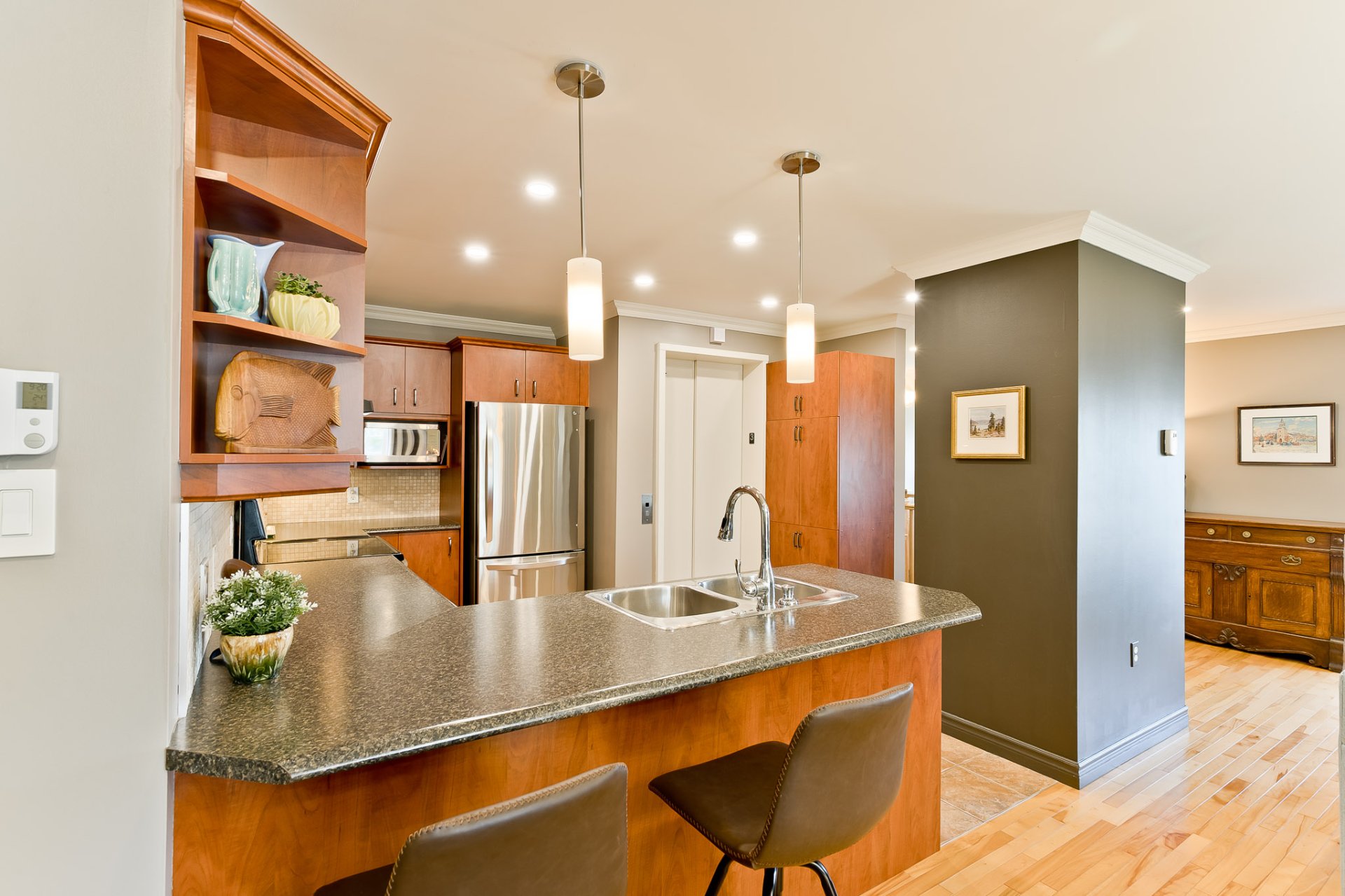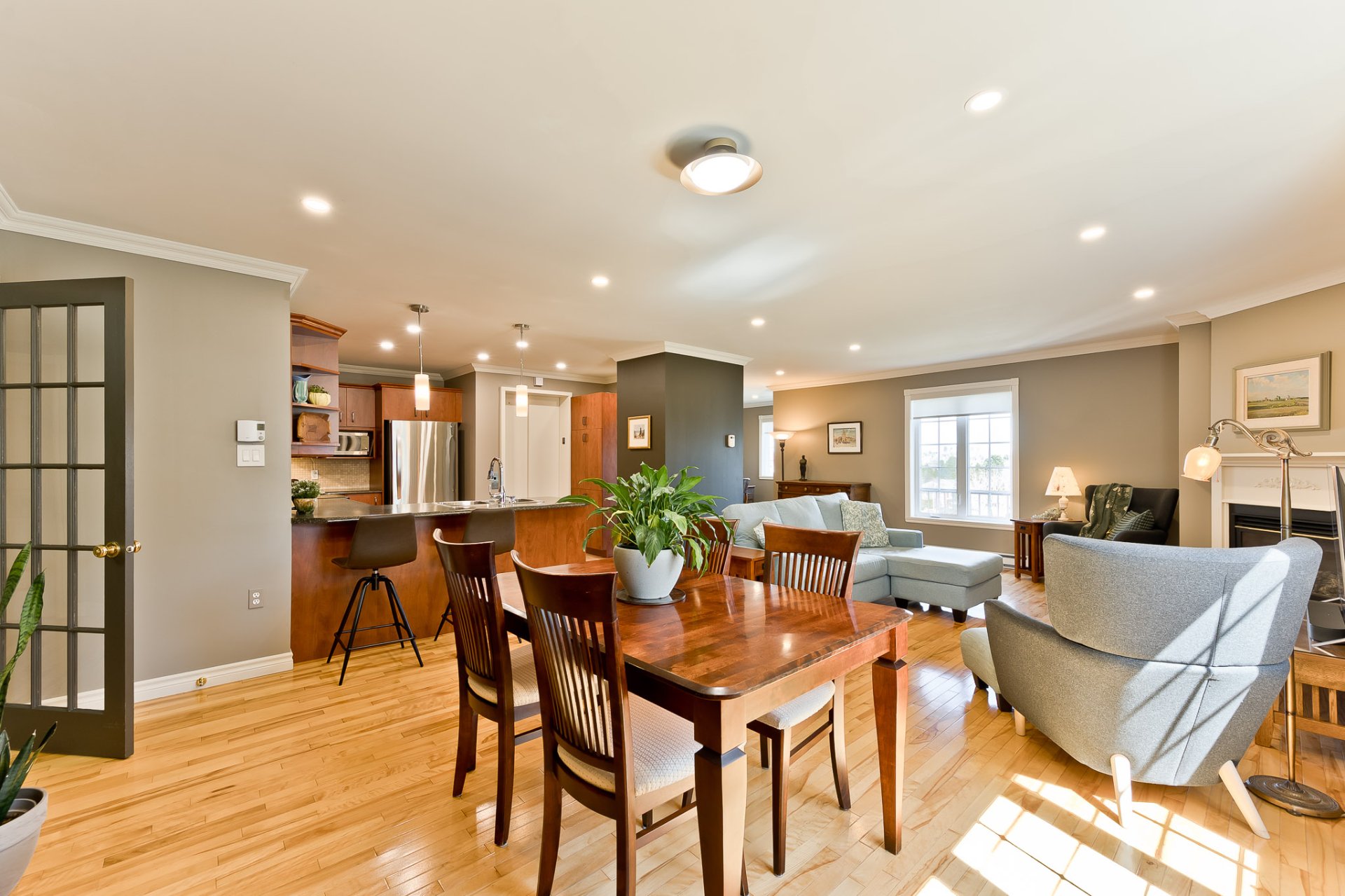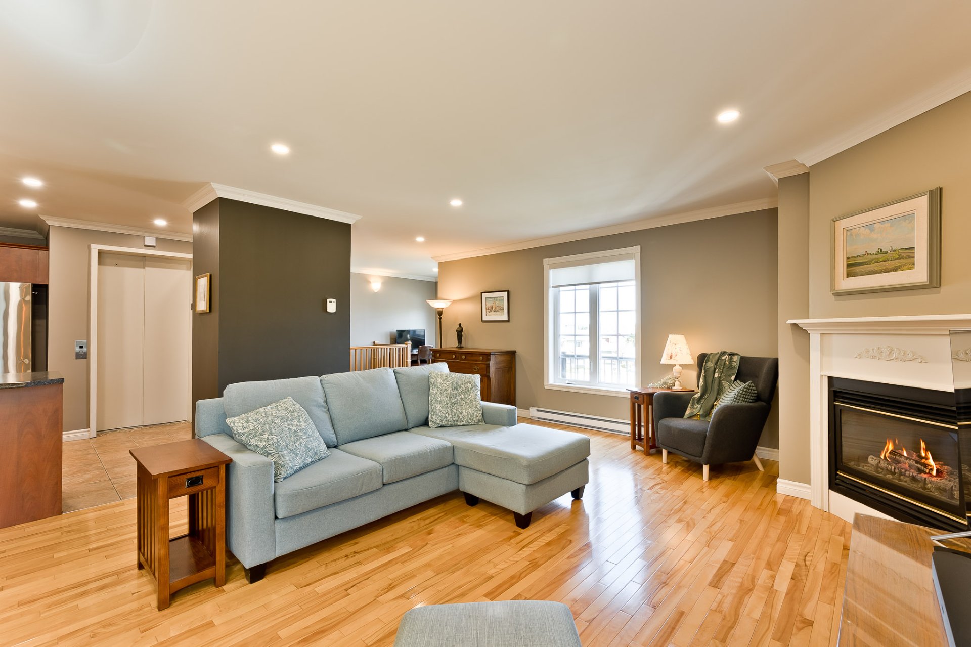 Exceptional south-facing condo unit! Located on the 3rd and top floor, you'll be delighted to have access to a semi-private elevator, eliminating the need to climb any stairs from the indoor garage to your condo--a dream come true! Inside, you'll find beautiful, bright, and airy rooms, hardwood and ceramic floors, a gas fireplace in the living room, two bedrooms, and a spacious bathroom with a glass shower. The master bedroom also features a walk-in closet and a west-facing balcony perfect for admiring stunning sunsets. The sought-after neighborhood, close to all amenities, is sure to charm you. A superb opportunity!