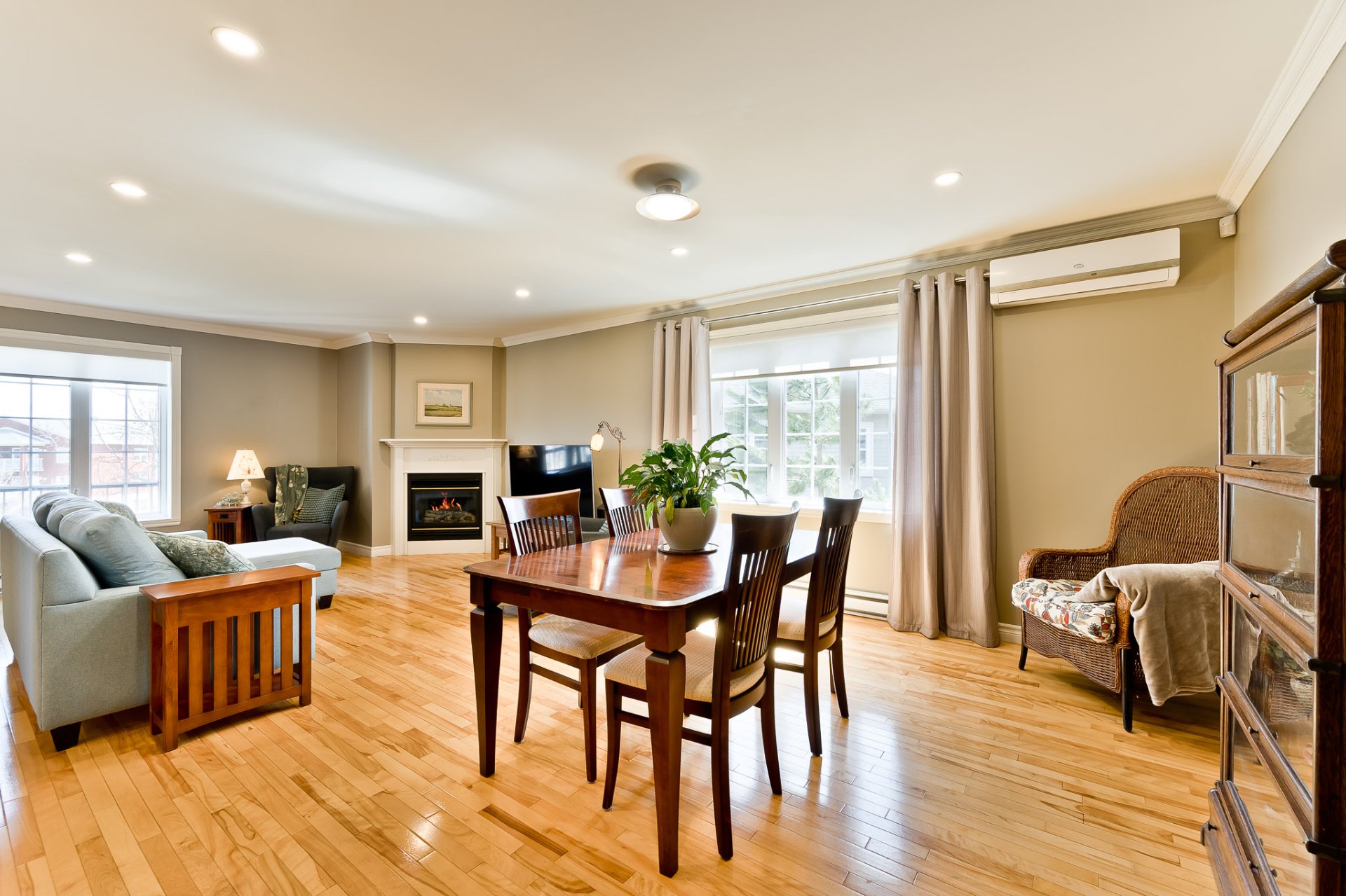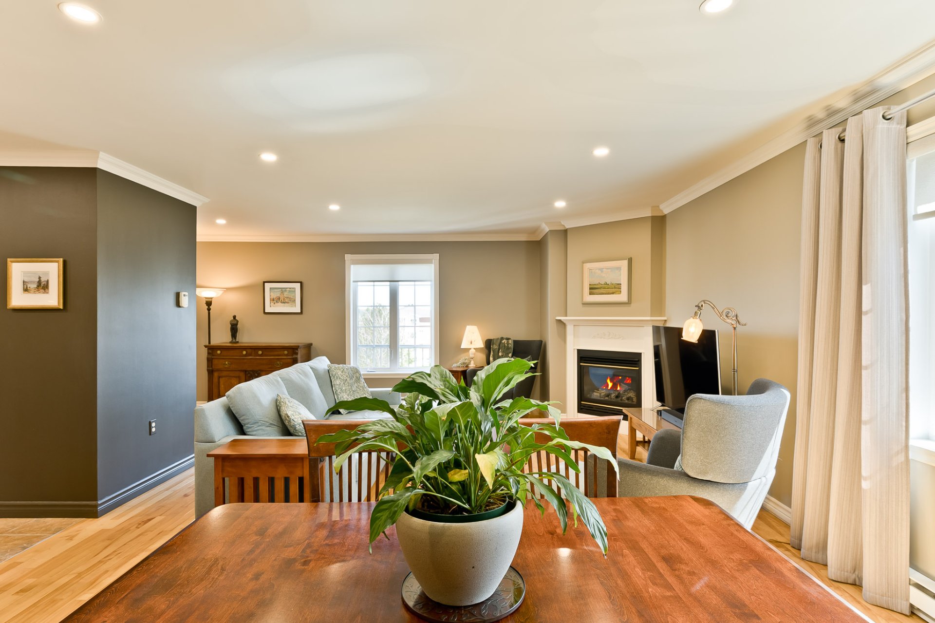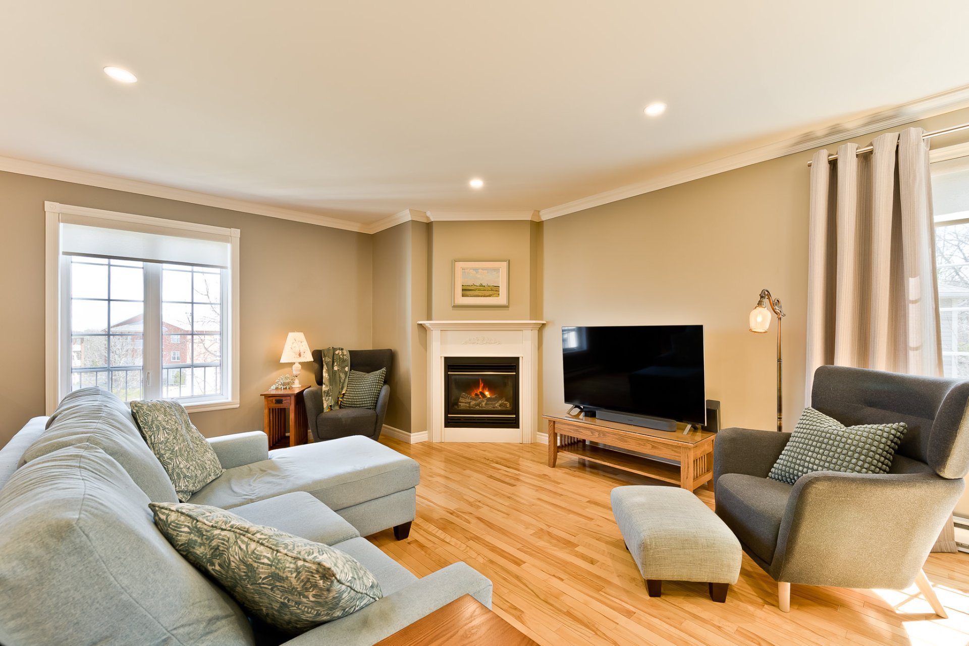 The warm and inviting living room features a gas fireplace