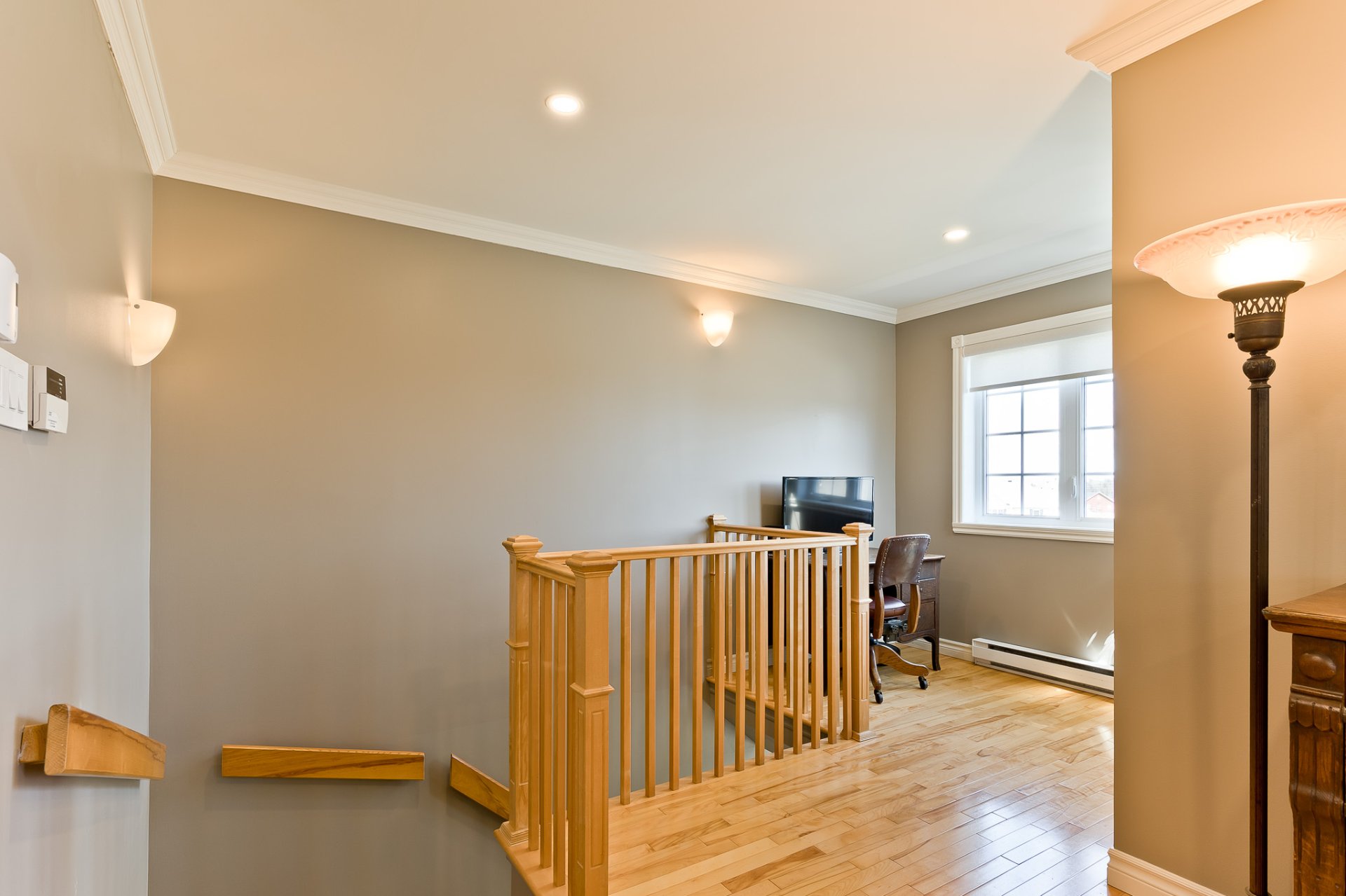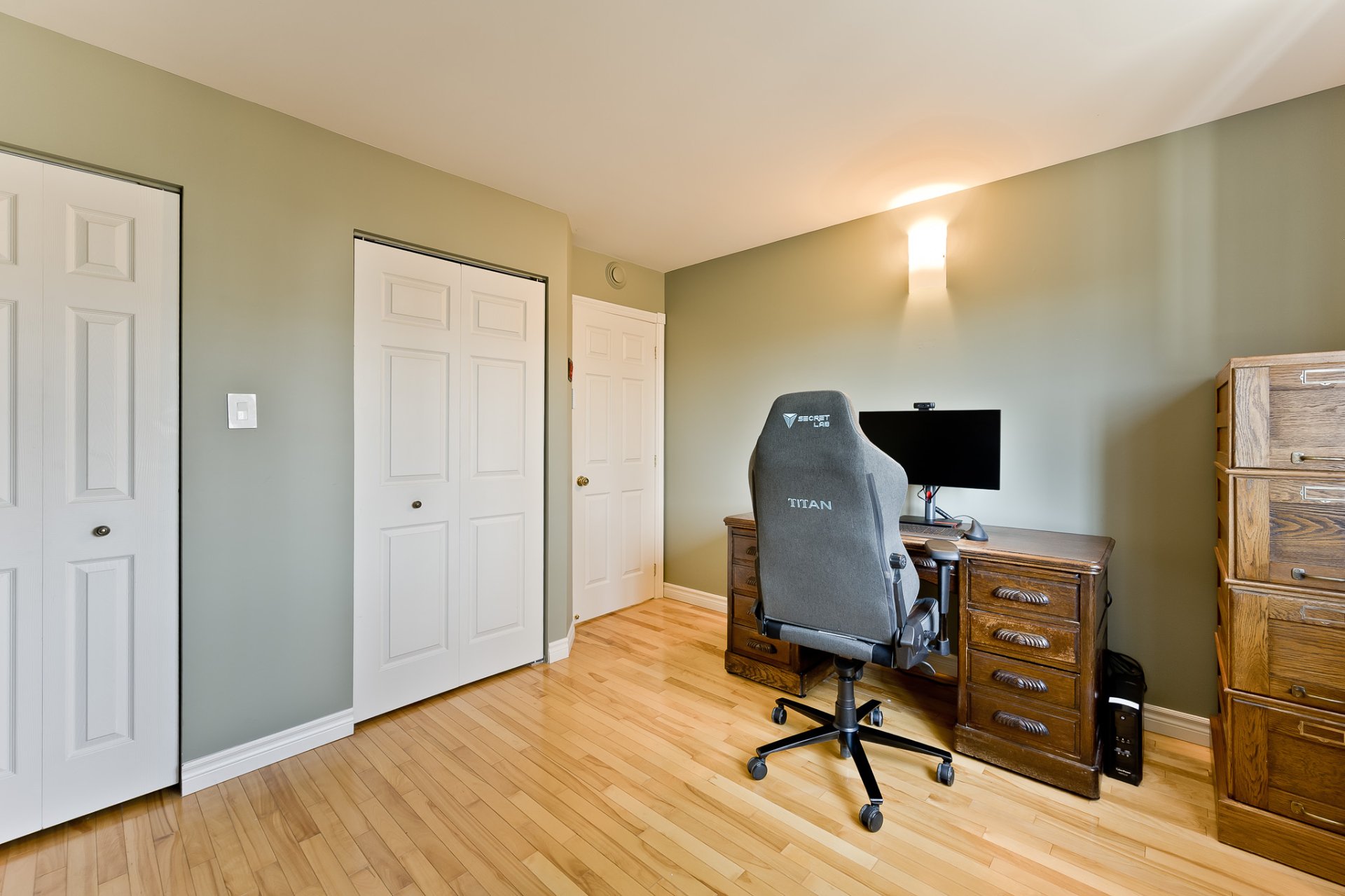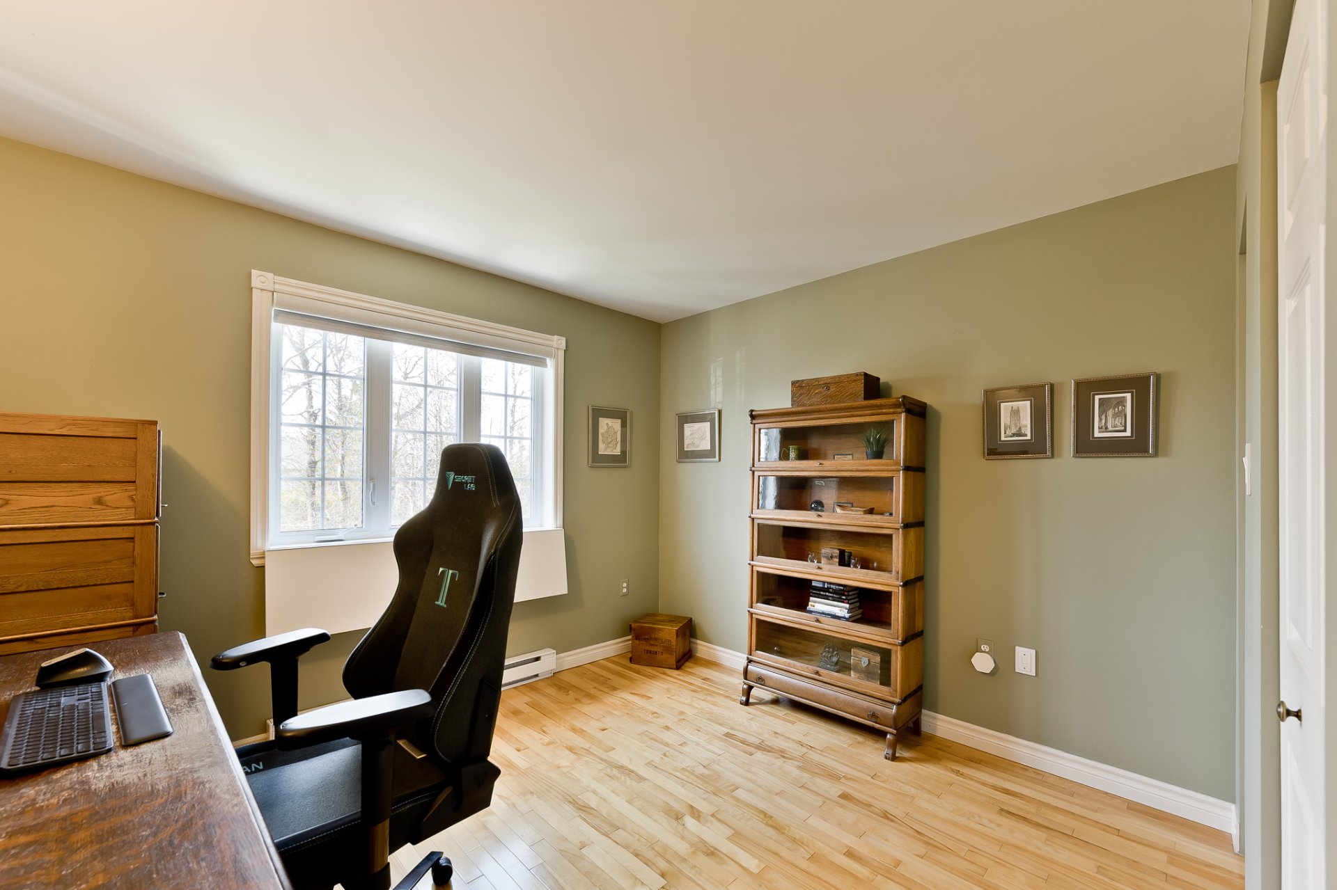 features a practical office space at the front near the