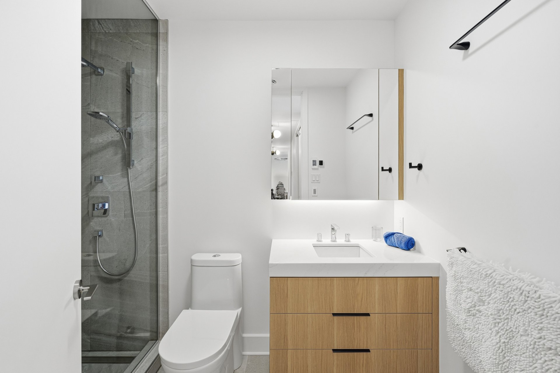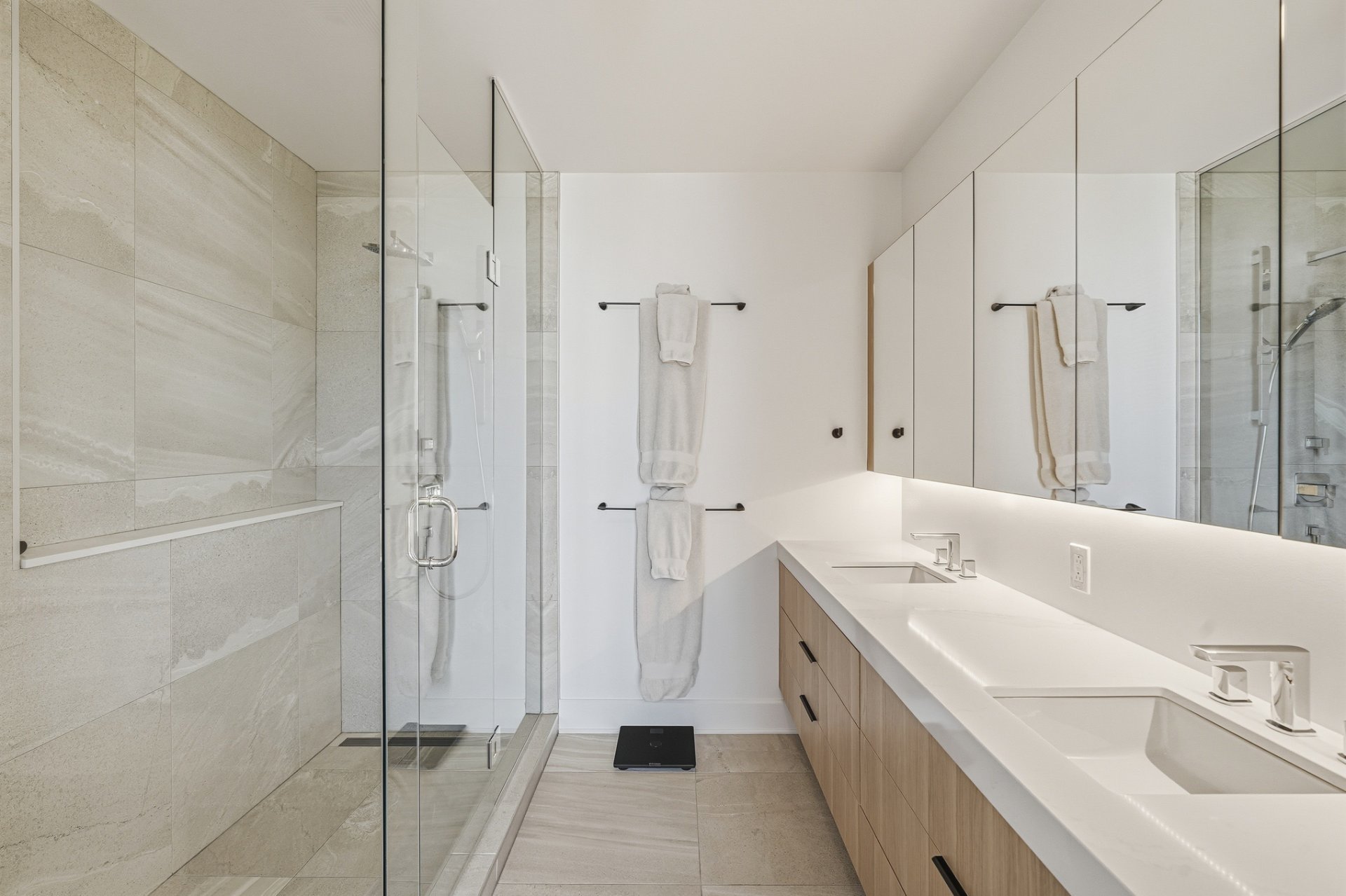 modern kitchen with built-in appliances, luxurious bathroom