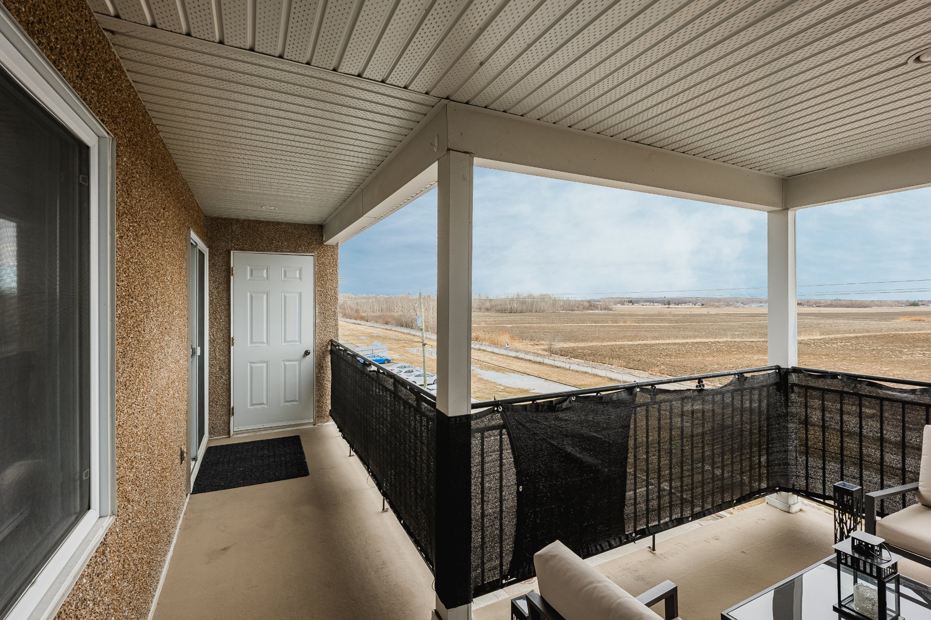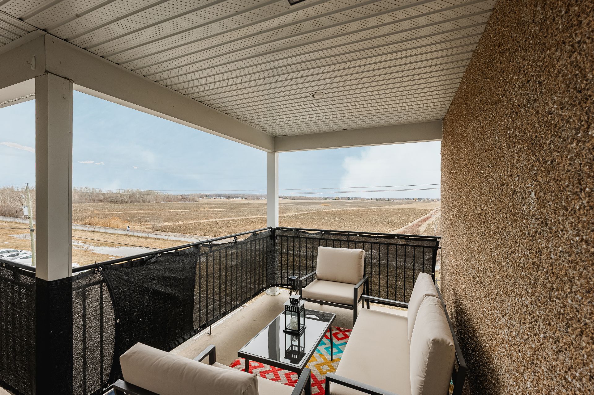 Immaculate top-floor 2 bed, 1 bath open-concept condo with a large private-use terrace and stunning unobstructed sunset views over open fields and mountain views-- no rear neighbours! Features include a large functional kitchen with island (with all major appliances included), a propane fireplace in the open concept living area, a convenient laundry closet, separate shower and tub, an additional large balcony off the living room, 2 side-by-side parking spots, and a storage room on the balcony for easy access. Quiet building close to schools, parks, and bike paths and more! Many inclusions!