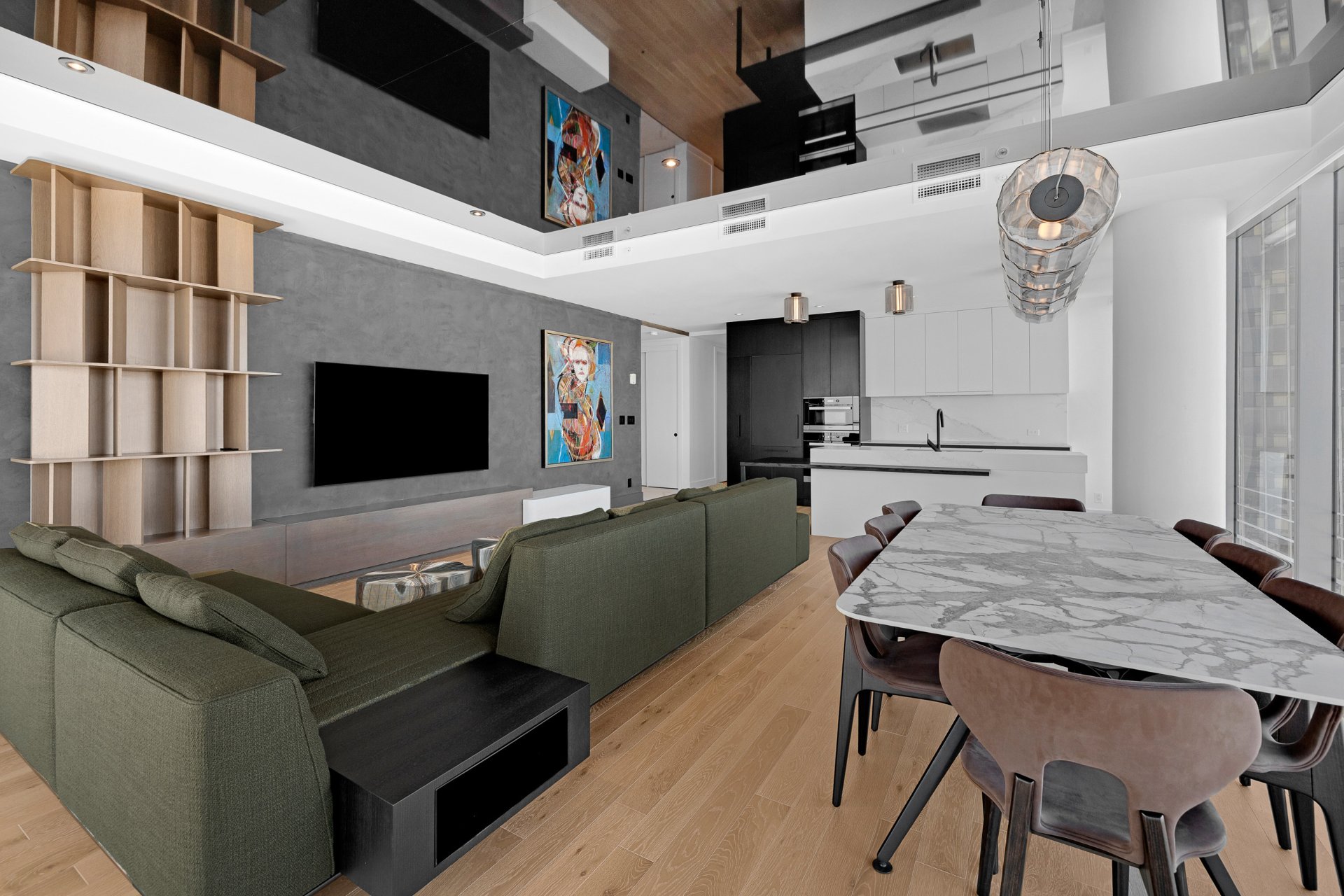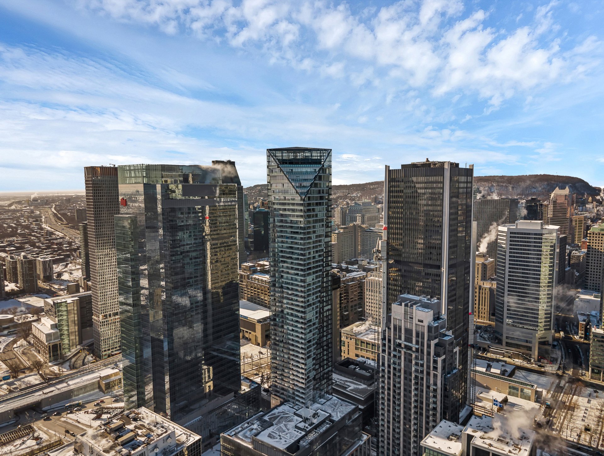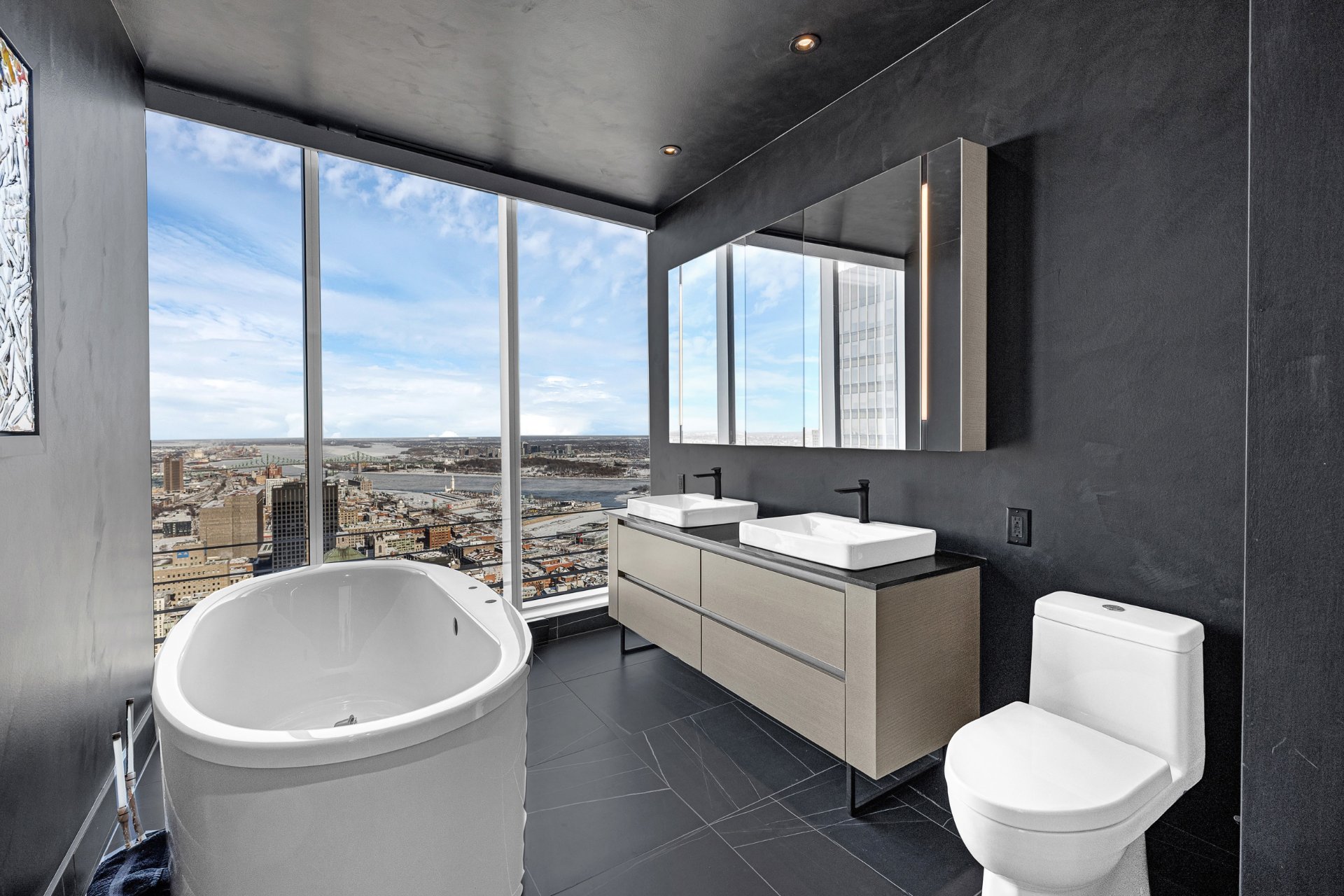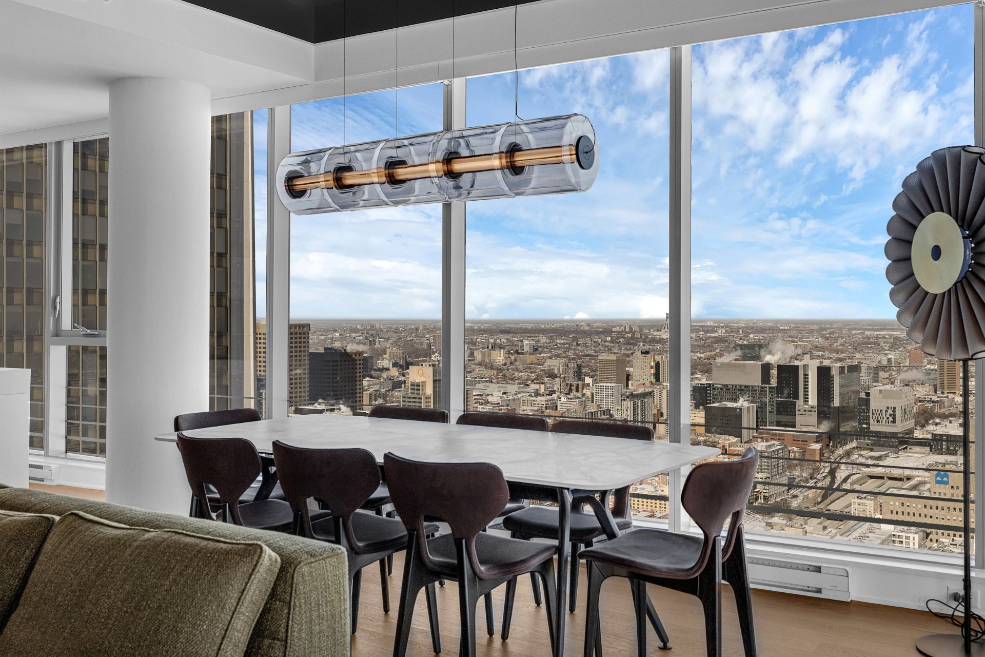 Spectacular corner penthouse at the reputable Victoria sur le Parc. This 2 bedroom, 2.5-bathroom unit offers breathtaking panoramic views from a 32-foot terrace, overlooking Montréal's most iconic landmarks, the Jacques-Cartier and Champlain bridges, the Old Port, and the St. Lawrence River. Floor-to-ceiling windows flood the space with natural light. Automatic blinds throughout provide comfort and privacy. The unit features high-end finishes and heated floors. Full-service building with 24/7 security and five-star hotel-style amenities. Includes two parking spaces and one storage locker. Option to purchase fully furnished, as shown.