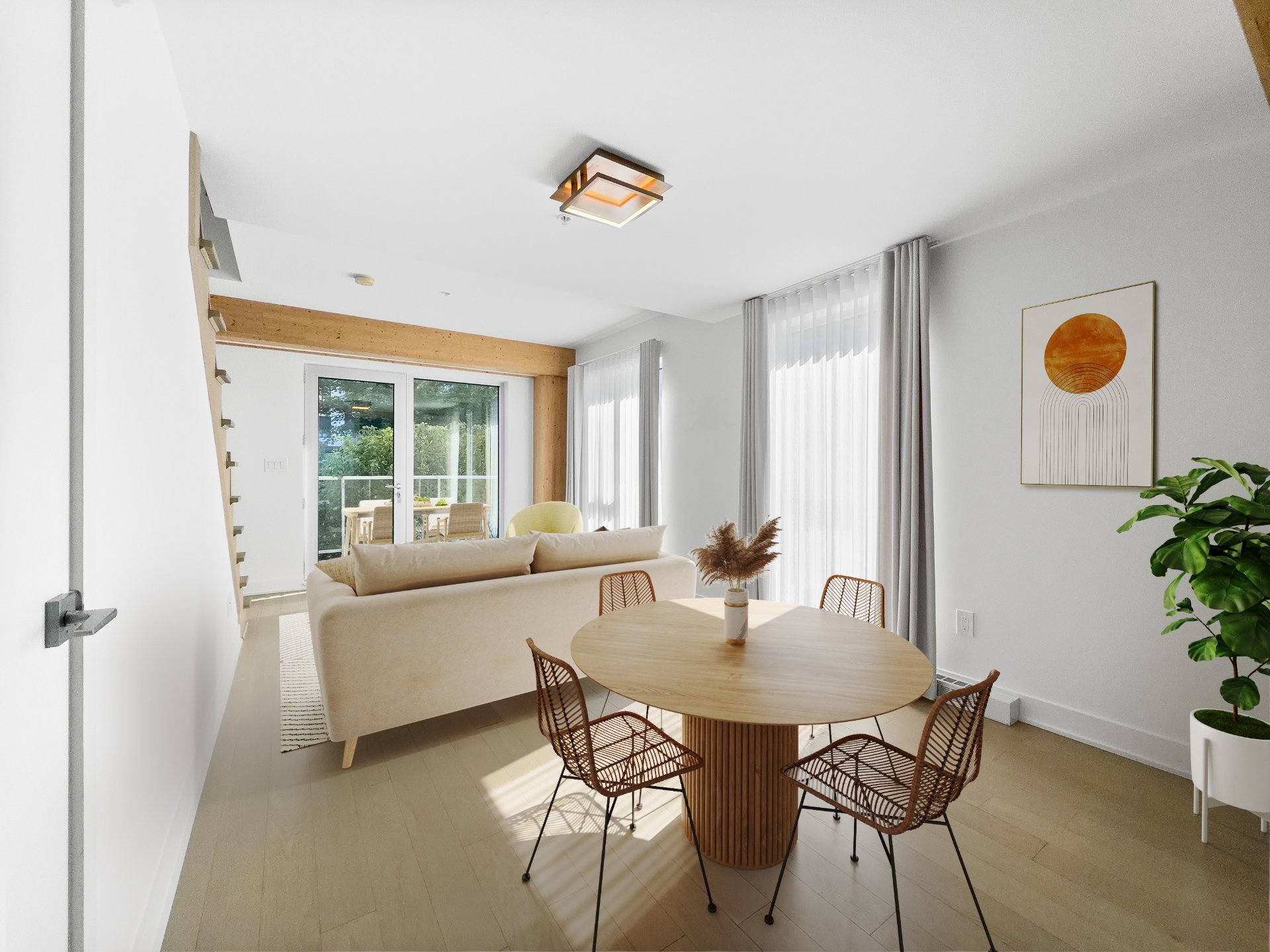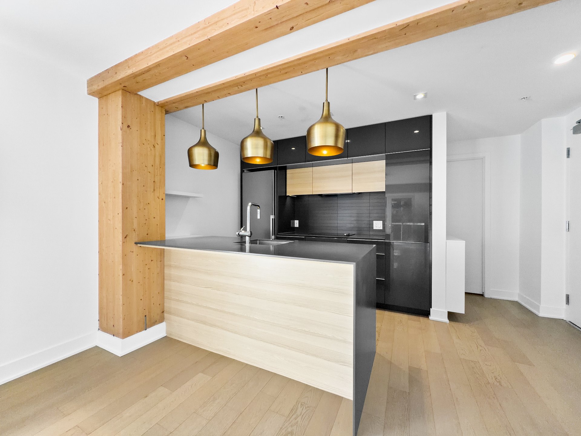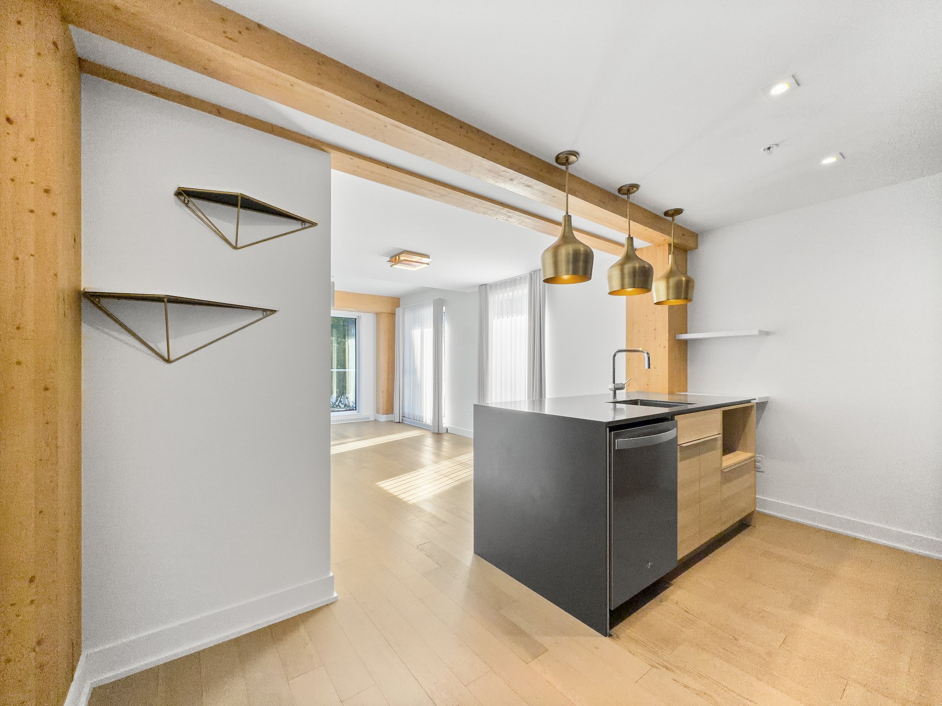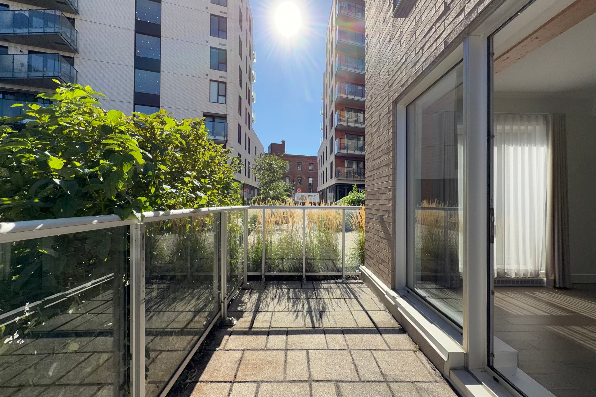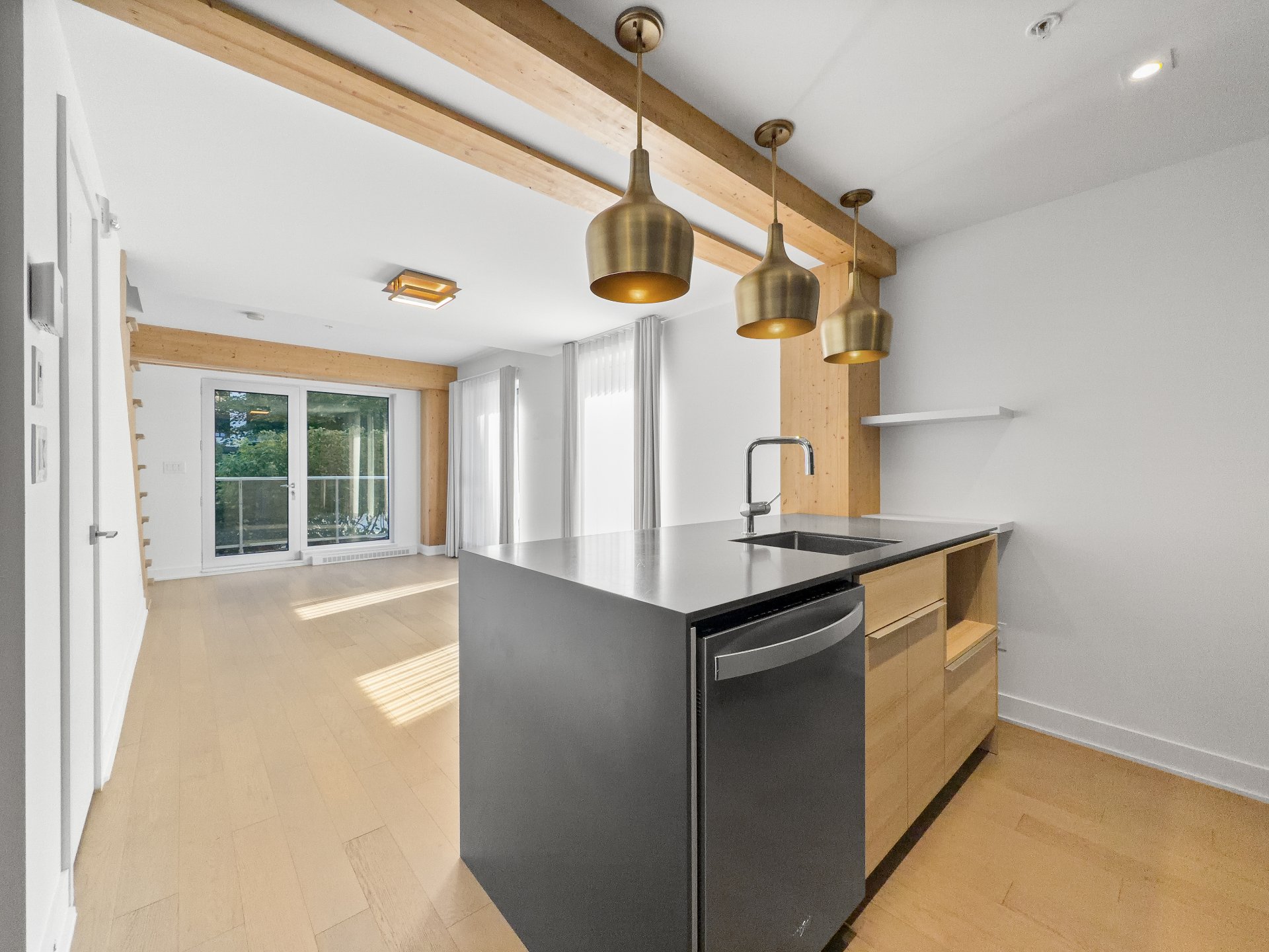 Over two bright floors, this rare corner townhouse in the LEED Arbora 2 project offers a unit with natural design, ecological awareness, and contemporary elegance. The solid wood beams, refined Corian kitchen, and large south-facing windows create a serene and inspiring atmosphere. The private patio opens onto a landscaped courtyard -- a green haven in the vibrant heart of Griffintown. Two bedrooms, two bathrooms, a powder room, storage space, and indoor parking complete the package. The building also offers an outdoor pool, gym, and dog wash station. Come visit while it's still avail