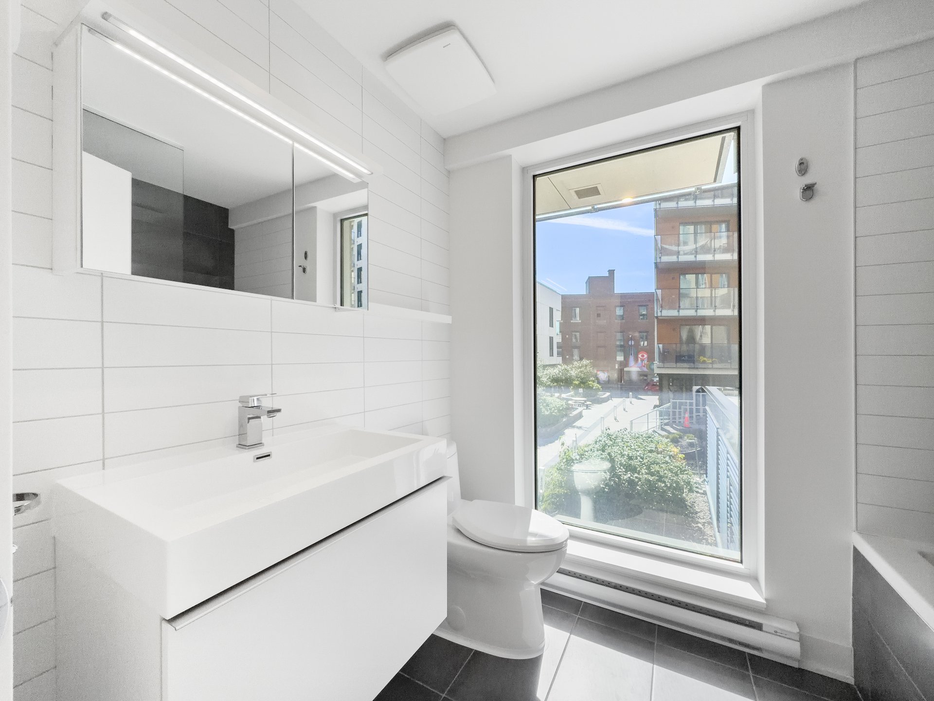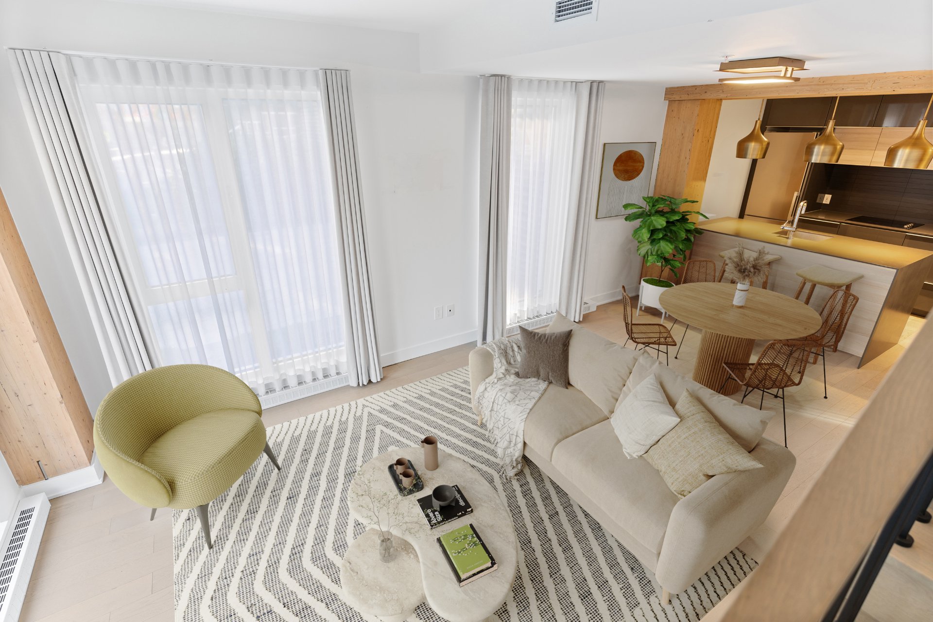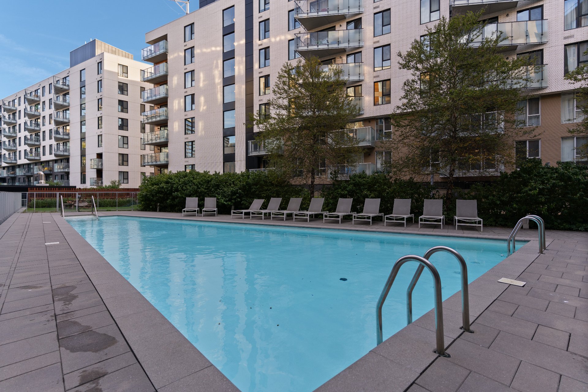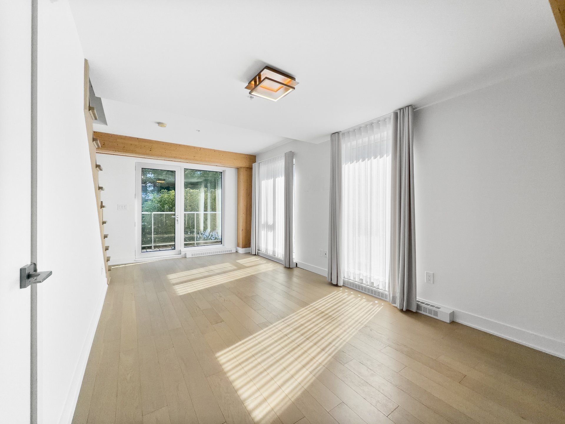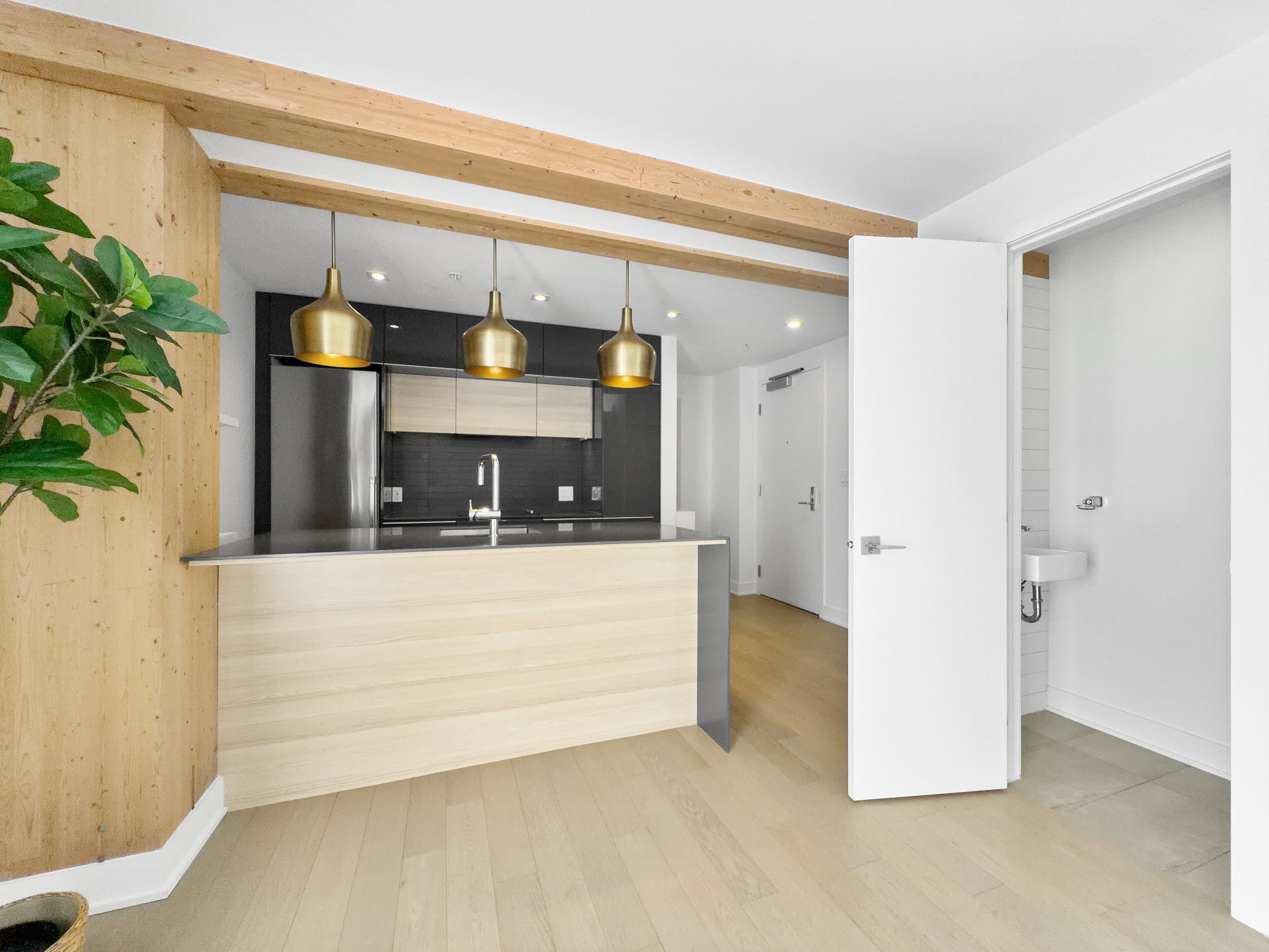 Over two bright floors, this rare corner townhouse in the LEED Arbora 2 project offers a unit with natural design, ecological awareness, and contemporary elegance. The solid wood beams, refined Corian kitchen, and large south-facing windows create a serene and inspiring atmosphere. The private patio opens onto a landscaped courtyard -- a green haven in the vibrant heart of Griffintown. Two bedrooms, two bathrooms, a powder room, storage space, and indoor parking complete the package. The building also offers an outdoor pool, gym, and dog wash station. Come visit while it's still avail