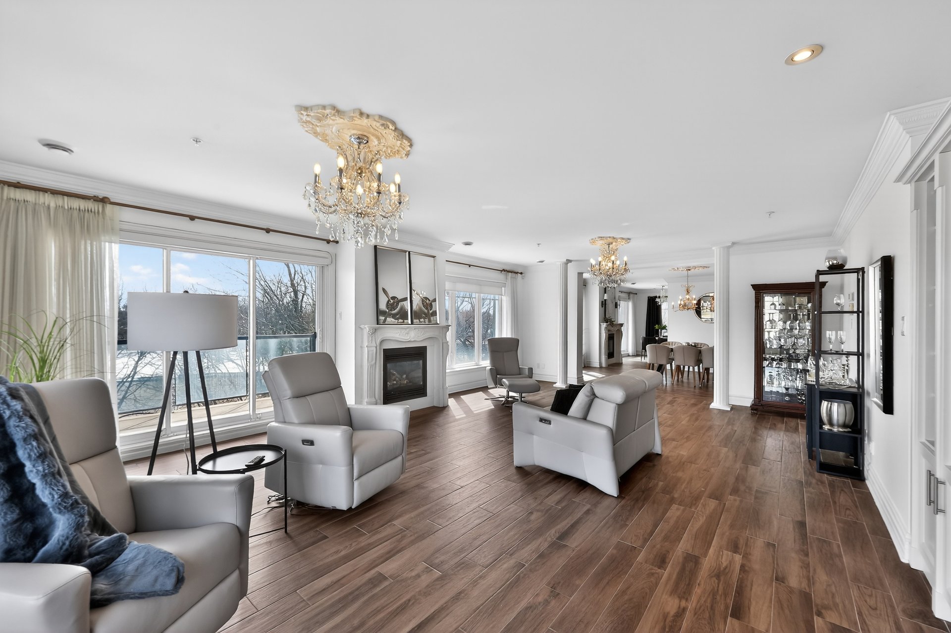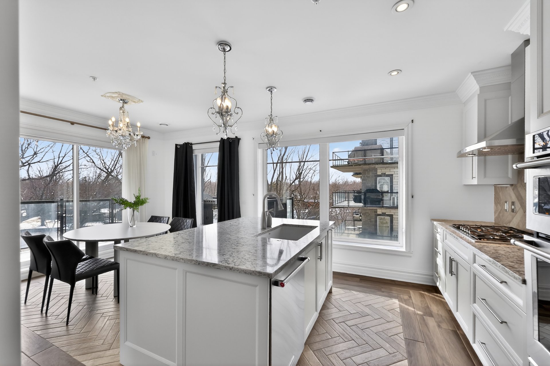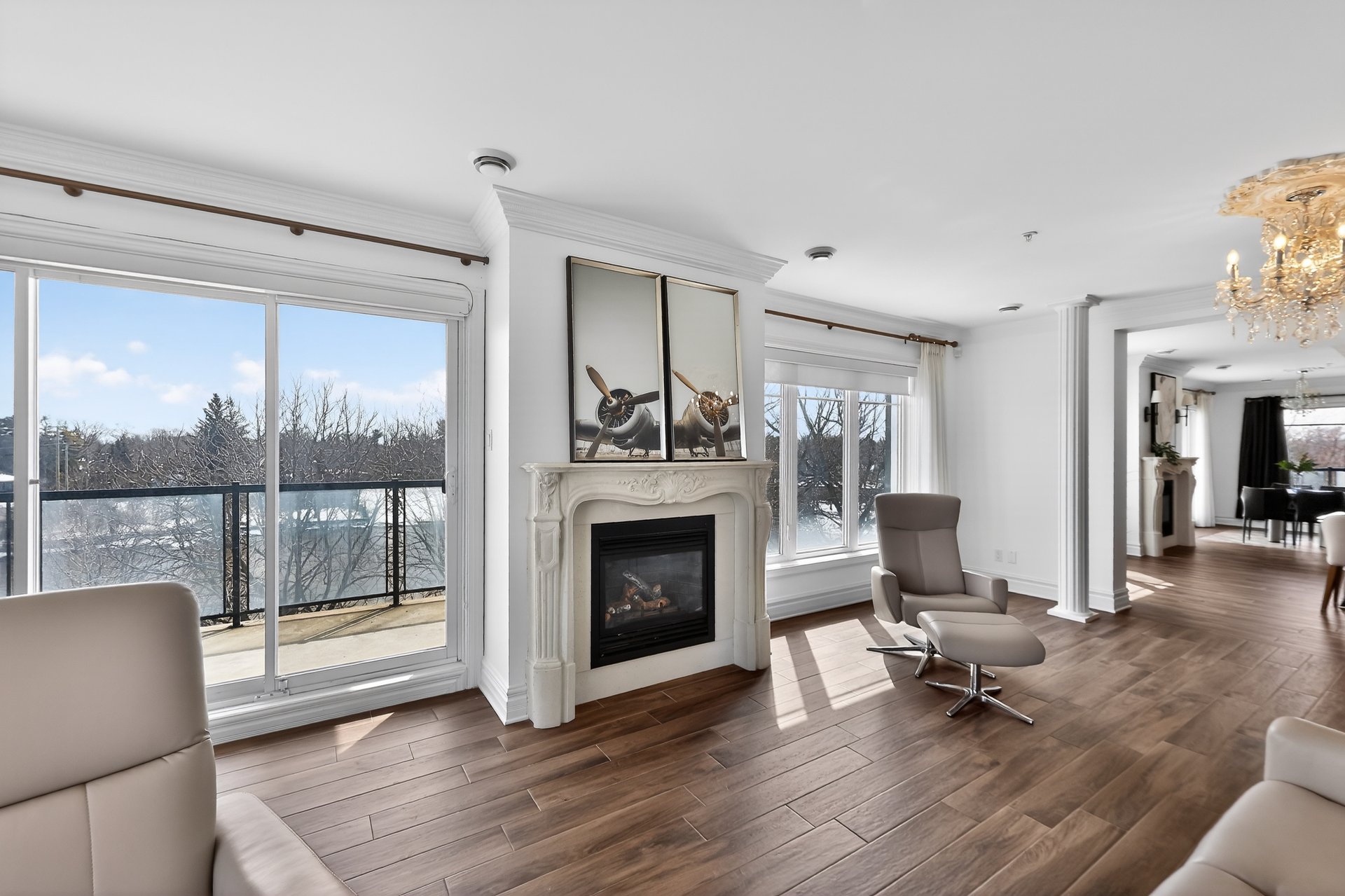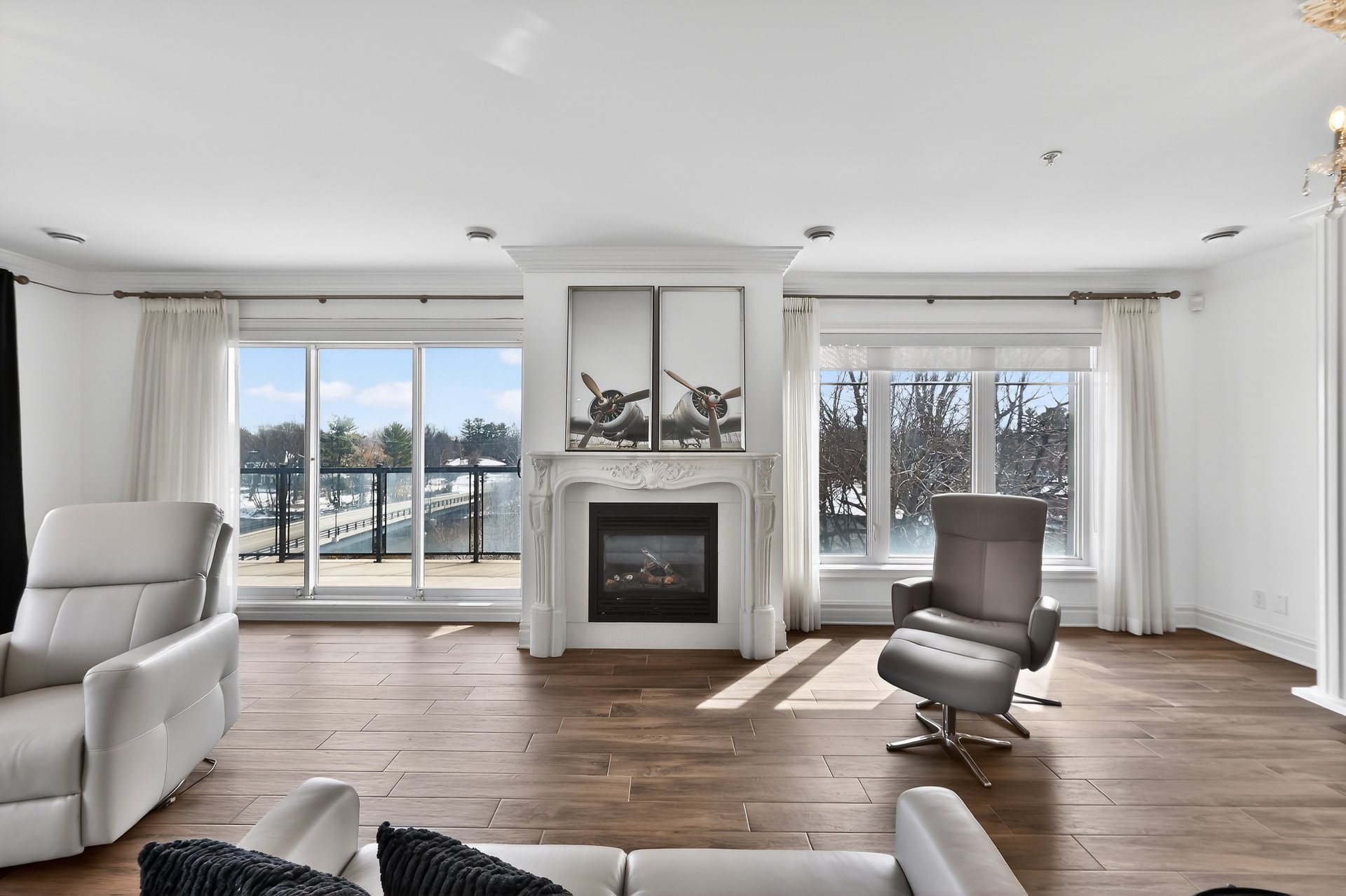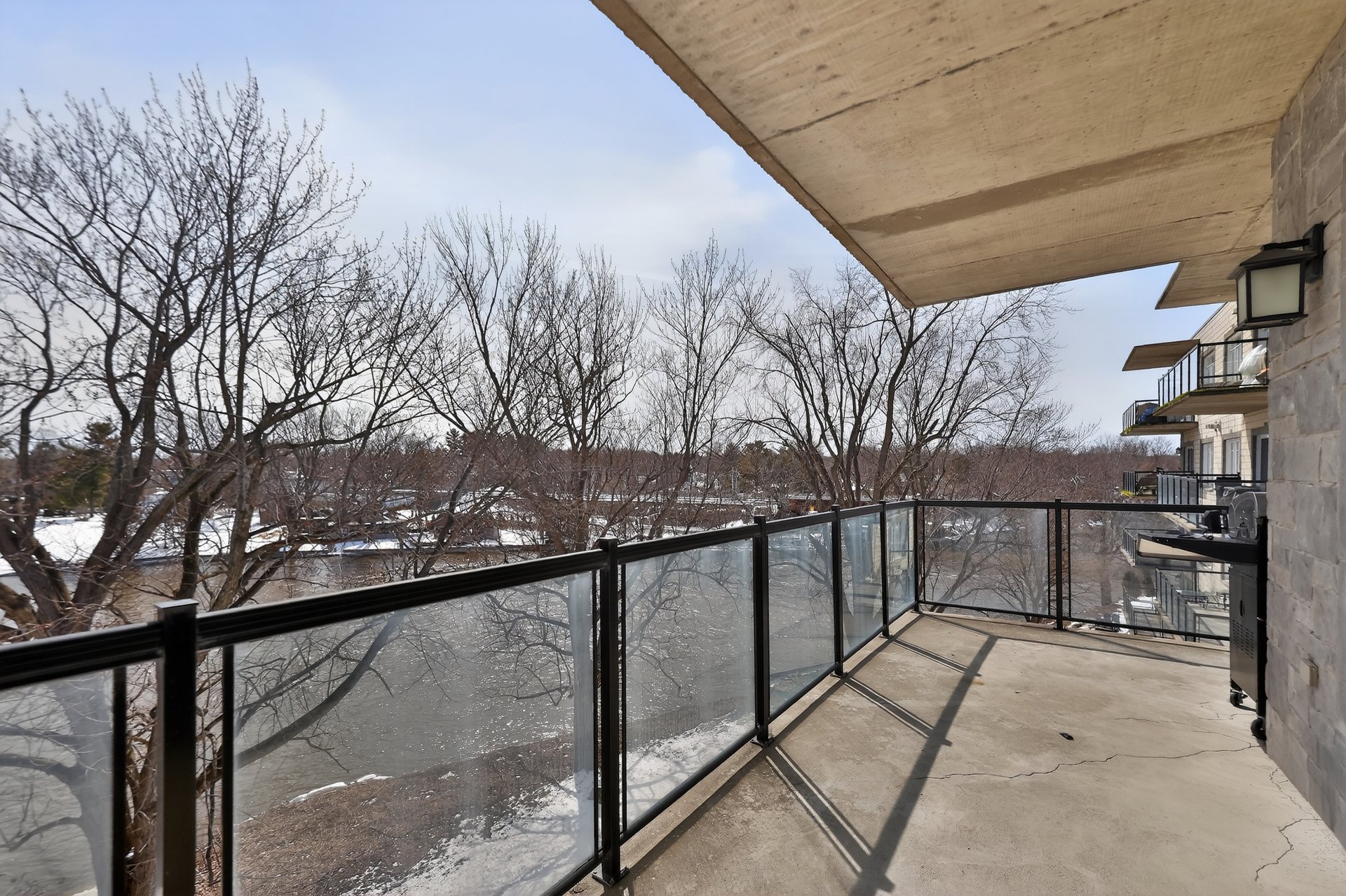 Boasting an exceptional location along the Rivière des Prairies, this 4th-floor condo offers breathtaking views and remarkable natural light thanks to its abundant windows. Spacious living area with an open-concept living and dining room, a gas fireplace, and access to the balcony. Modern kitchen with quartz countertops and a large island. Includes 3 bedrooms, 2 full bathrooms, and 1 half-bath. Master bedroom with walk-in closet. Two large corner balconies, central air conditioning, gas heating, BBQ outlet, 2 garages, 2 storage units, and a shared rooftop terrace.