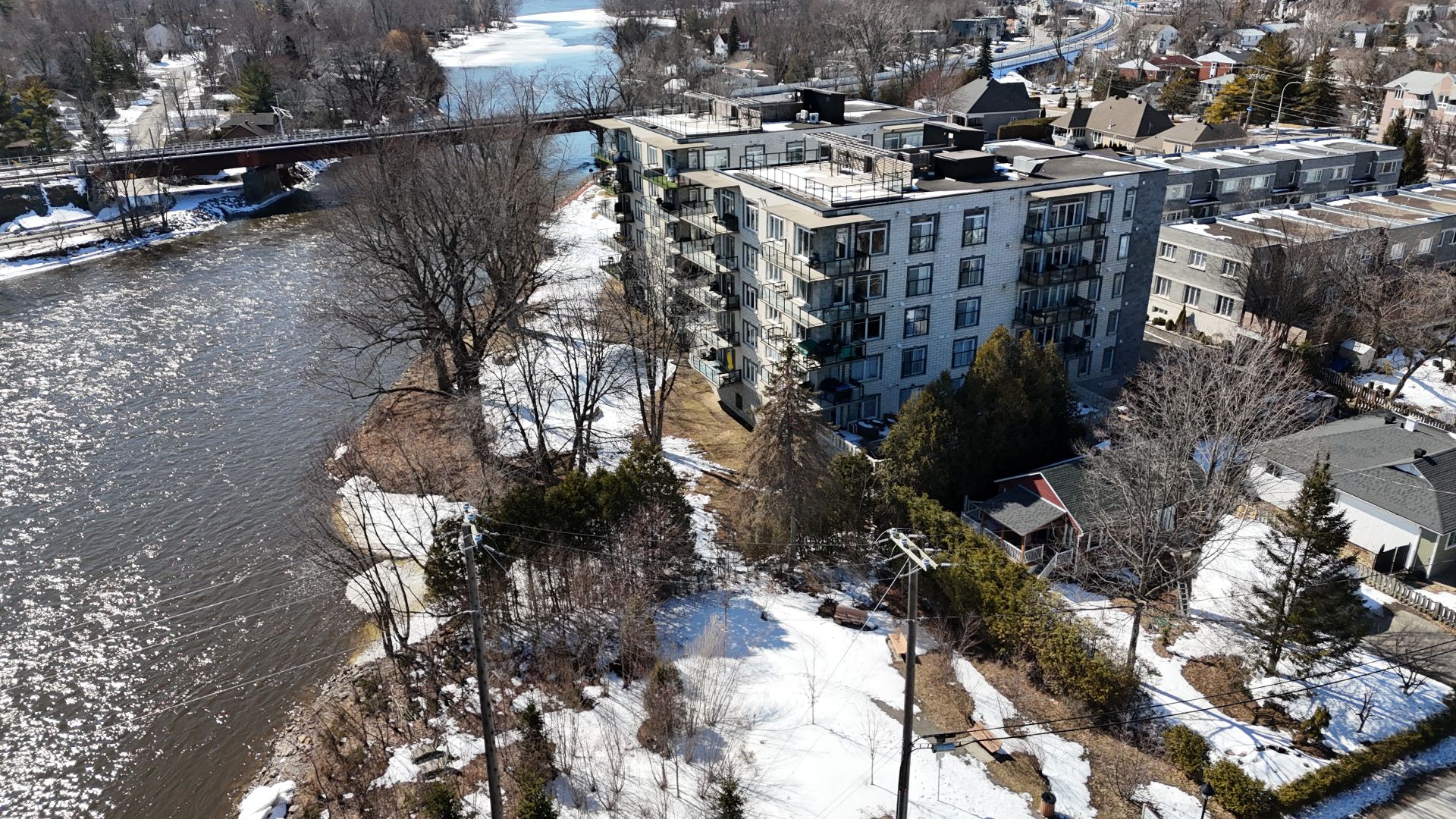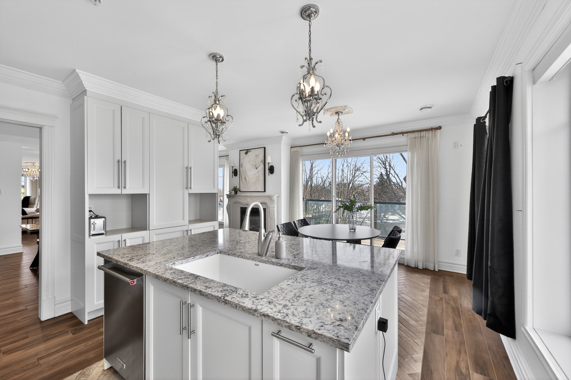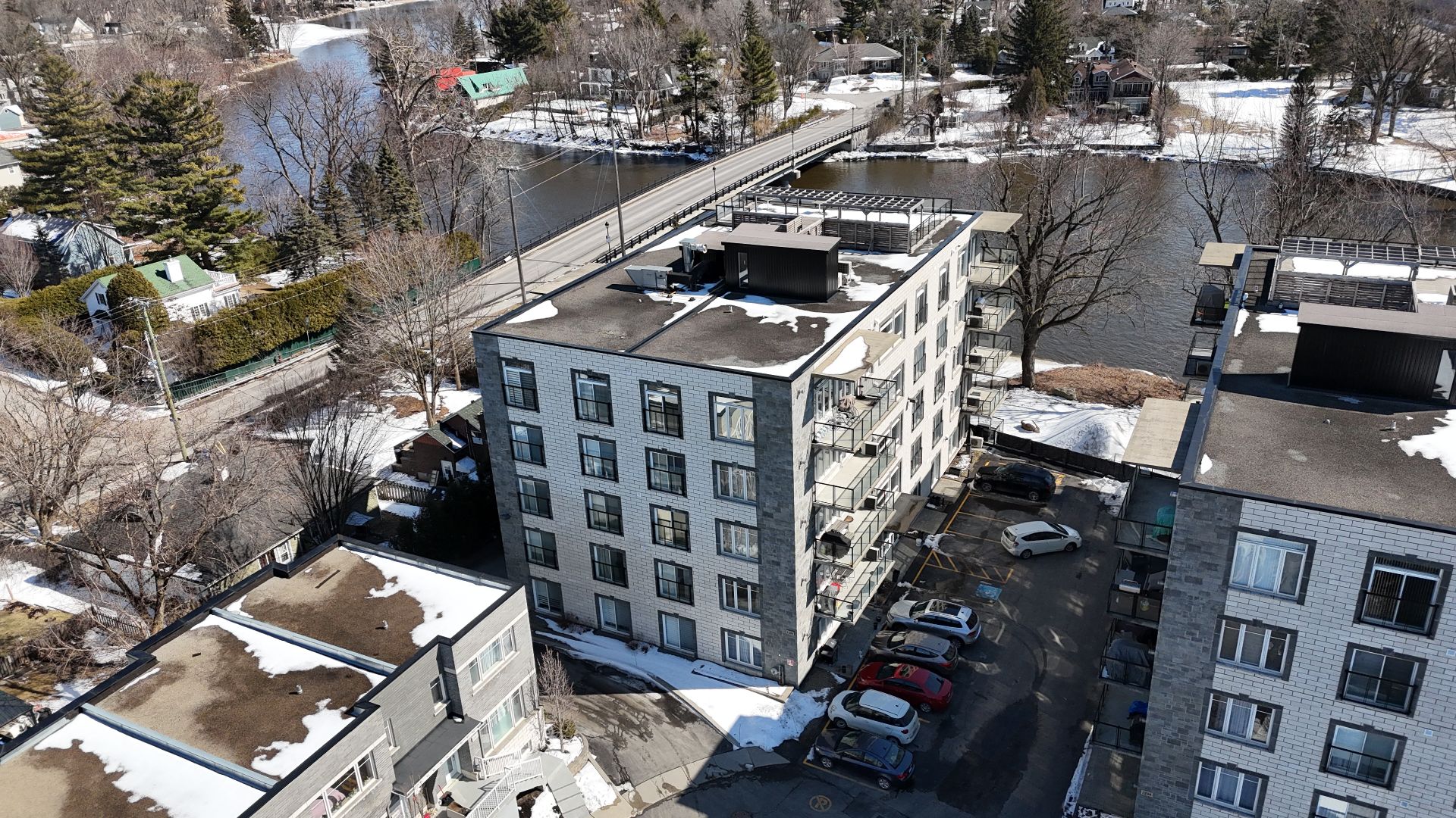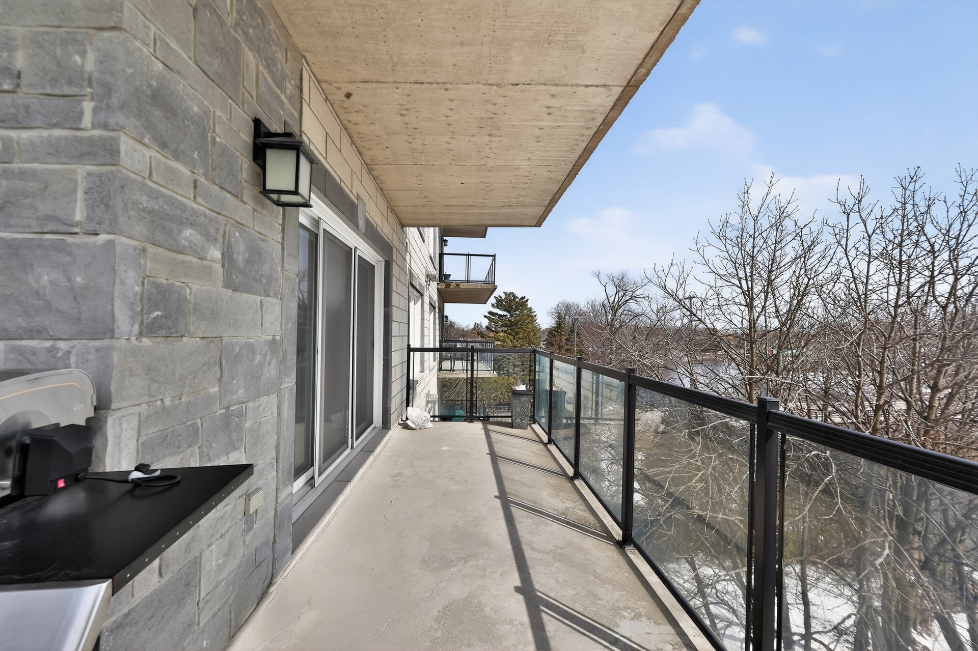 Boasting an exceptional location along the Rivière des Prairies, this 4th-floor condo offers breathtaking views and remarkable natural light thanks to its abundant windows. Spacious living area with an open-concept living and dining room, a gas fireplace, and access to the balcony. Modern kitchen with quartz countertops and a large island. Includes 3 bedrooms, 2 full bathrooms, and 1 half-bath. Master bedroom with walk-in closet. Two large corner balconies, central air conditioning, gas heating, BBQ outlet, 2 garages, 2 storage units, and a shared rooftop terrace.