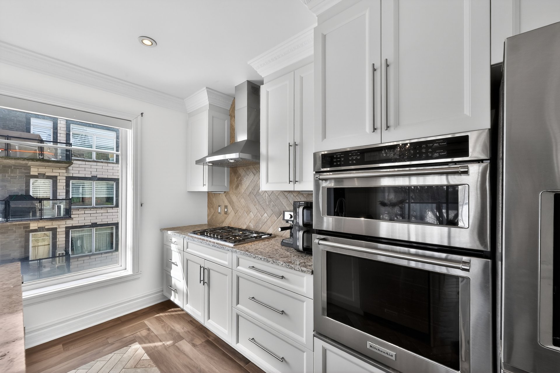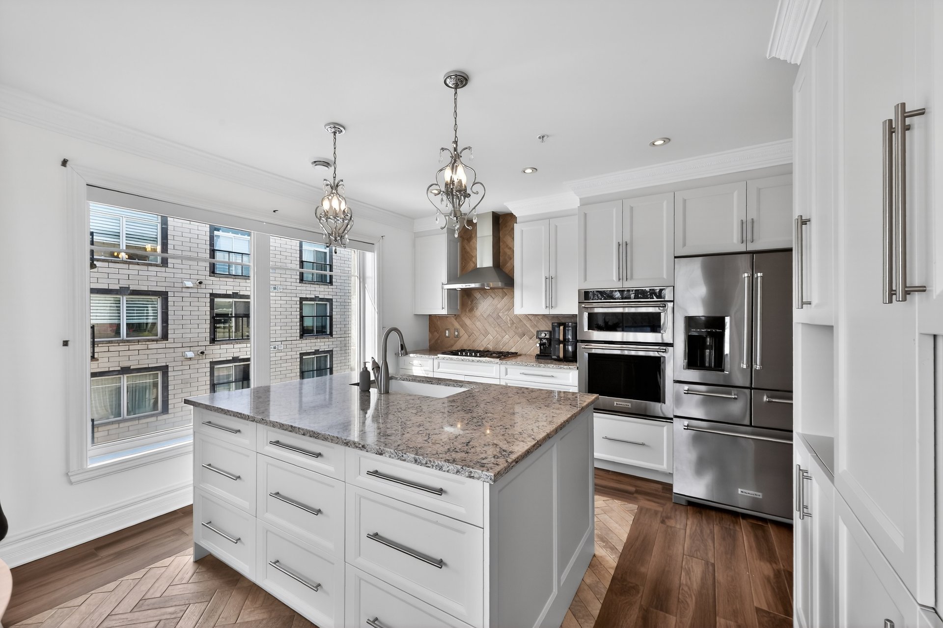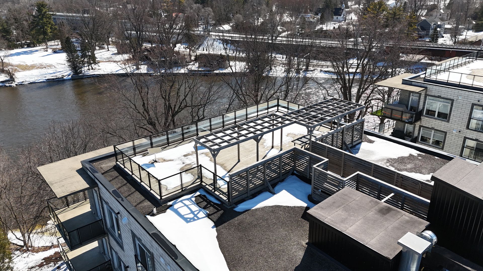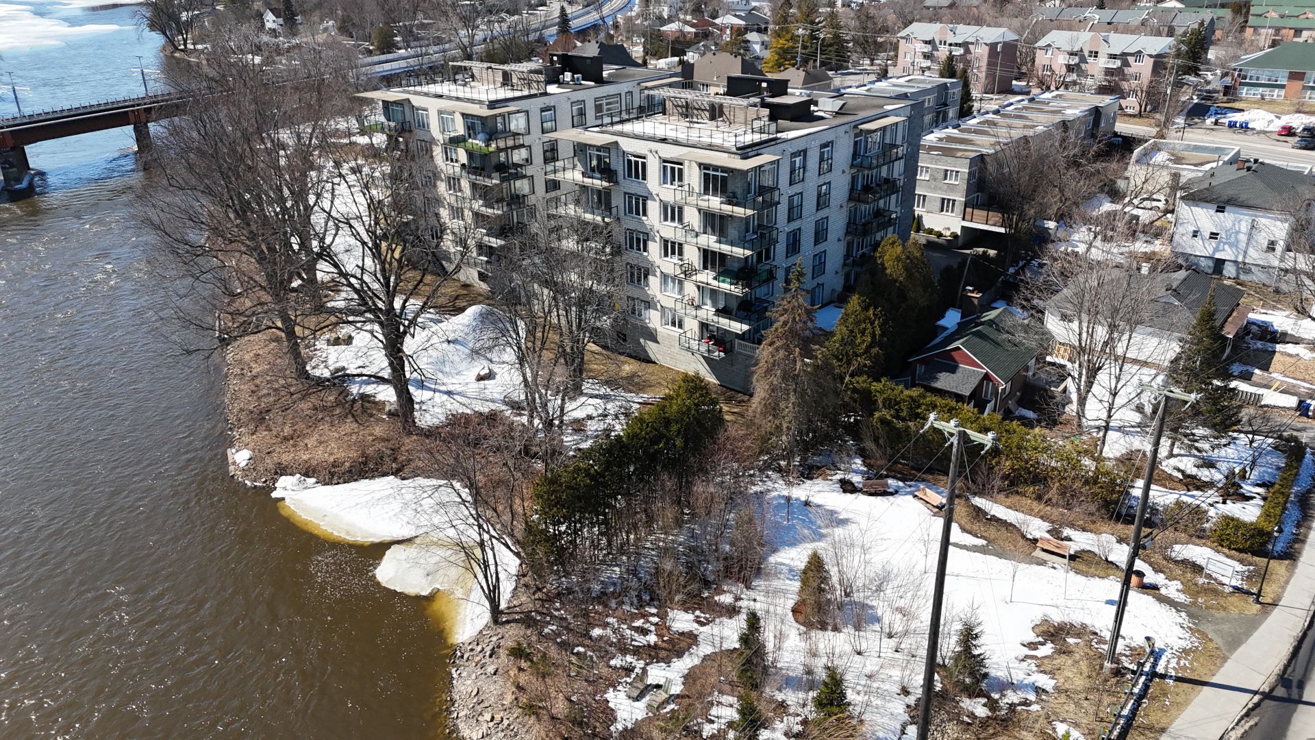 Boasting an exceptional location along the Rivière des Prairies, this 4th-floor condo offers breathtaking views and remarkable natural light thanks to its abundant windows. Spacious living area with an open-concept living and dining room, a gas fireplace, and access to the balcony. Modern kitchen with quartz countertops and a large island. Includes 3 bedrooms, 2 full bathrooms, and 1 half-bath. Master bedroom with walk-in closet. Two large corner balconies, central air conditioning, gas heating, BBQ outlet, 2 garages, 2 storage units, and a shared rooftop terrace.
