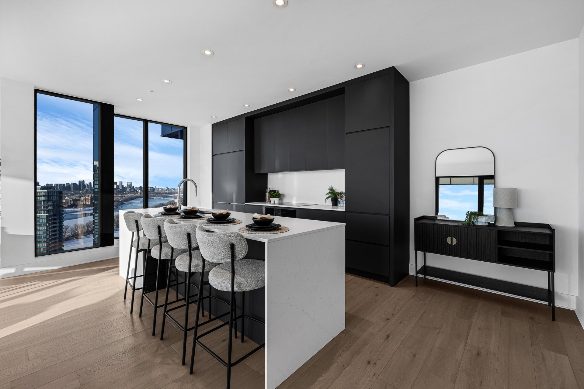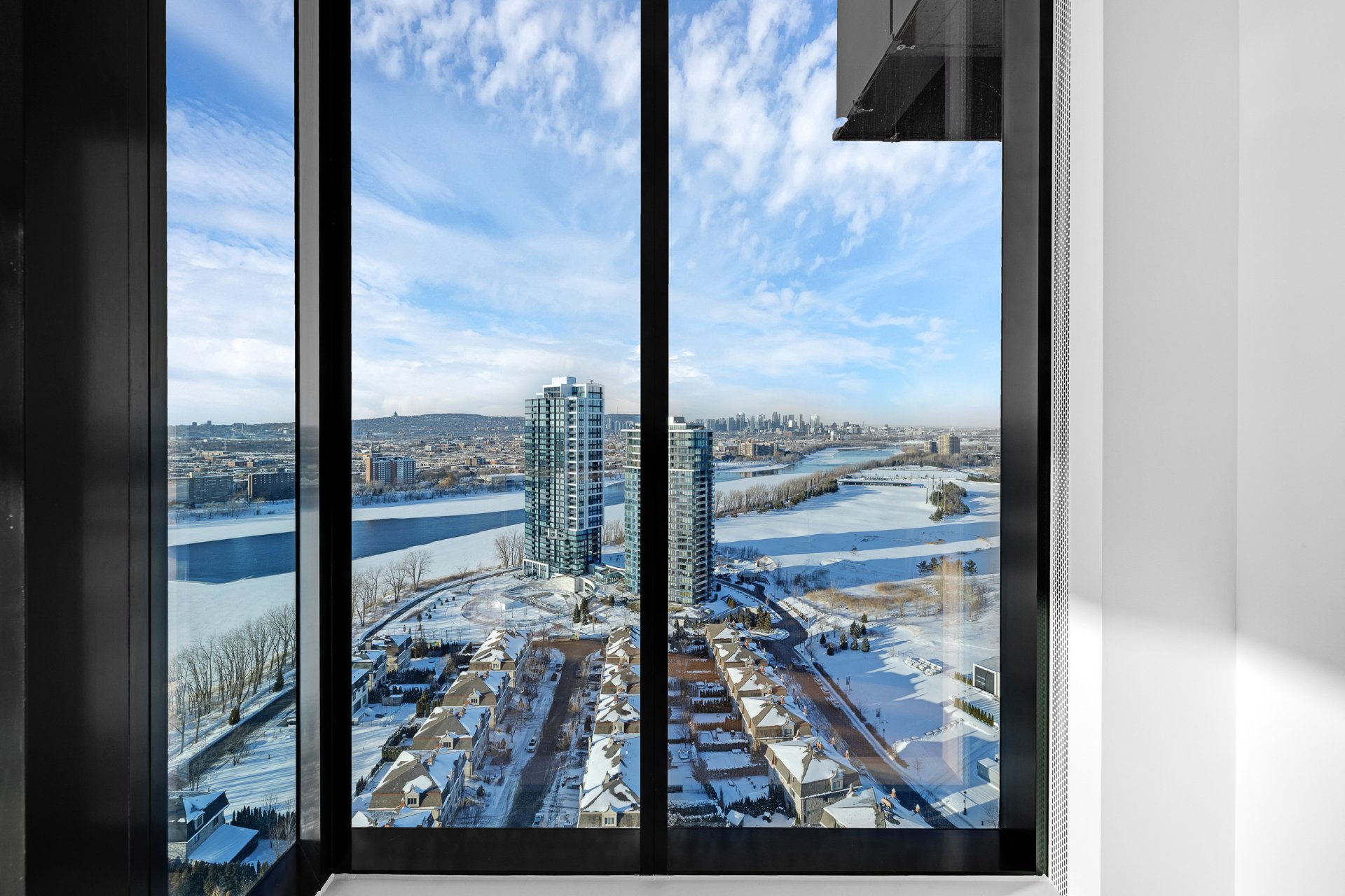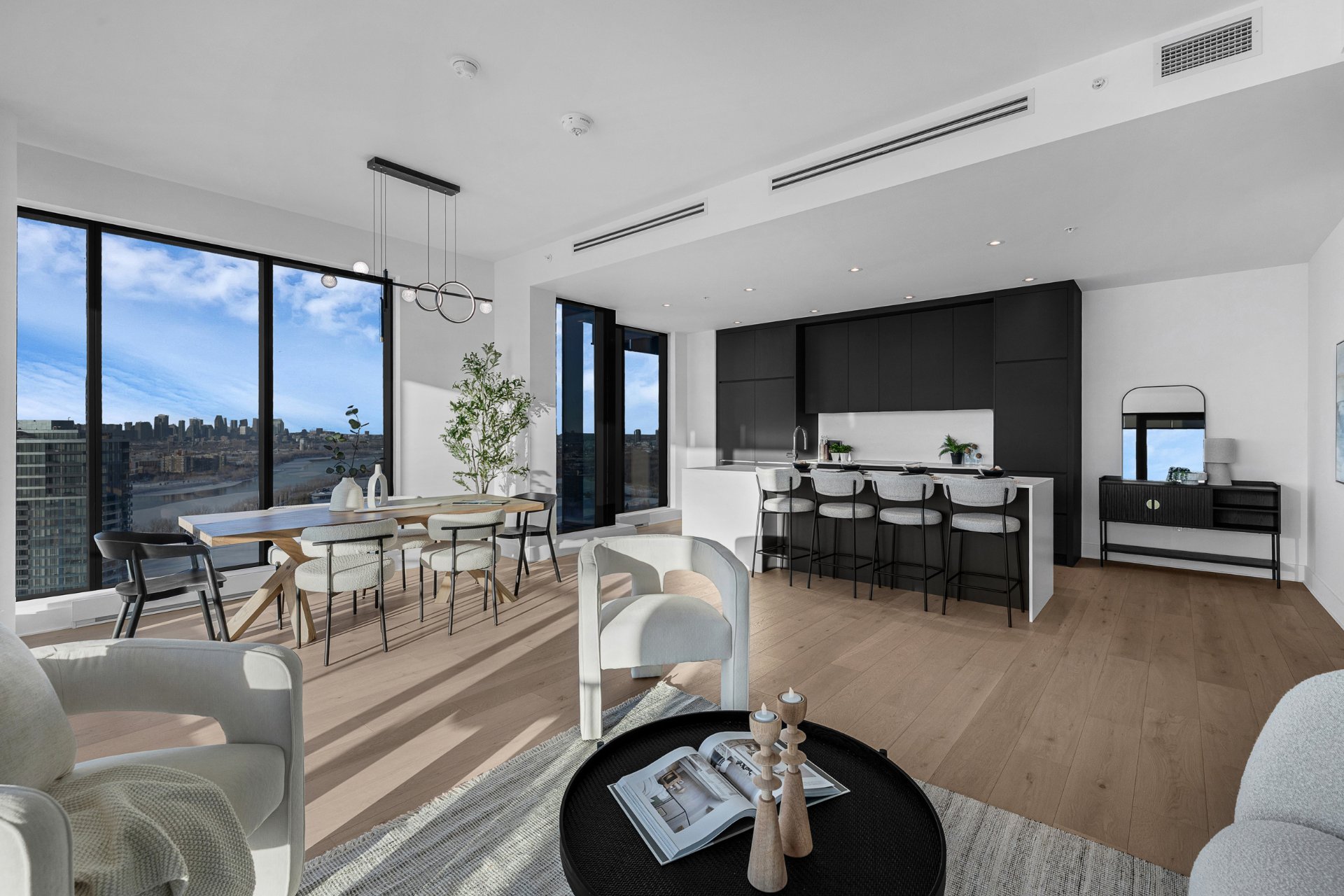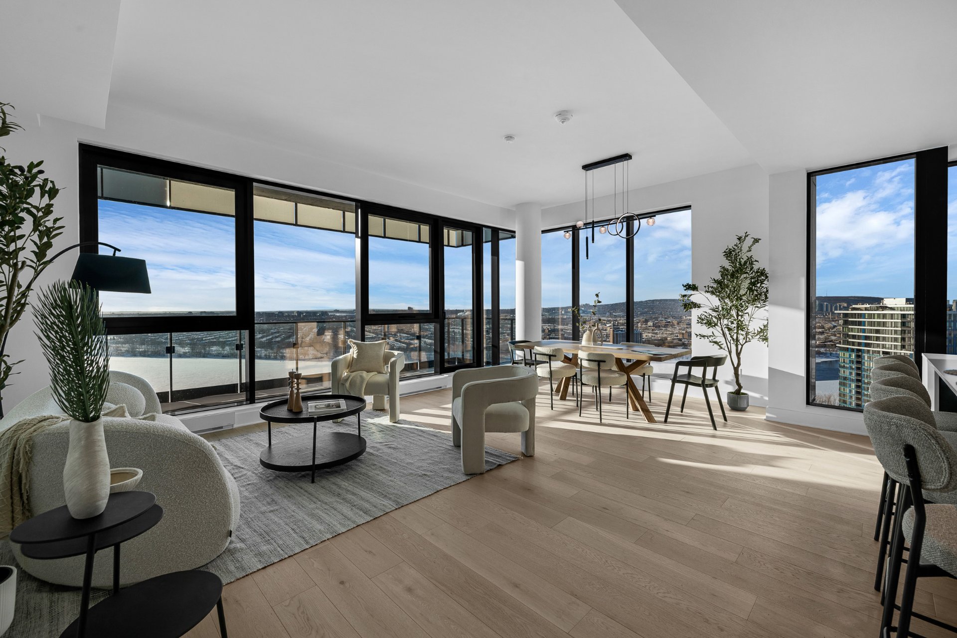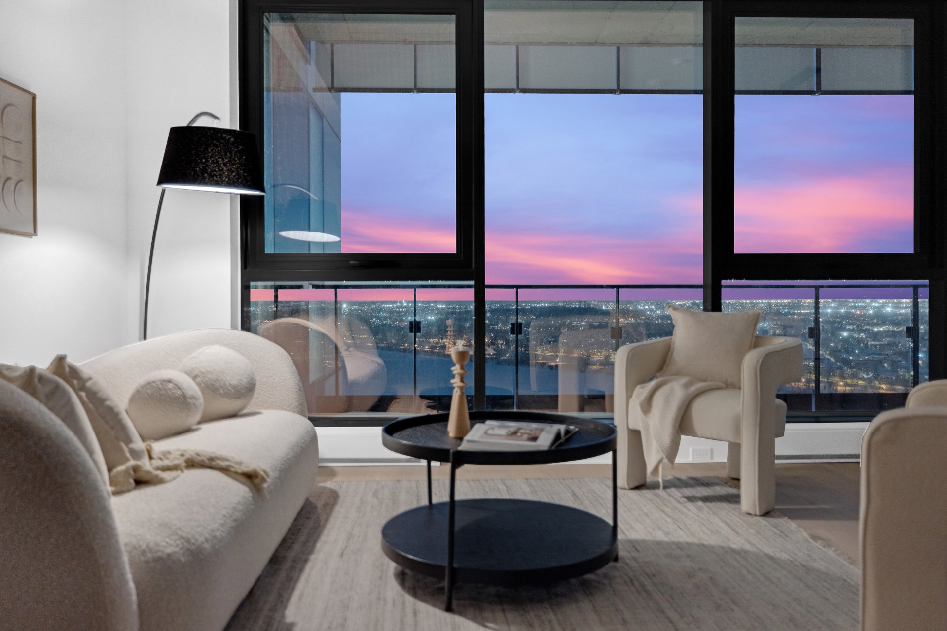 this exceptional high-floor residence at Symphonia VIU commands breathtaking, uninterrupted panoramic views of the St. Lawrence River, the golf course, and the Montréal skyline. Showcasing 10-foot ceilings and refined, penthouse-caliber finishes throughout, the residence has been thoughtfully enhanced with elegant contemporary staging, creating a sophisticated interplay of scale, natural light, and privacy. This presentation captures the true essence of the residence as it can be experienced in real life, while embodying the refined lifestyle and architectural distinction of one of Nuns' Island's most prestigious addresses.