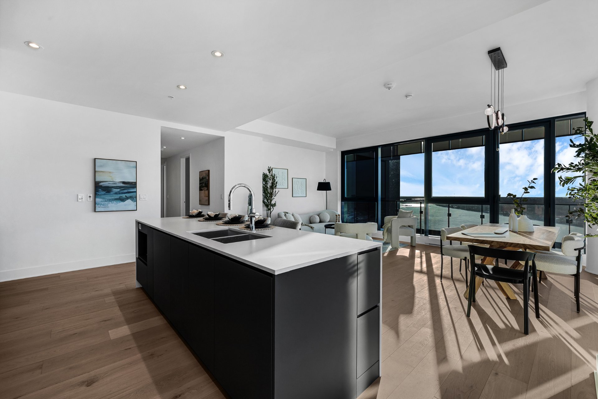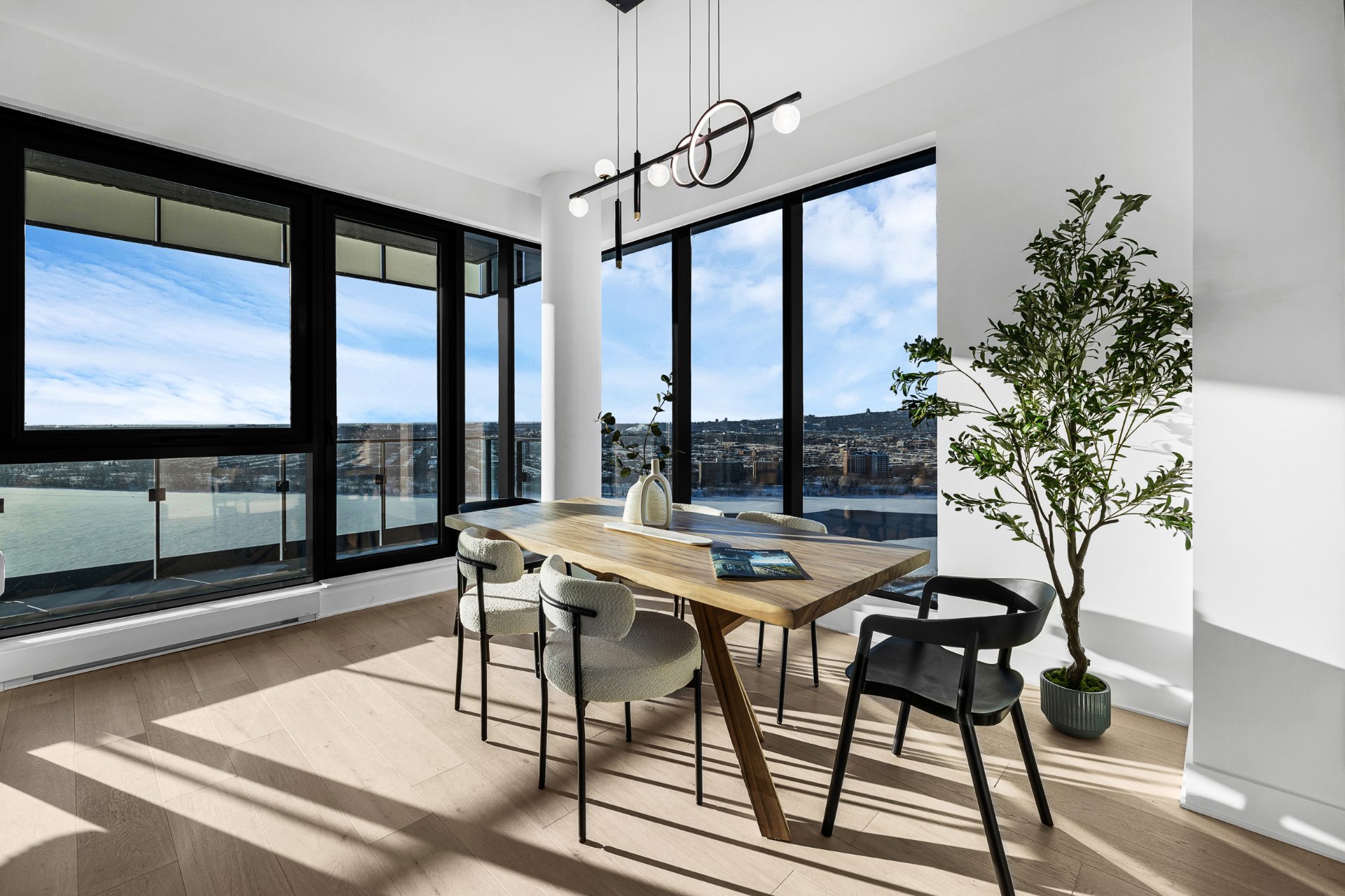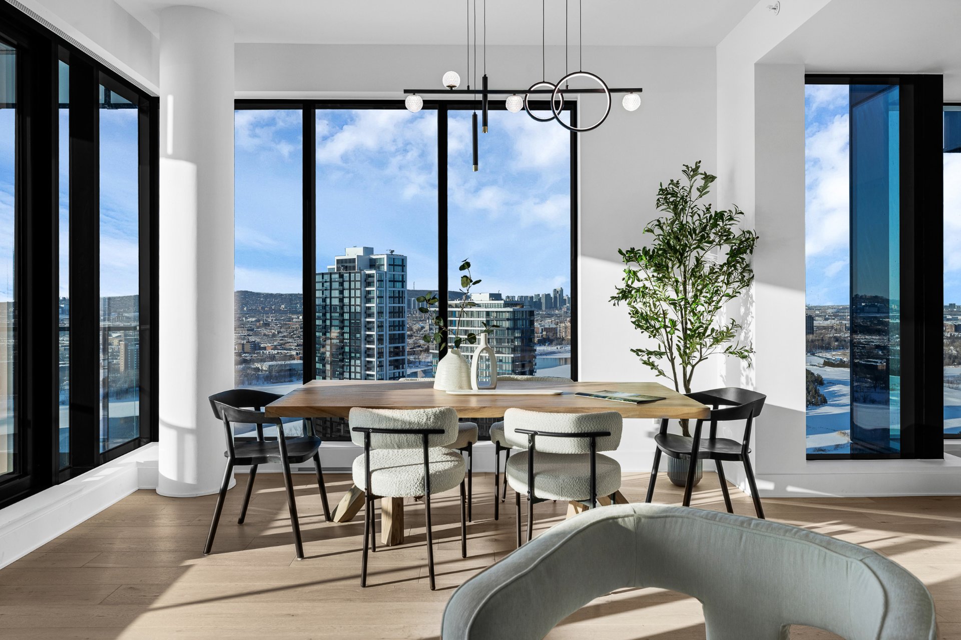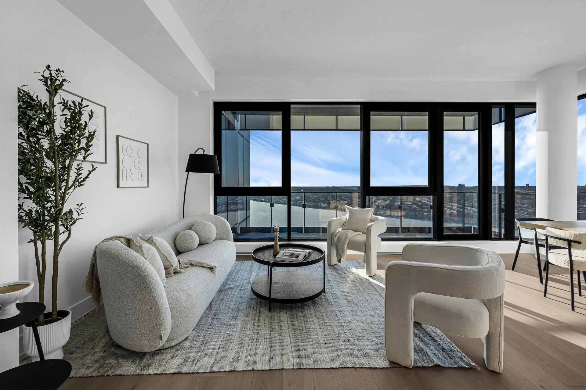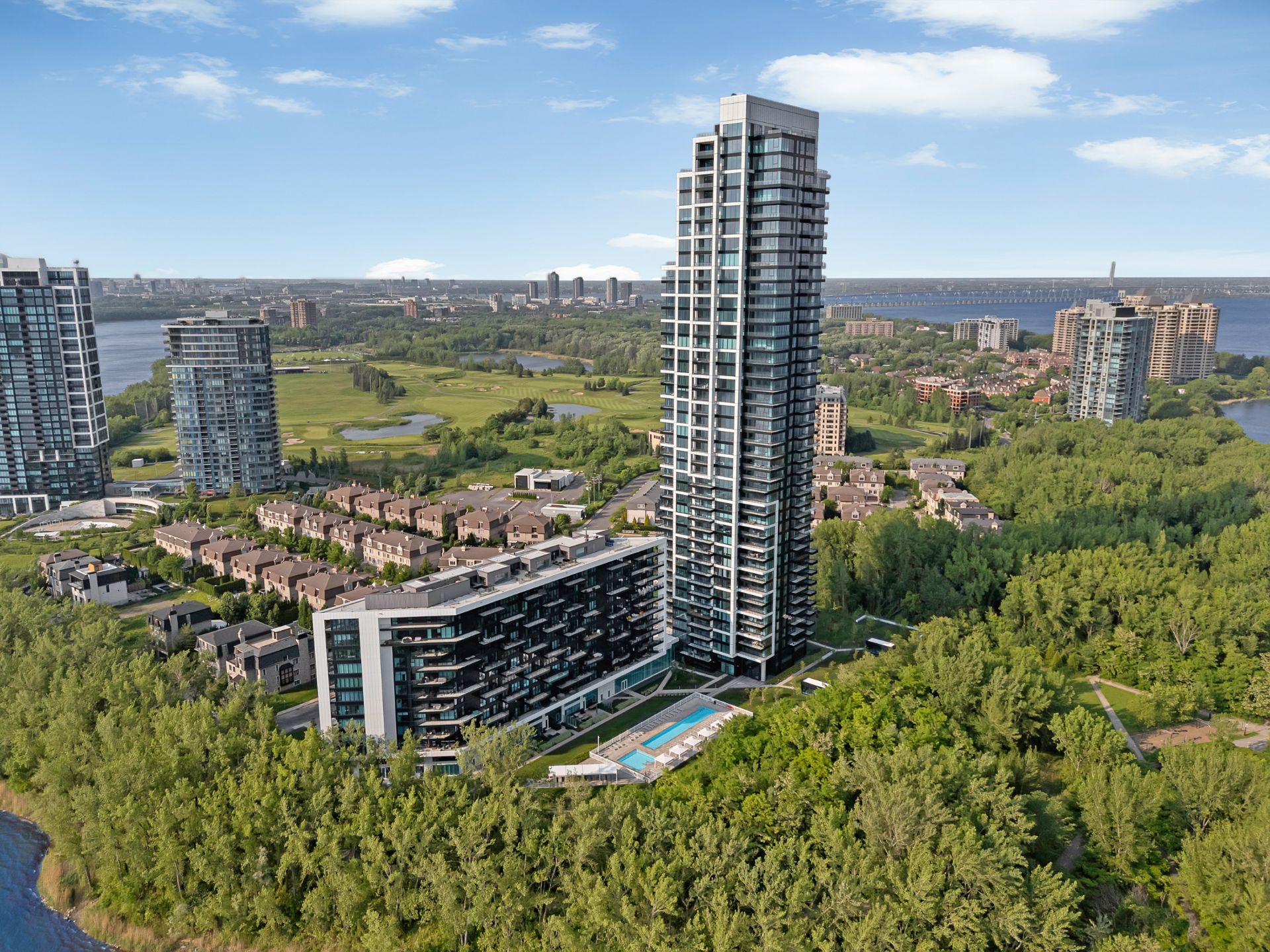 this exceptional high-floor residence at Symphonia VIU commands breathtaking, uninterrupted panoramic views of the St. Lawrence River, the golf course, and the Montréal skyline. Showcasing 10-foot ceilings and refined, penthouse-caliber finishes throughout, the residence has been thoughtfully enhanced with elegant contemporary staging, creating a sophisticated interplay of scale, natural light, and privacy. This presentation captures the true essence of the residence as it can be experienced in real life, while embodying the refined lifestyle and architectural distinction of one of Nuns' Island's most prestigious addresses.