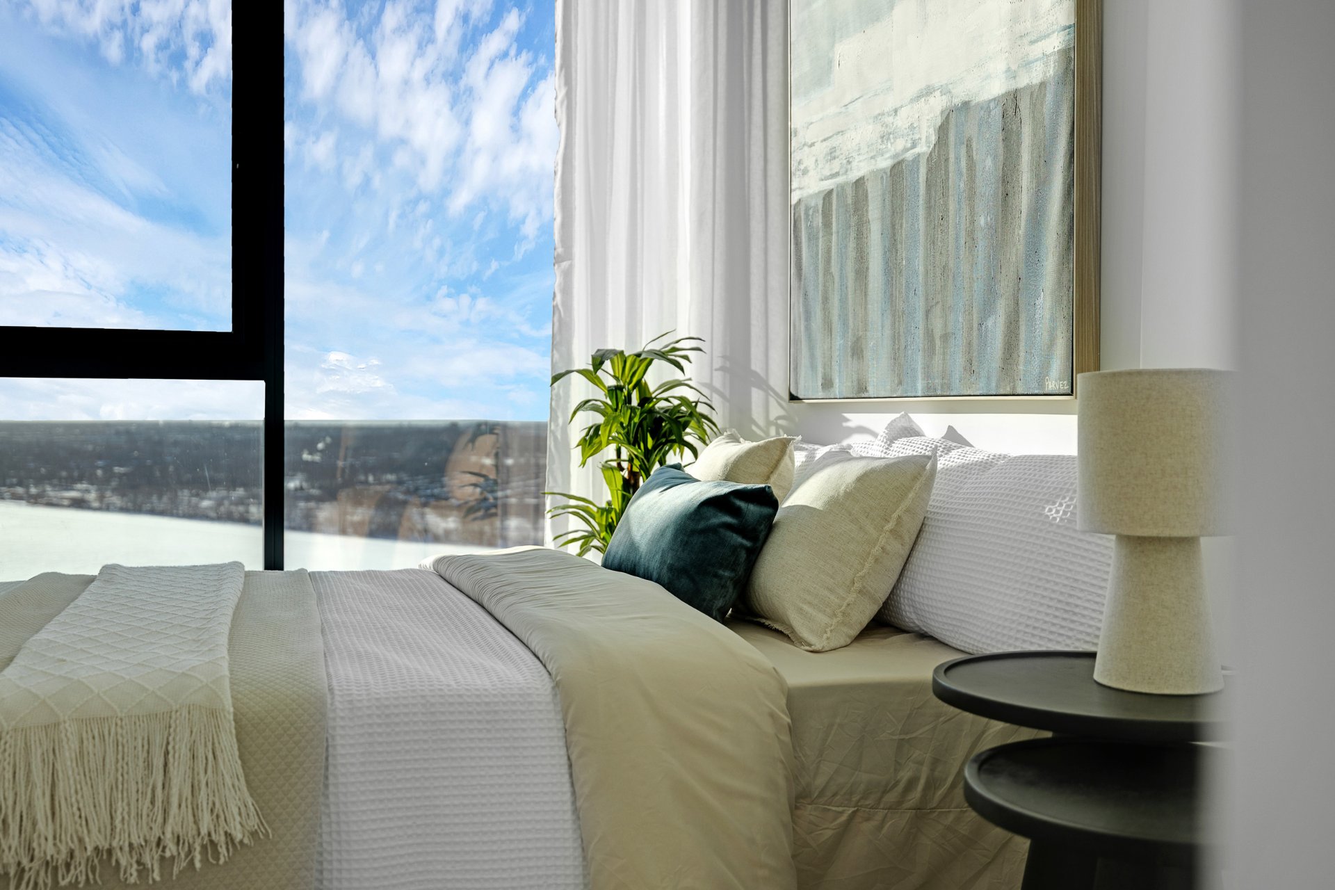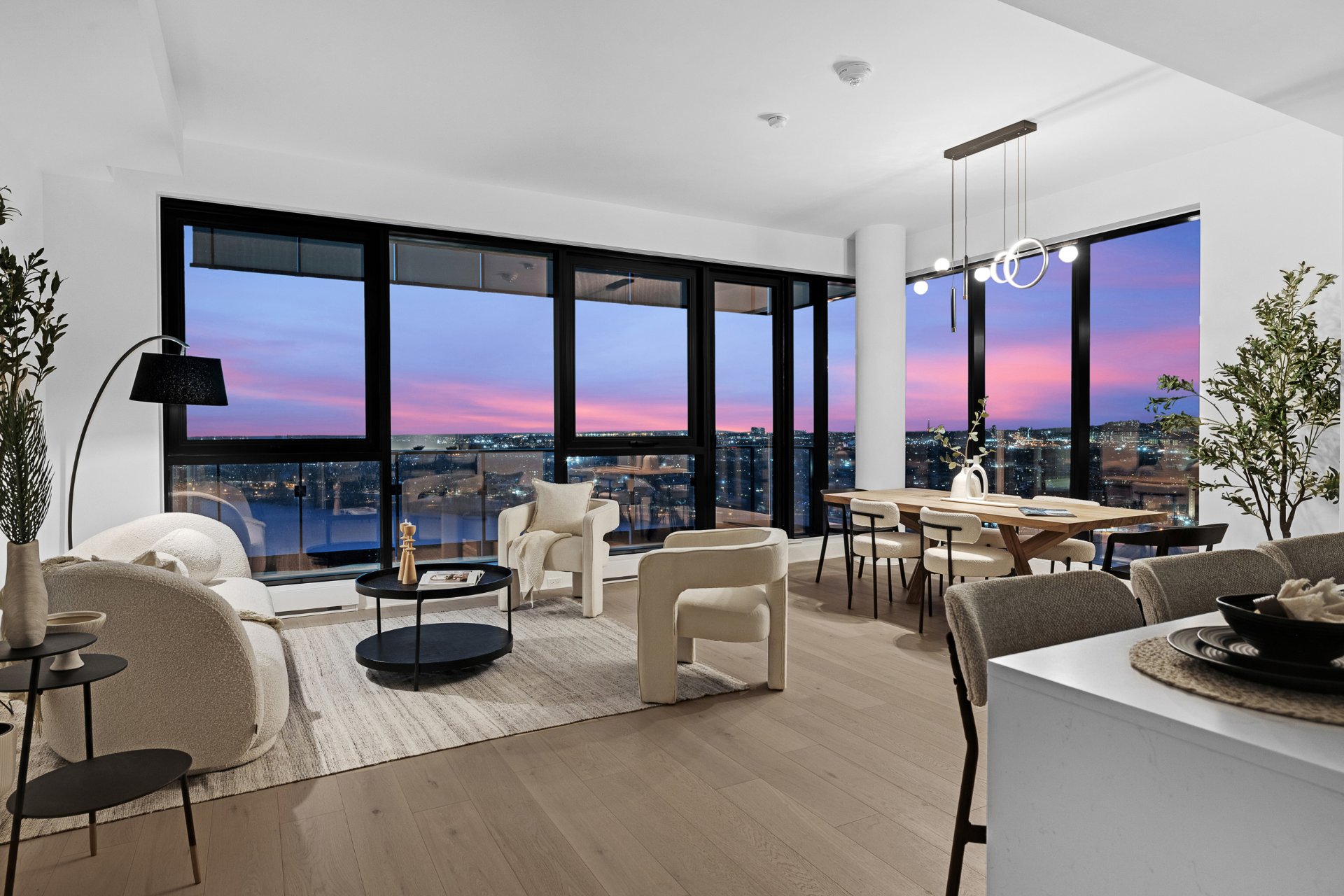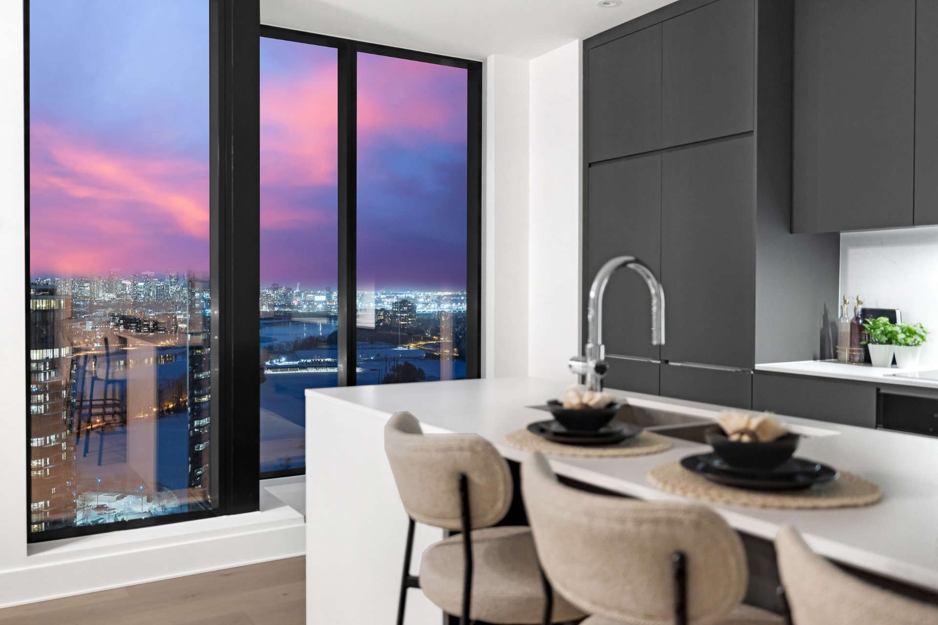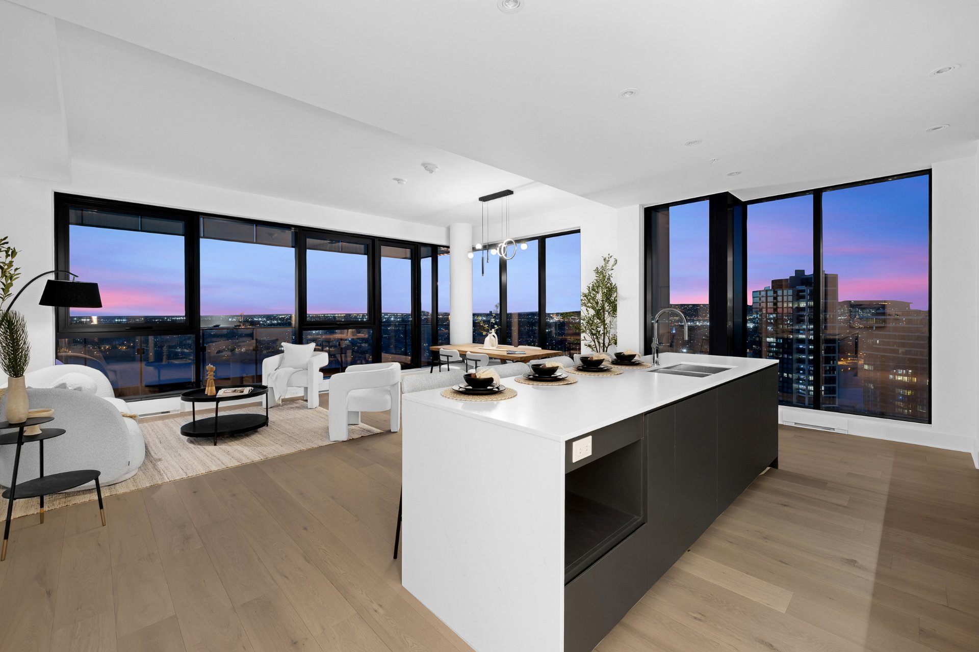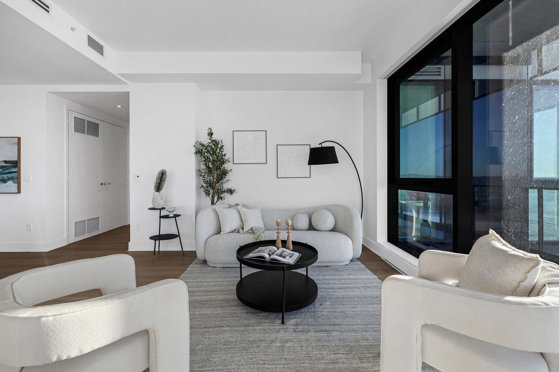 this exceptional high-floor residence at Symphonia VIU commands breathtaking, uninterrupted panoramic views of the St. Lawrence River, the golf course, and the Montréal skyline. Showcasing 10-foot ceilings and refined, penthouse-caliber finishes throughout, the residence has been thoughtfully enhanced with elegant contemporary staging, creating a sophisticated interplay of scale, natural light, and privacy. This presentation captures the true essence of the residence as it can be experienced in real life, while embodying the refined lifestyle and architectural distinction of one of Nuns' Island's most prestigious addresses.