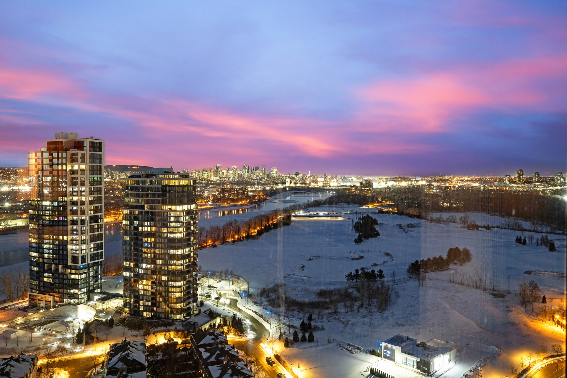 day and night, of the St. Lawrence River, downtown