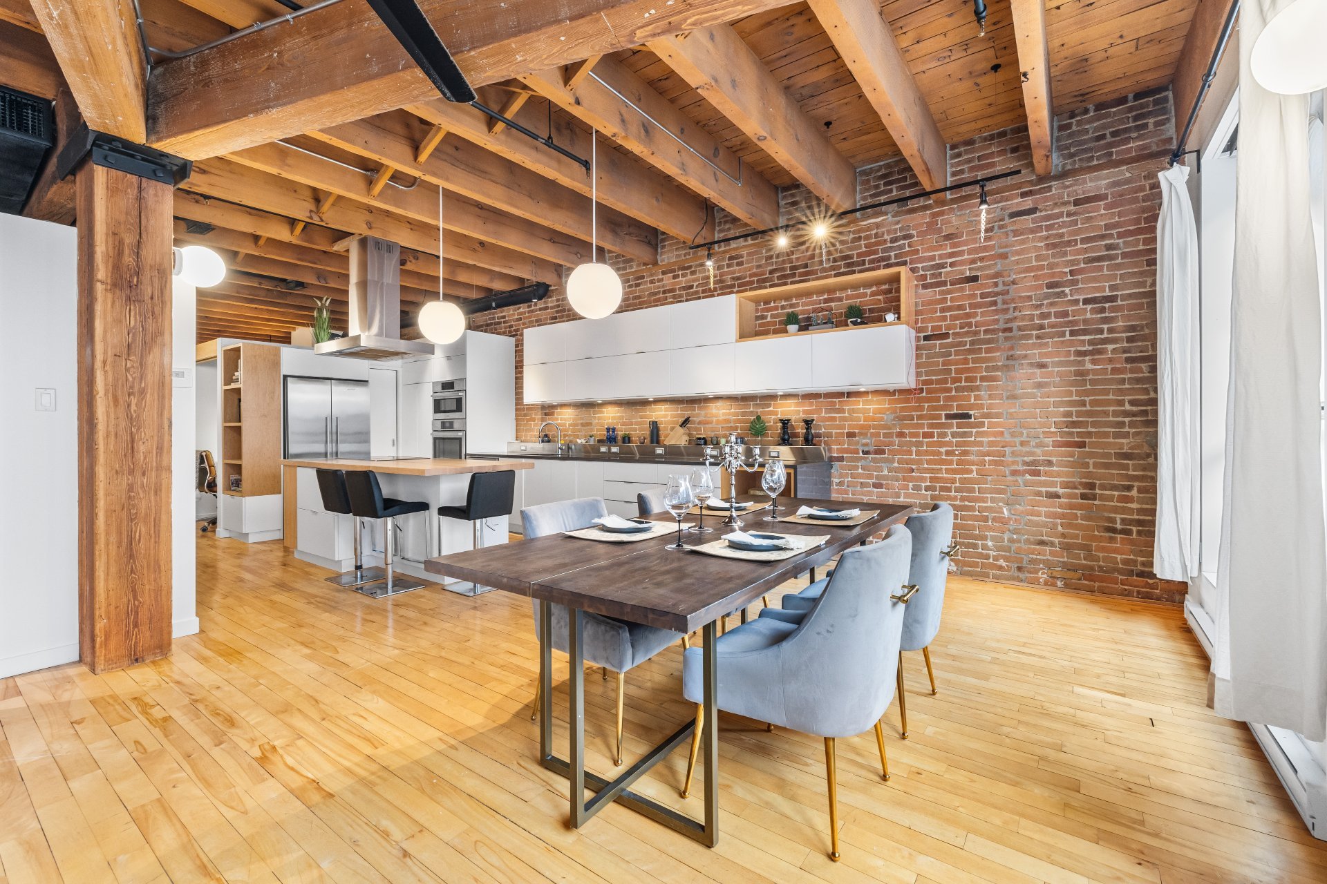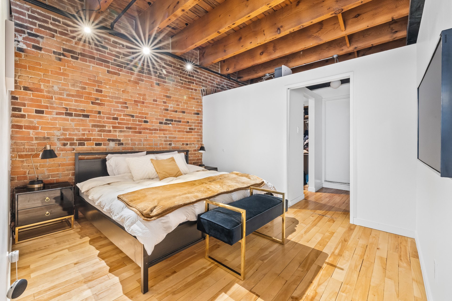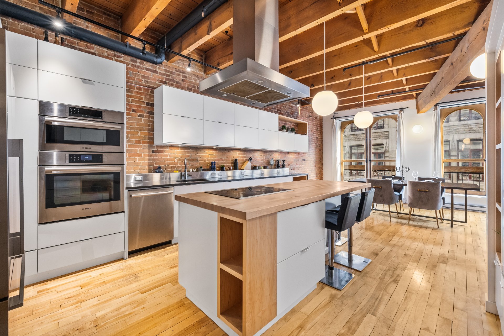 Discover this stunning modern condo featuring an industrial-chic design, located in one of Old Montreal's most sought-after historic buildings. With two bedrooms,and beautiful wooden beam ceilings, this unit blends the area's heritage charm with contemporary comfort. The main living area offers a spacious open-concept layout combining the living room, dining room, and kitchen -- perfect for everyday living or entertaining guests. The sleek, modern kitchen is bathed in natural light and features high-end finishes, ample built-in storage, and a large central island ideal for cooking or hosting.