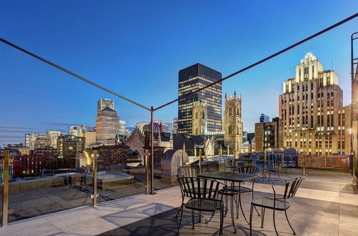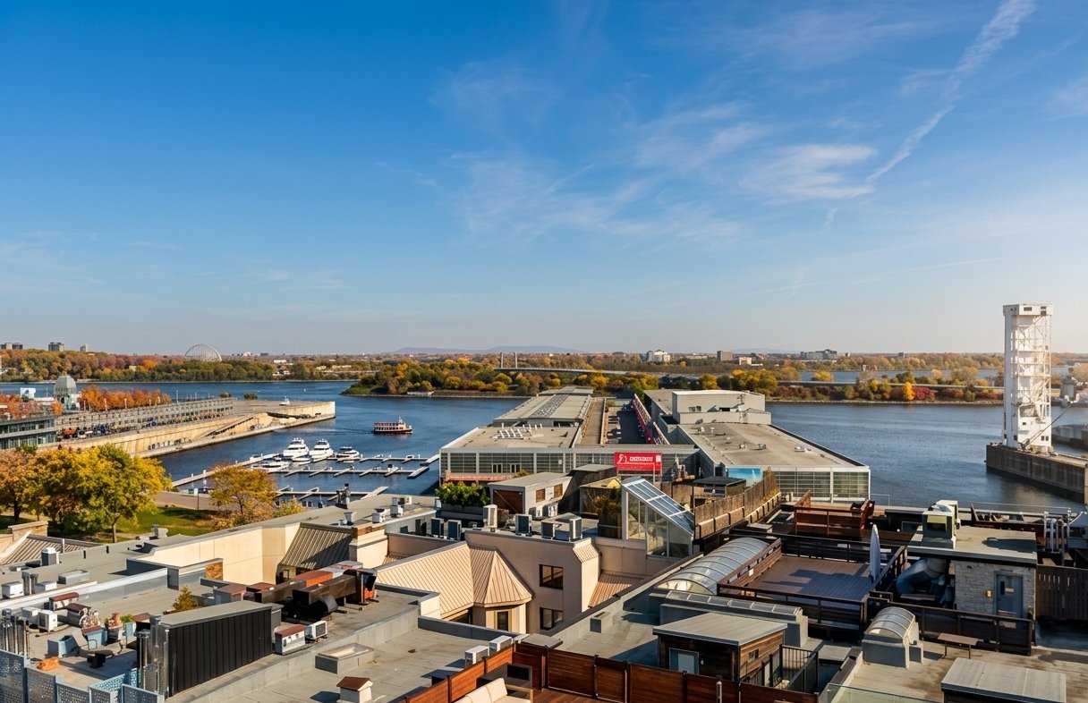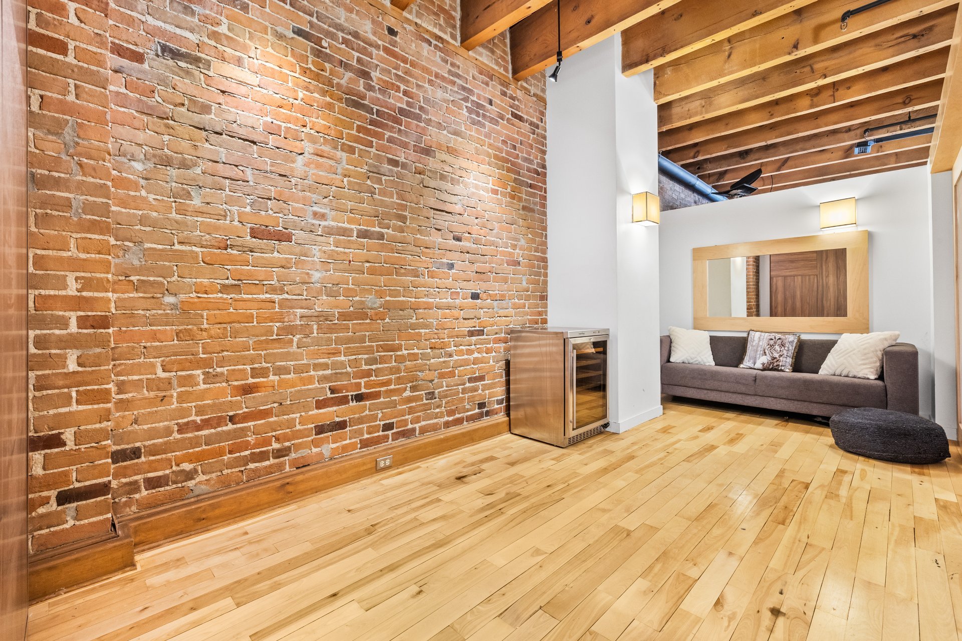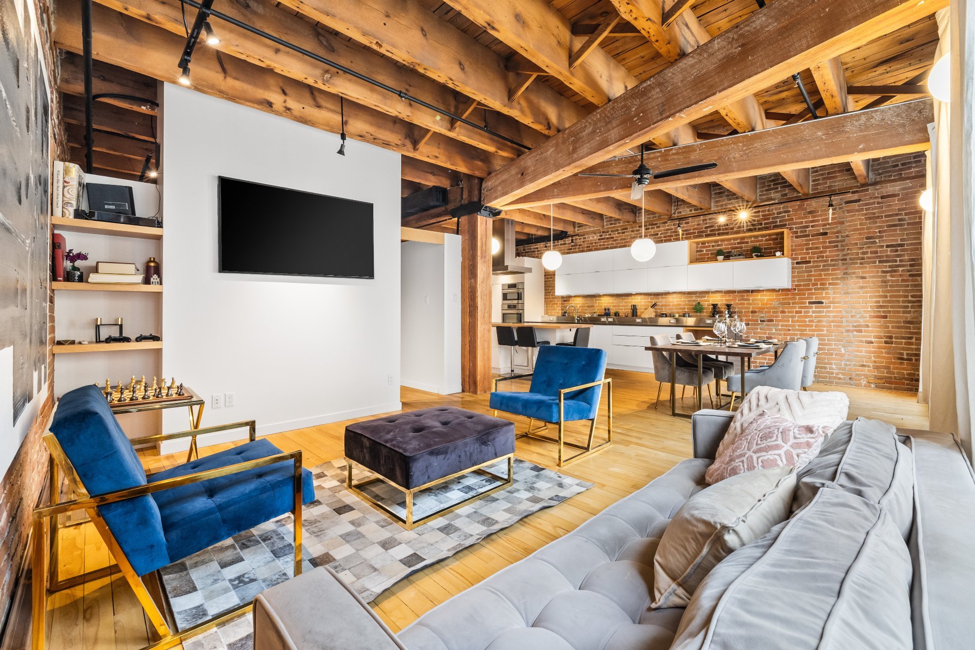 Discover this stunning modern condo featuring an industrial-chic design, located in one of Old Montreal's most sought-after historic buildings. With two bedrooms,and beautiful wooden beam ceilings, this unit blends the area's heritage charm with contemporary comfort. The main living area offers a spacious open-concept layout combining the living room, dining room, and kitchen -- perfect for everyday living or entertaining guests. The sleek, modern kitchen is bathed in natural light and features high-end finishes, ample built-in storage, and a large central island ideal for cooking or hosting.