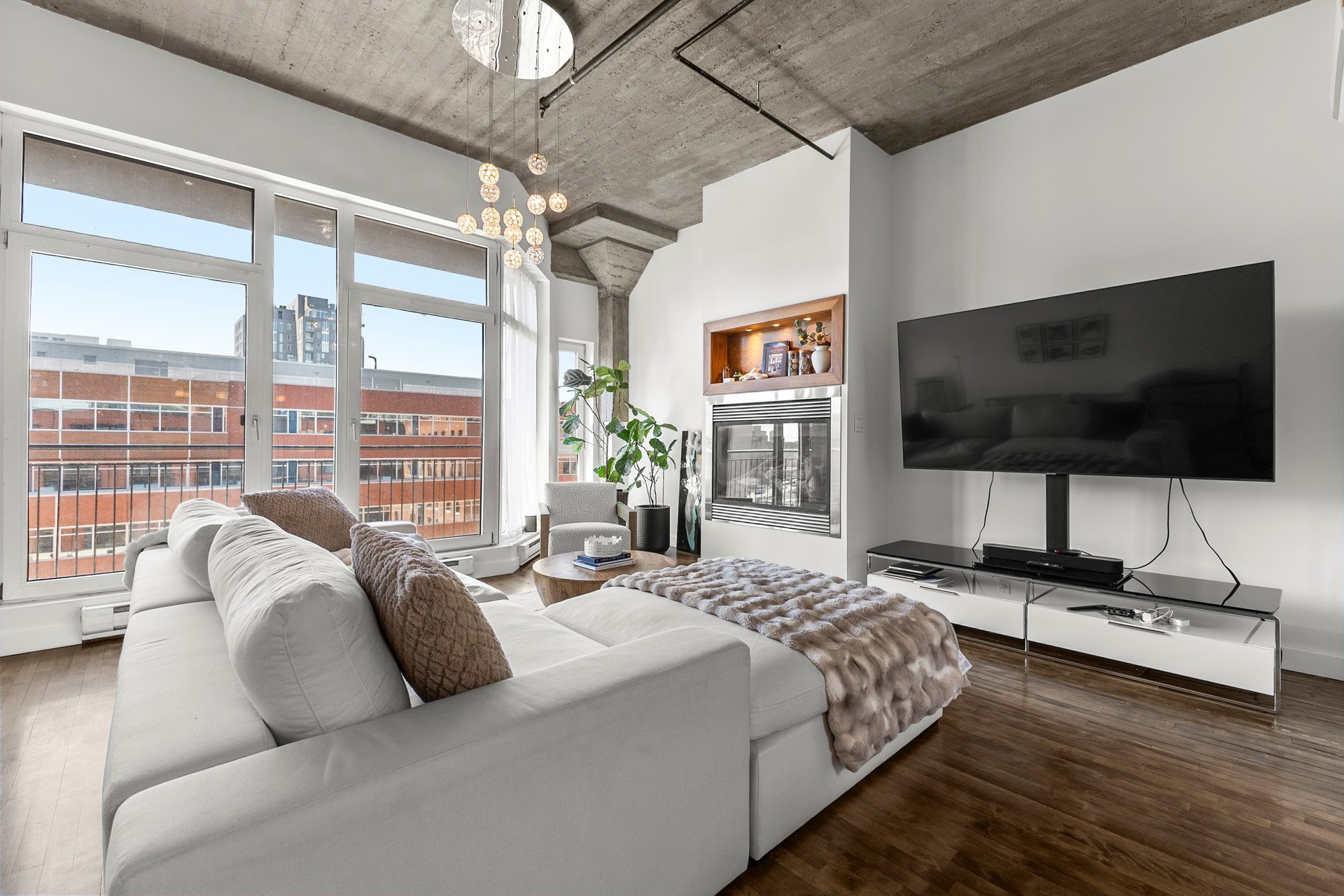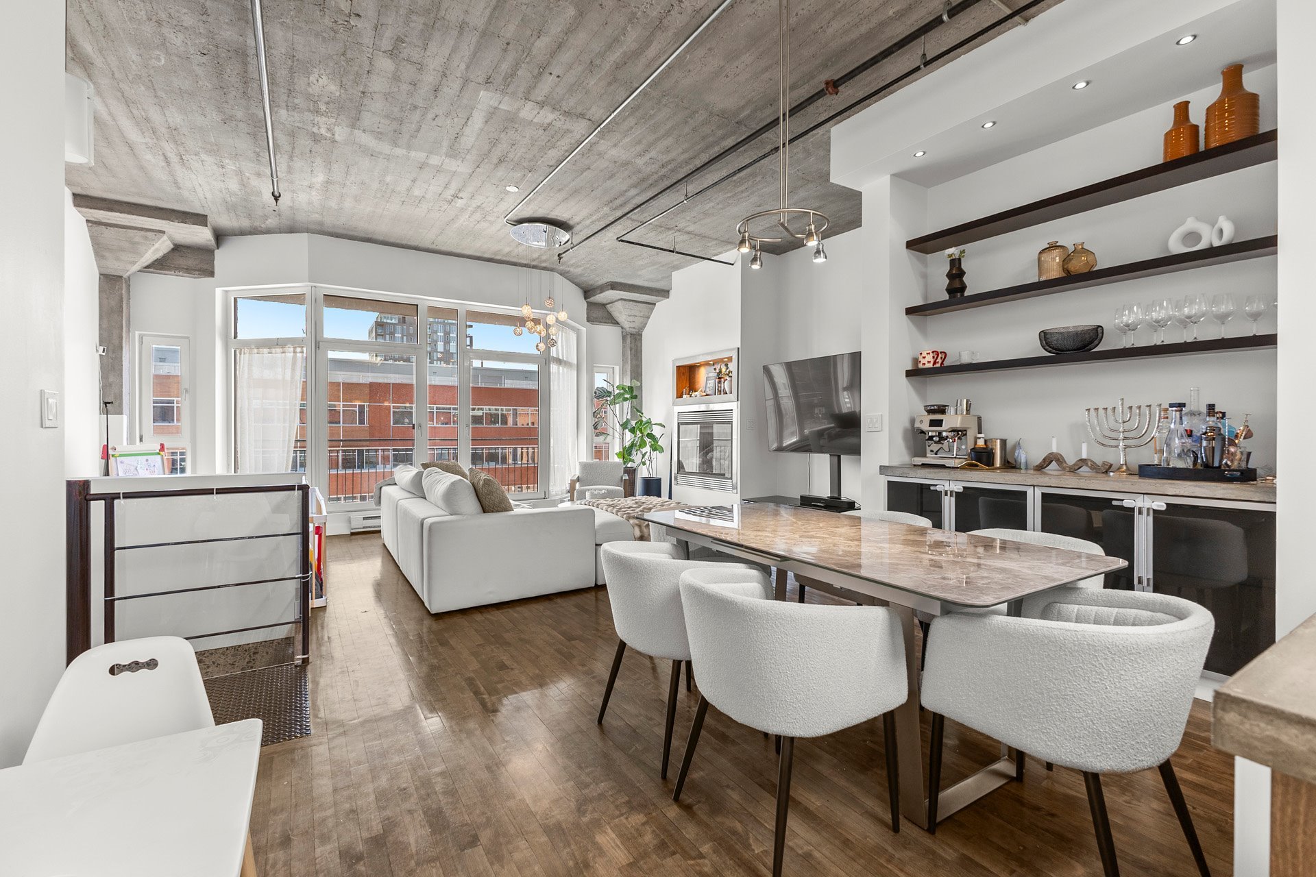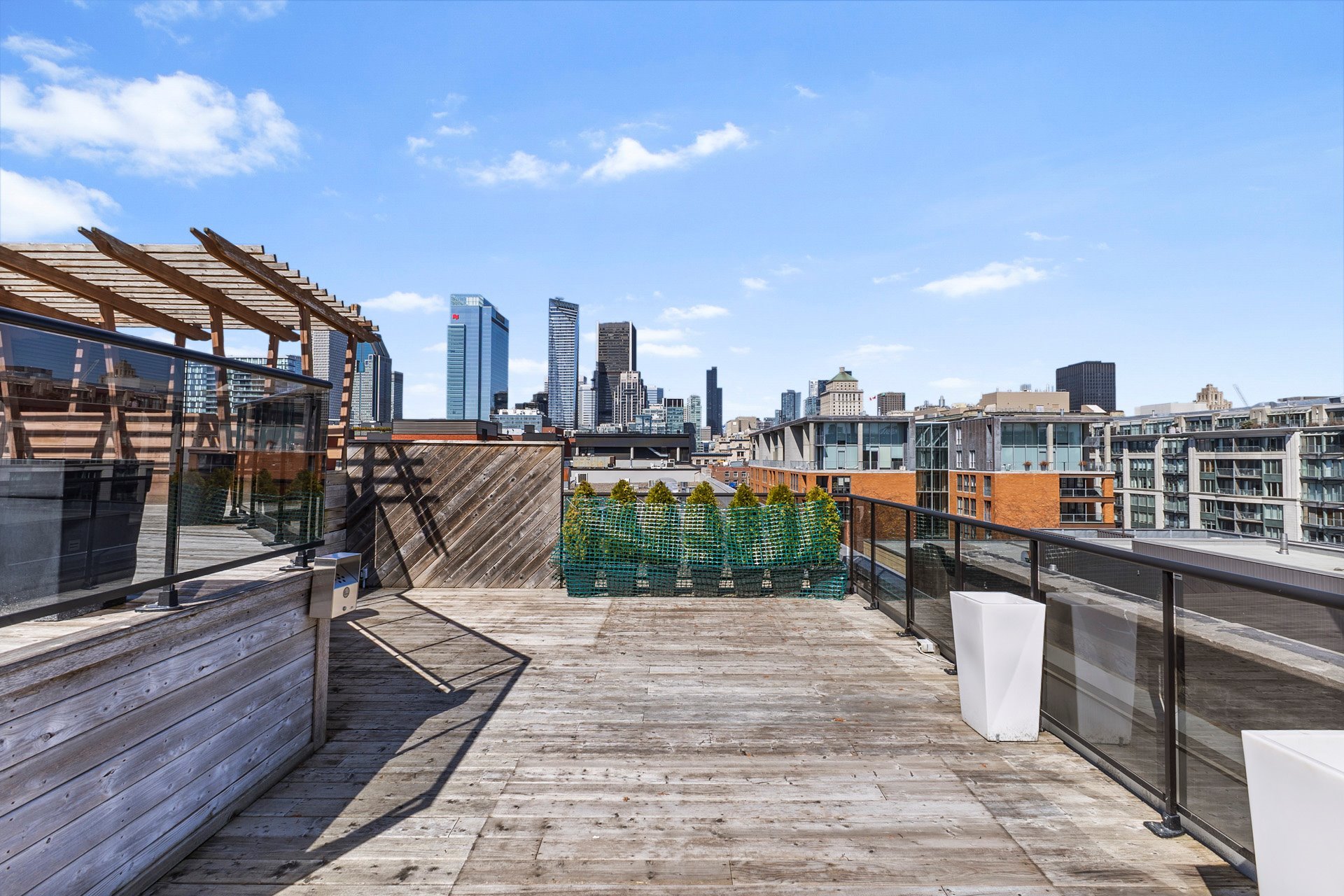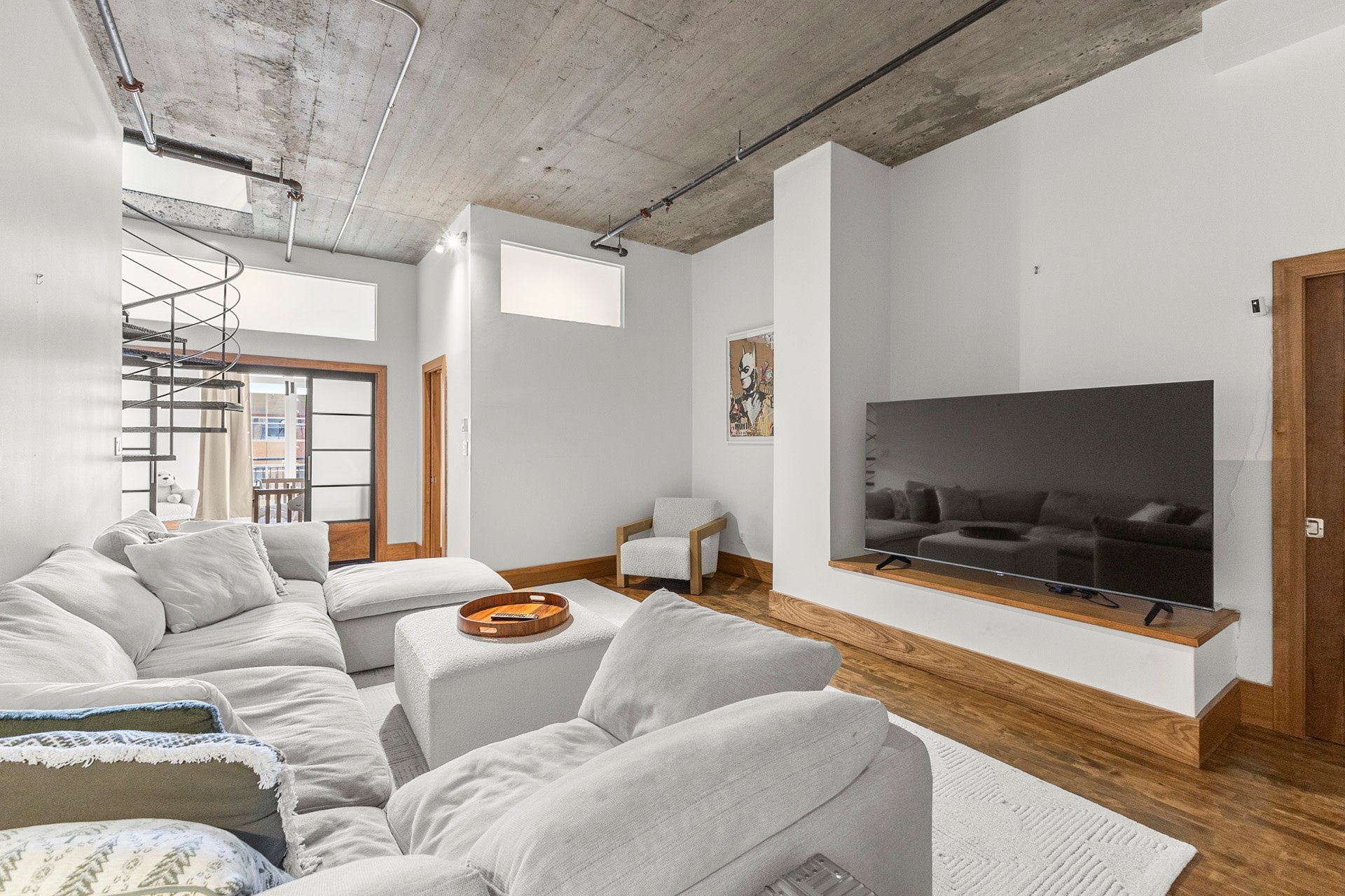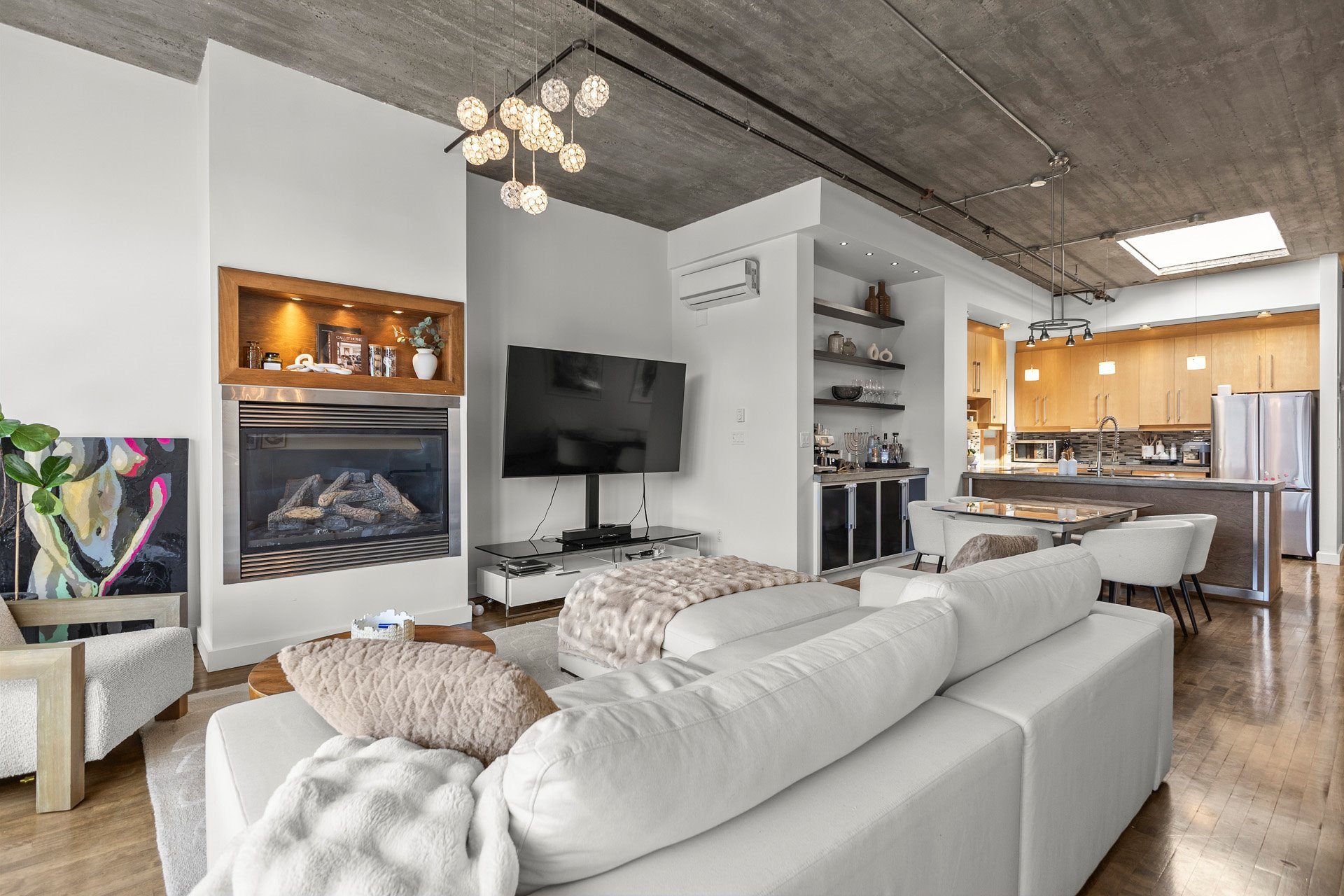 Rare 1,667 sq.ft. two-level condo in Old Montreal, created by combining 2 units. Bright upper-level living space with skylight, open concept, 10'8 concrete ceilings, gas fireplace, and balcony with west exposure. Lower level offers family room, 2 bedrooms, and 2nd bath. Includes 2 indoor parking spaces + 2 lockers. Rooftop terrace with pool and stunning water views. Walk Score 95+ near shops, dining & Bonaventure Metro Station. Unique opportunity in Montreal's sought-after Old Port.