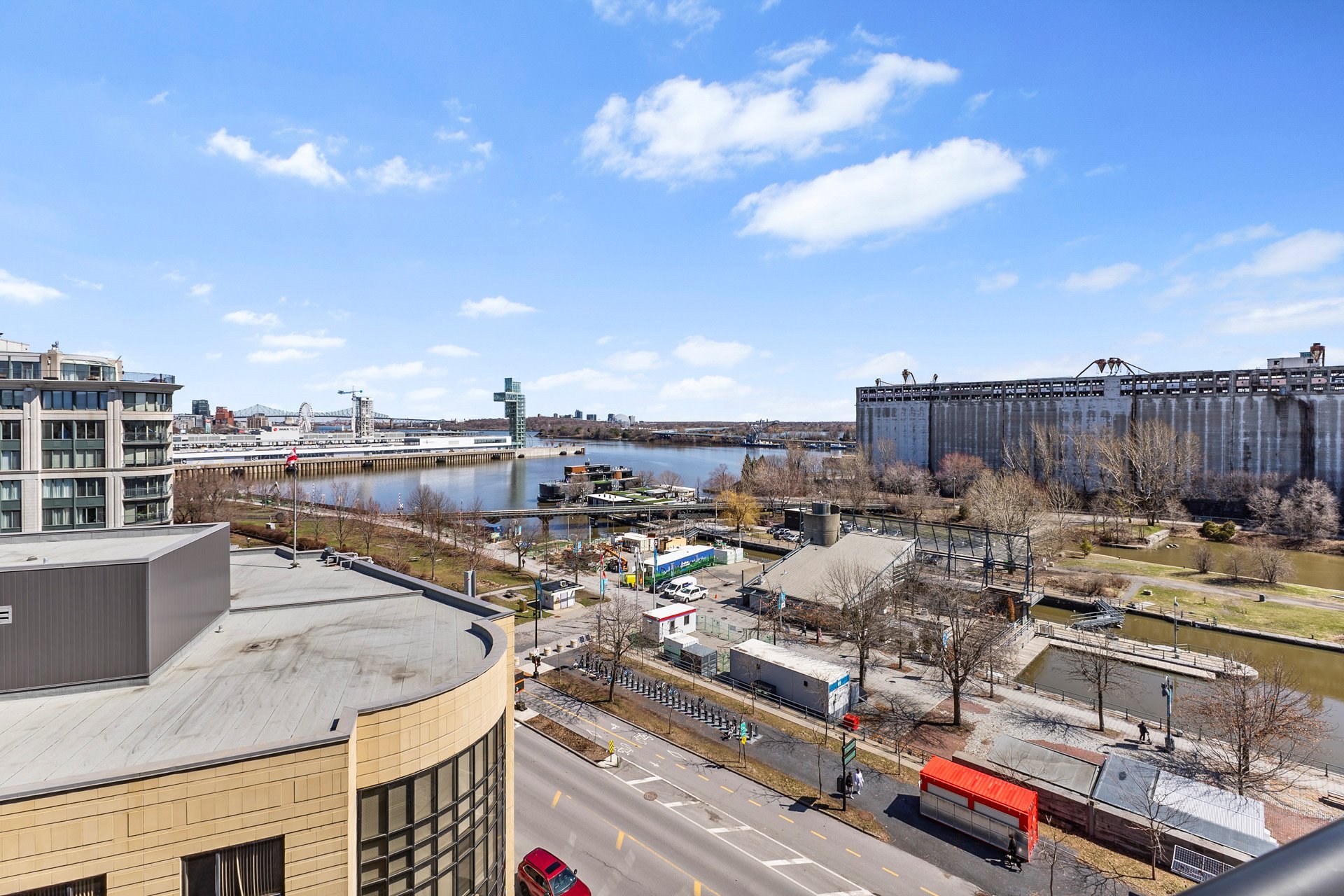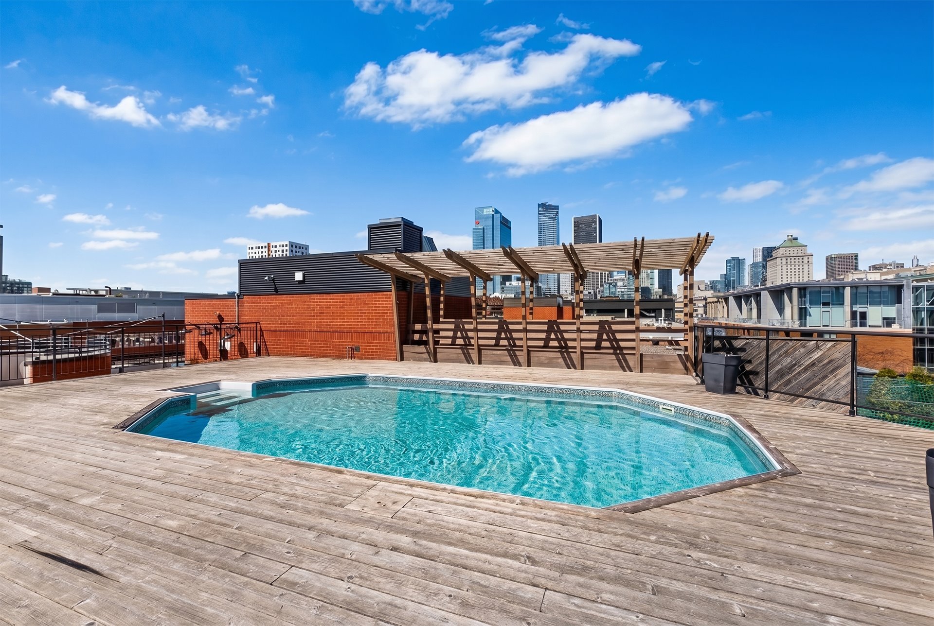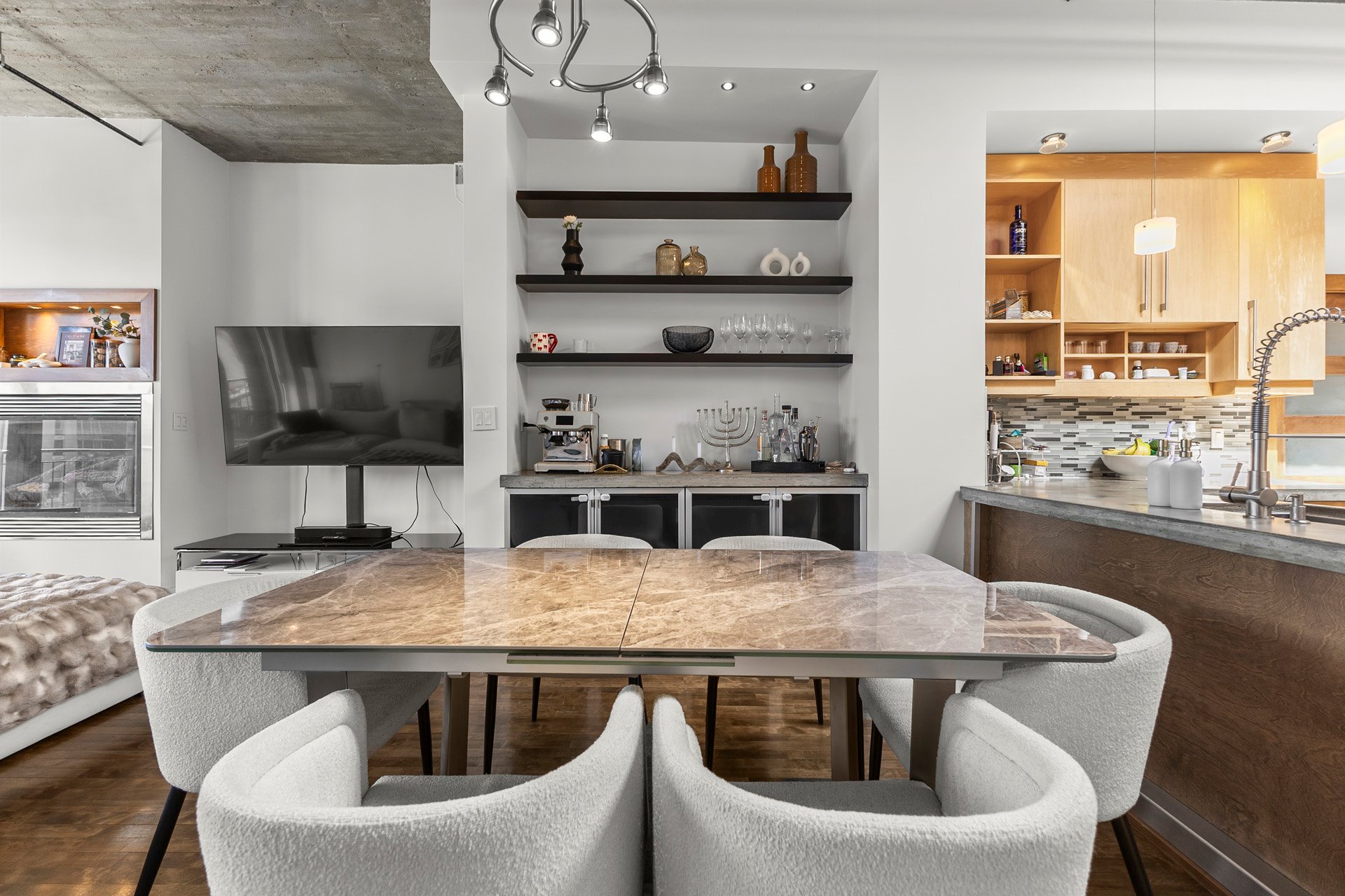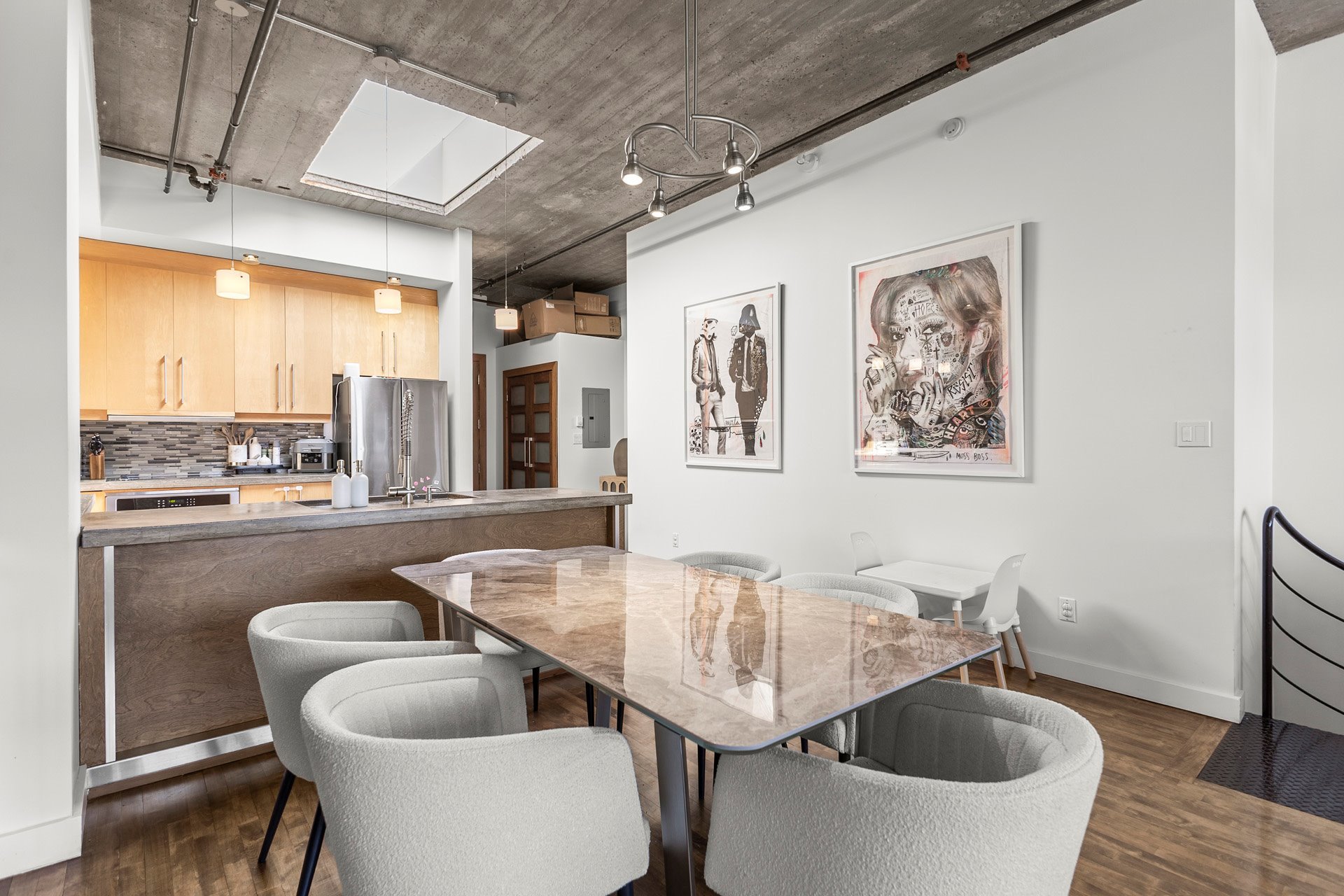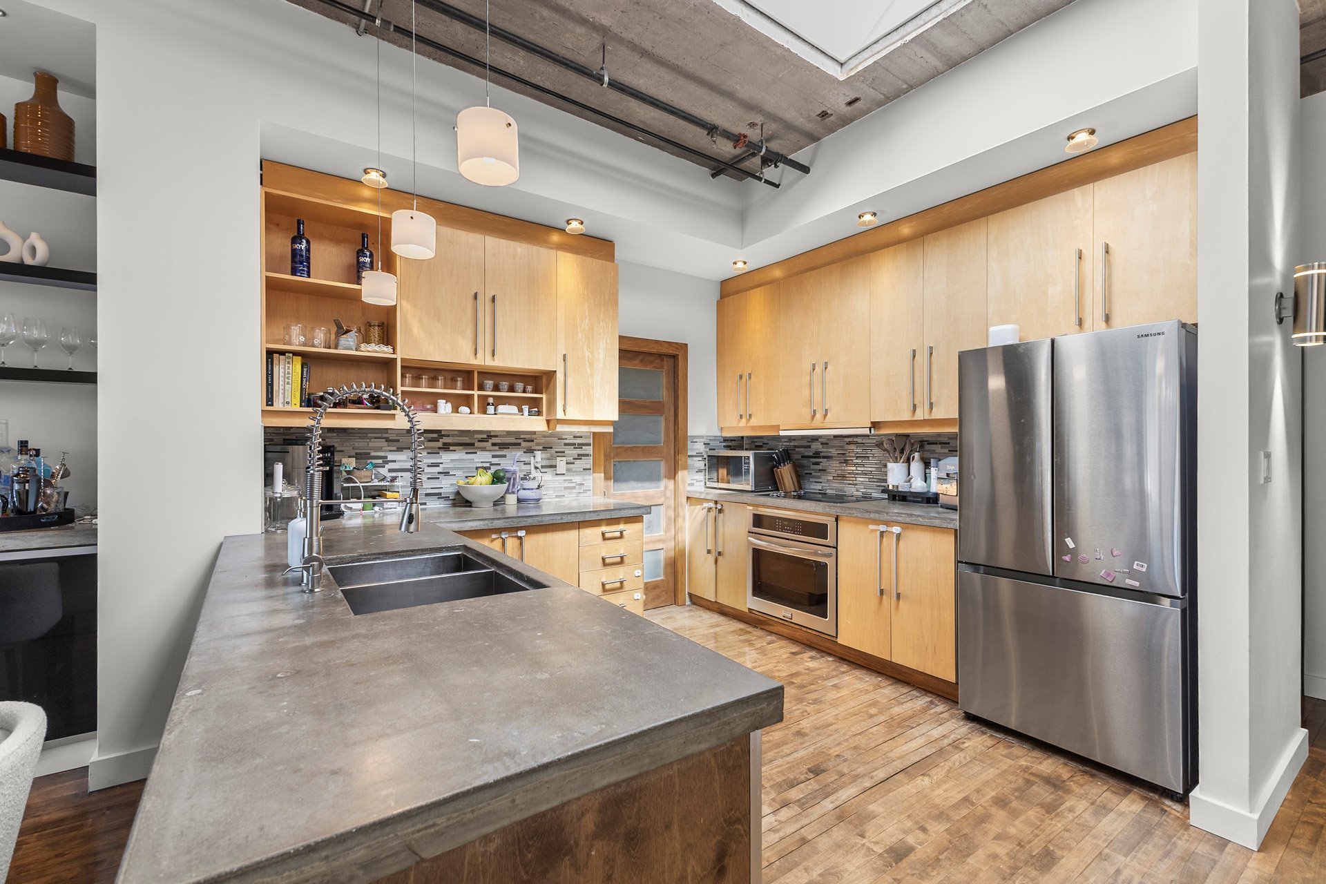 Rare 1,667 sq.ft. two-level condo in Old Montreal, created by combining 2 units. Bright upper-level living space with skylight, open concept, 10'8 concrete ceilings, gas fireplace, and balcony with west exposure. Lower level offers family room, 2 bedrooms, and 2nd bath. Includes 2 indoor parking spaces + 2 lockers. Rooftop terrace with pool and stunning water views. Walk Score 95+ near shops, dining & Bonaventure Metro Station. Unique opportunity in Montreal's sought-after Old Port.