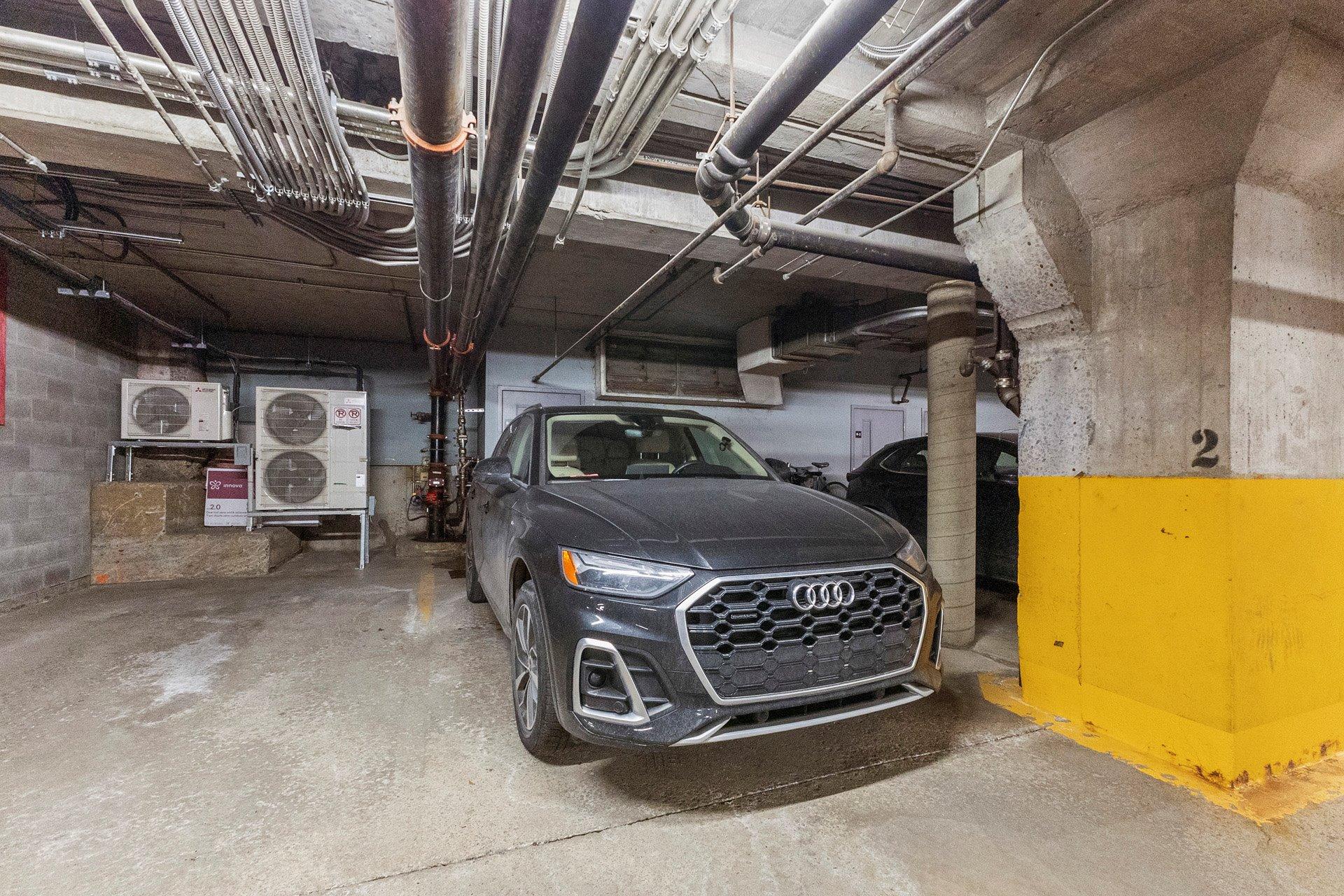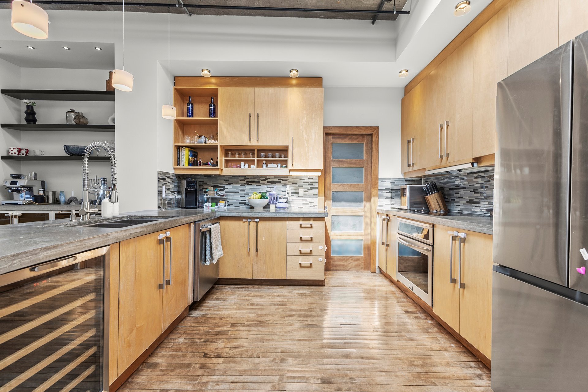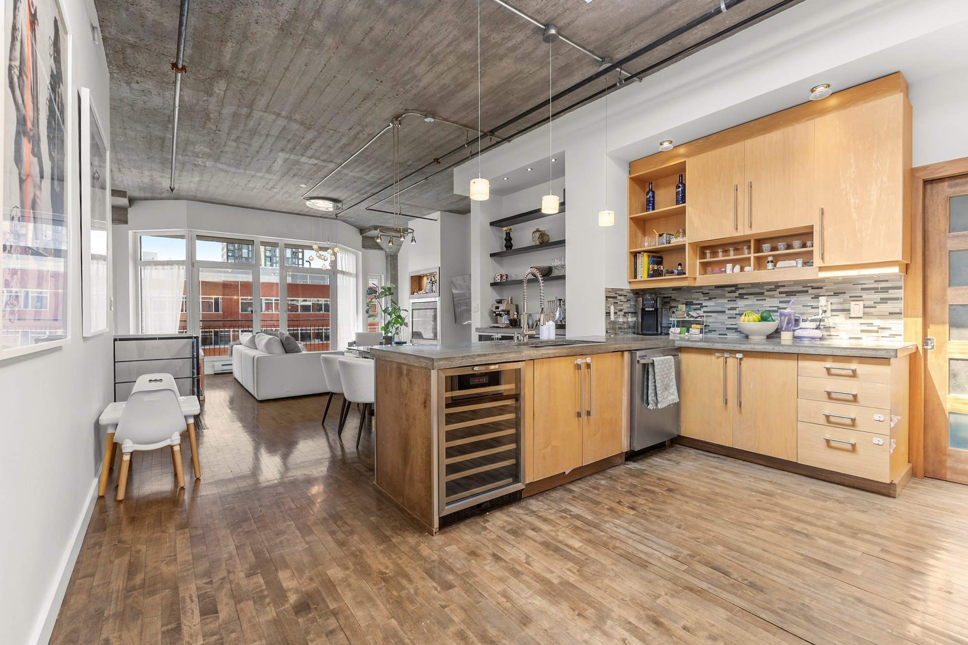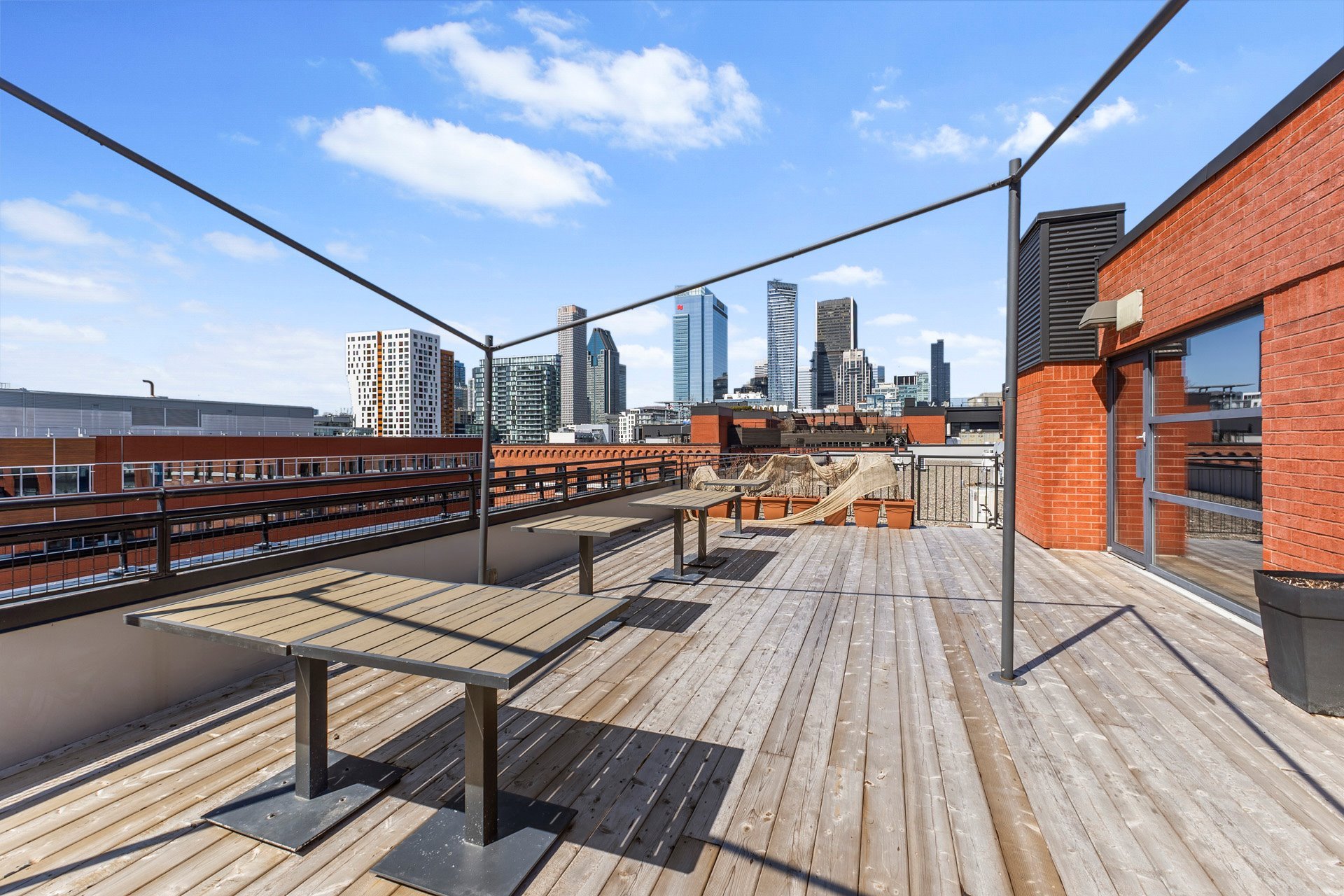 Rare 1,667 sq.ft. two-level condo in Old Montreal, created by combining 2 units. Bright upper-level living space with skylight, open concept, 10'8 concrete ceilings, gas fireplace, and balcony with west exposure. Lower level offers family room, 2 bedrooms, and 2nd bath. Includes 2 indoor parking spaces + 2 lockers. Rooftop terrace with pool and stunning water views. Walk Score 95+ near shops, dining & Bonaventure Metro Station. Unique opportunity in Montreal's sought-after Old Port.