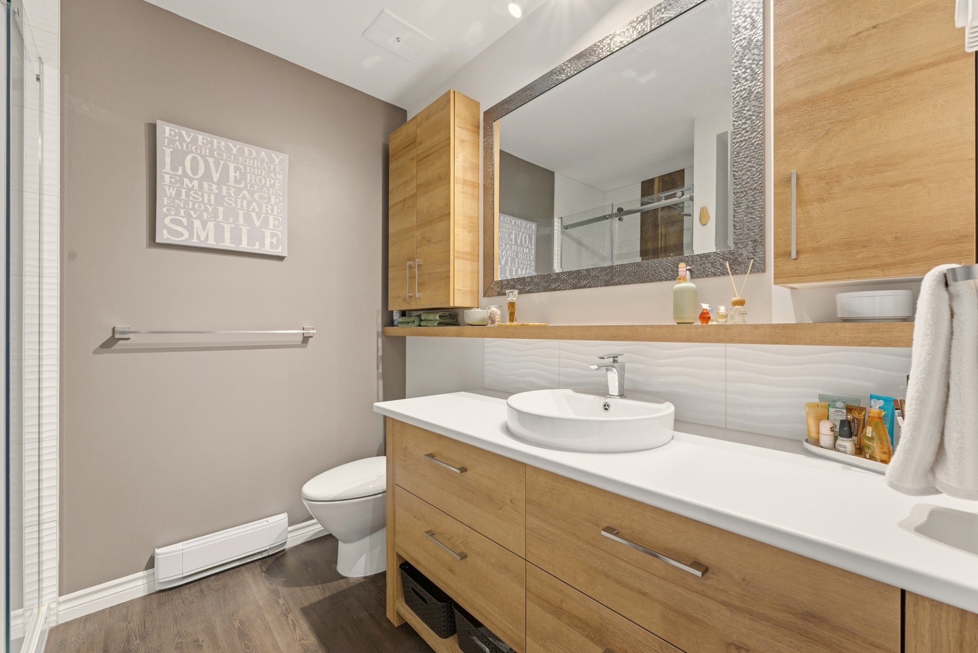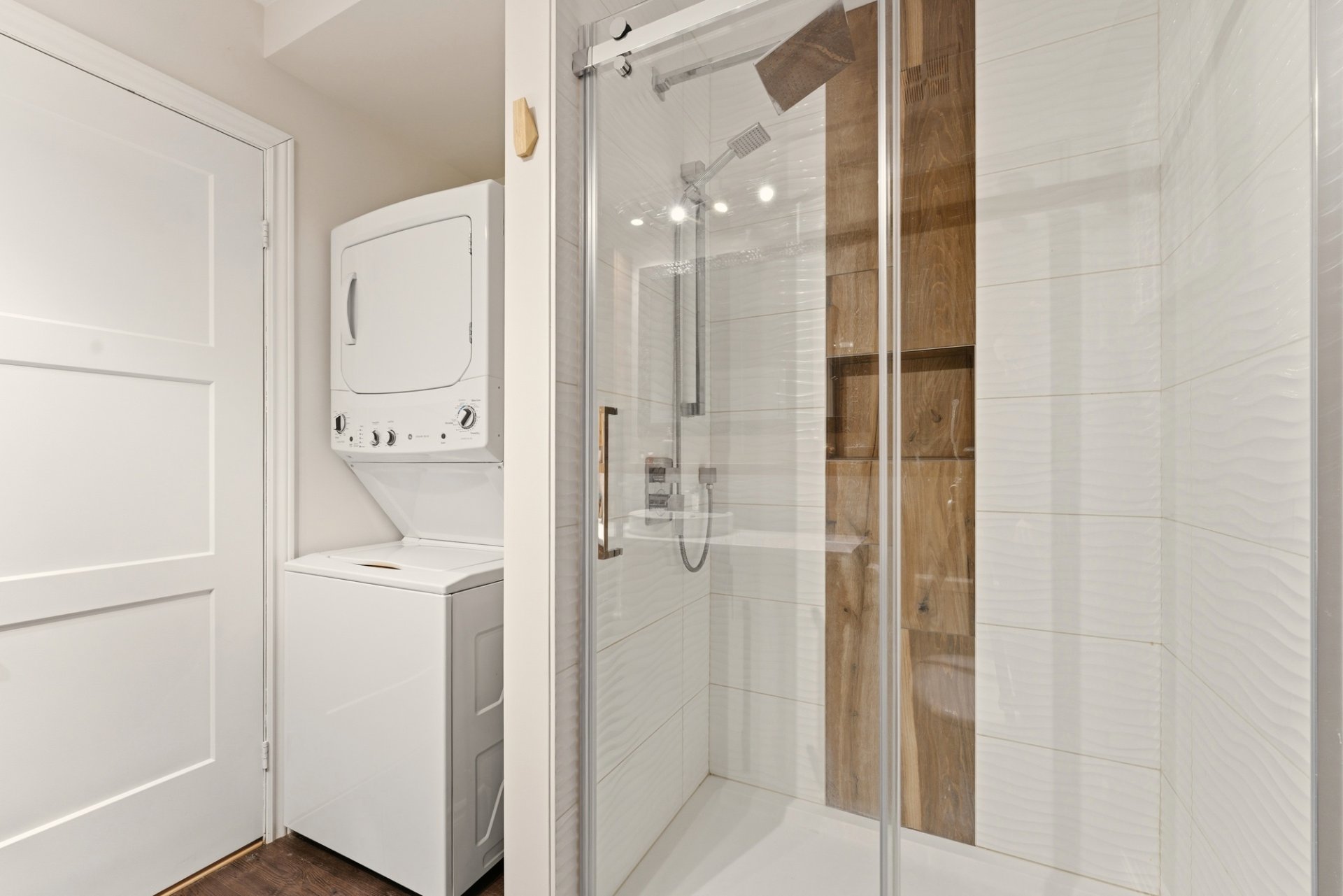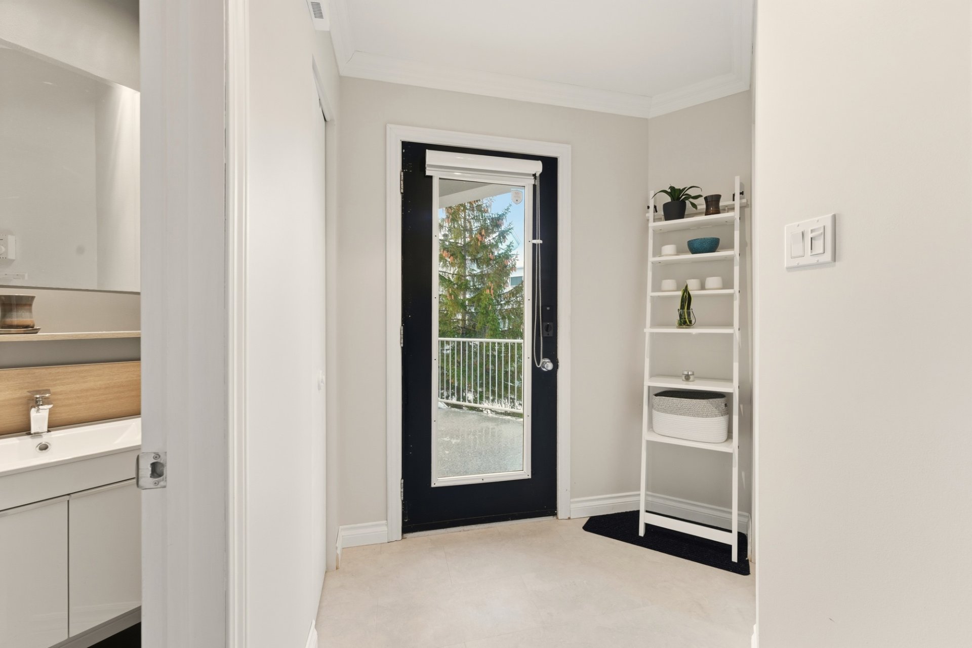 doors, as well as a modern bathroom with a stylish and
