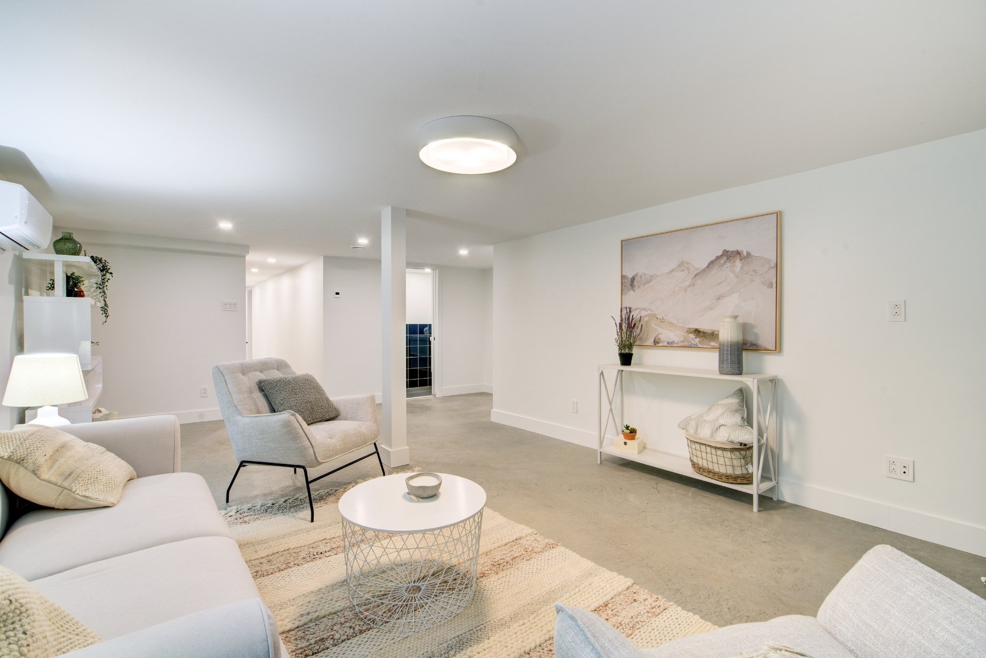 - The polished concrete slab of the basement is heated.