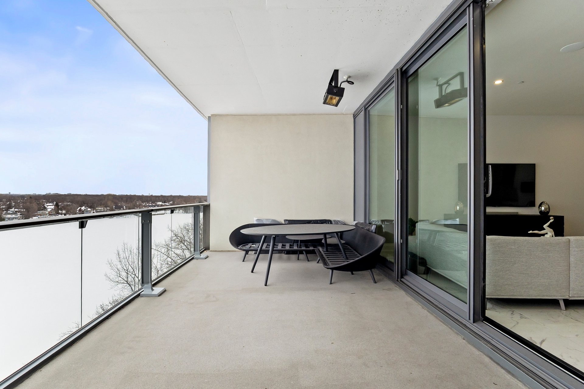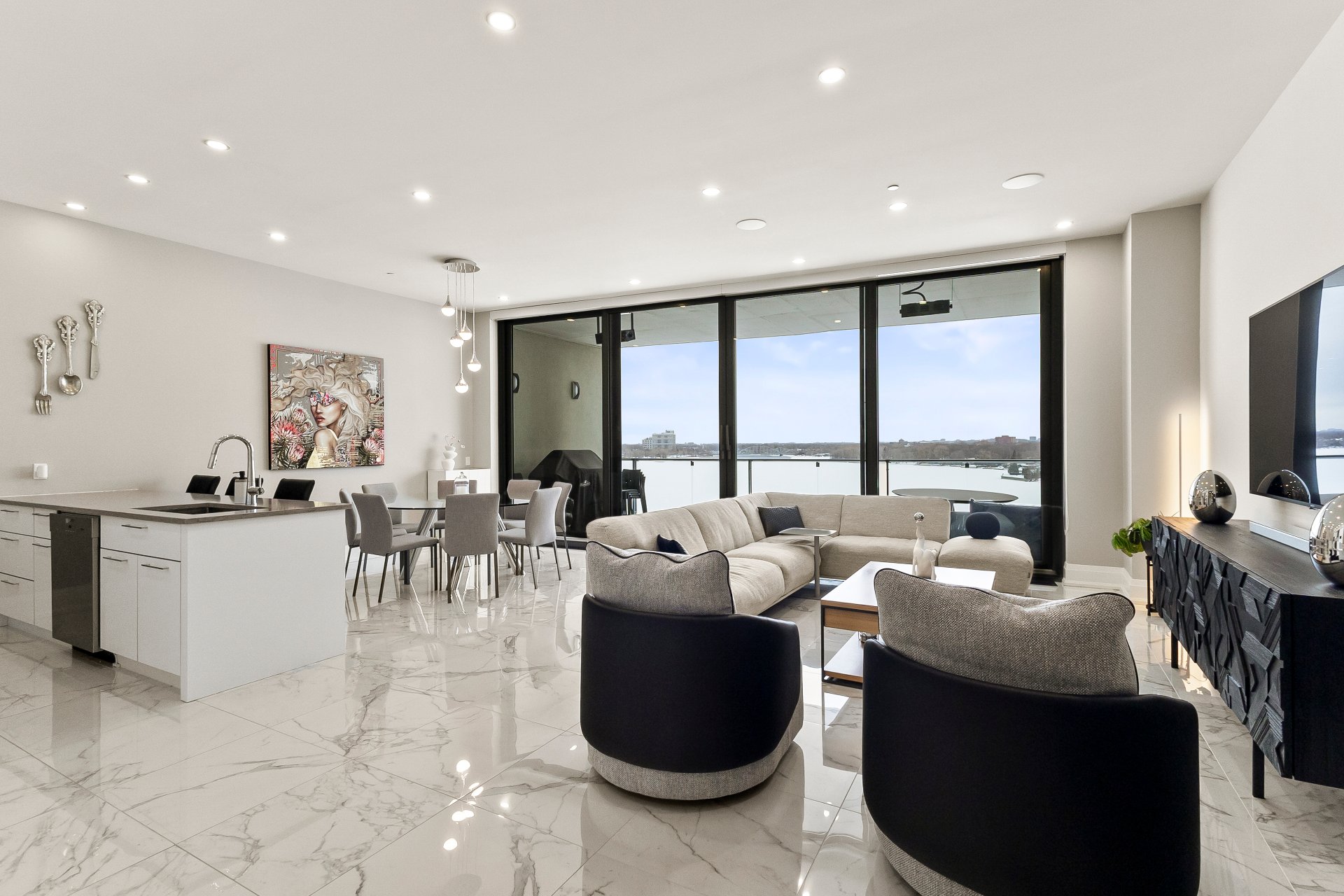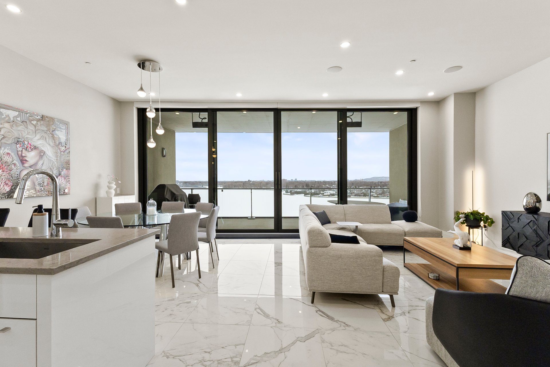 Set on prestigious Île Paton, this contemporary residence captivates with its striking architecture and refined finishes. Expansive open-concept living, oversized flooring, and abundant natural light create a remarkable sense of space. The high-end kitchen flows seamlessly into the sunlit living and dining areas, extending onto a generous balcony with sweeping views of the Rivière-des-Prairies. Two bedrooms with walk-in closets, two full bathrooms, two private balconies, and two indoor parking spaces complete this exceptional offering. Residents also enjoy access to an indoor pool, sauna, and virtual golf for a truly elevated lifestyle.