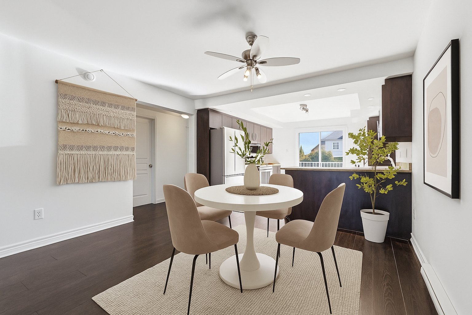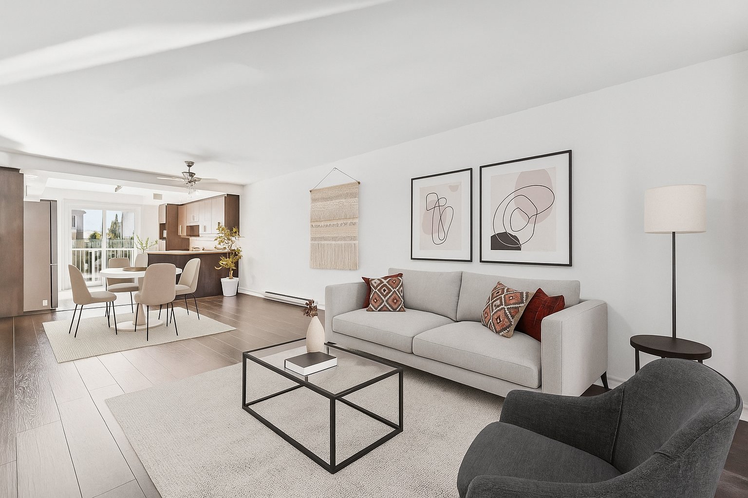 The living and dining area is bright and open, ideal for