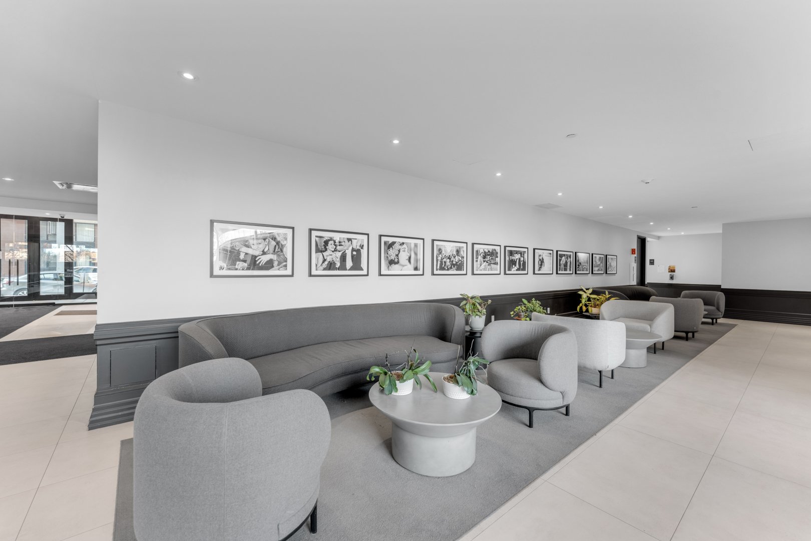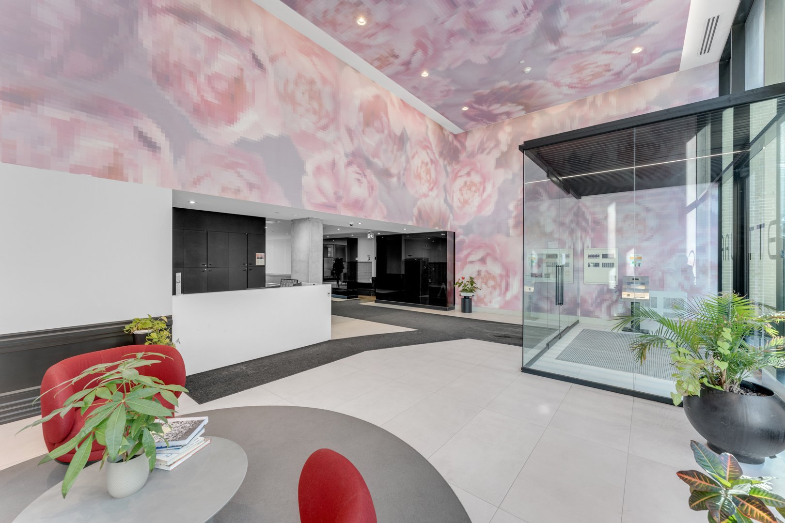 - Elegant, contemporary lobby with security guard.
