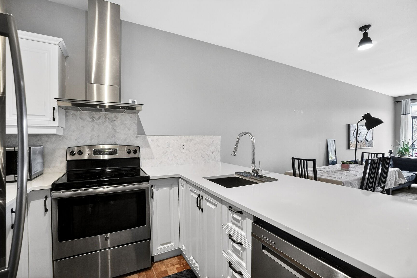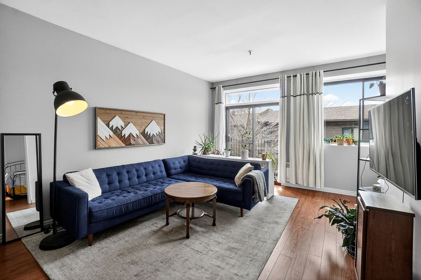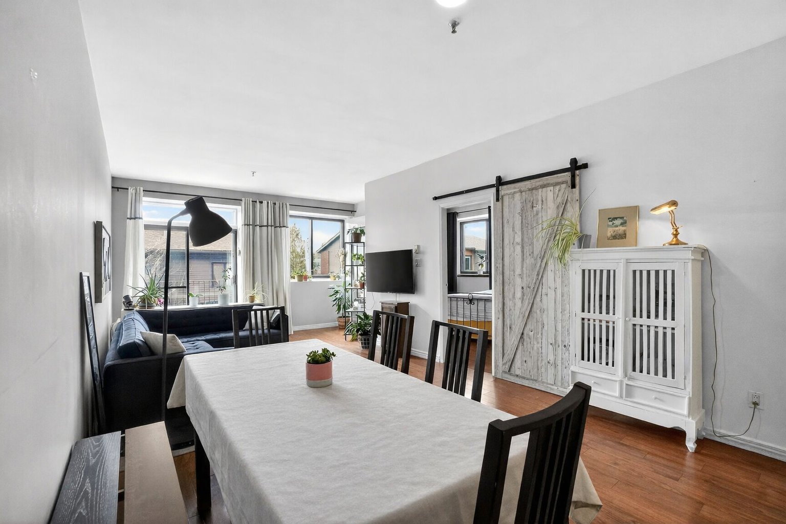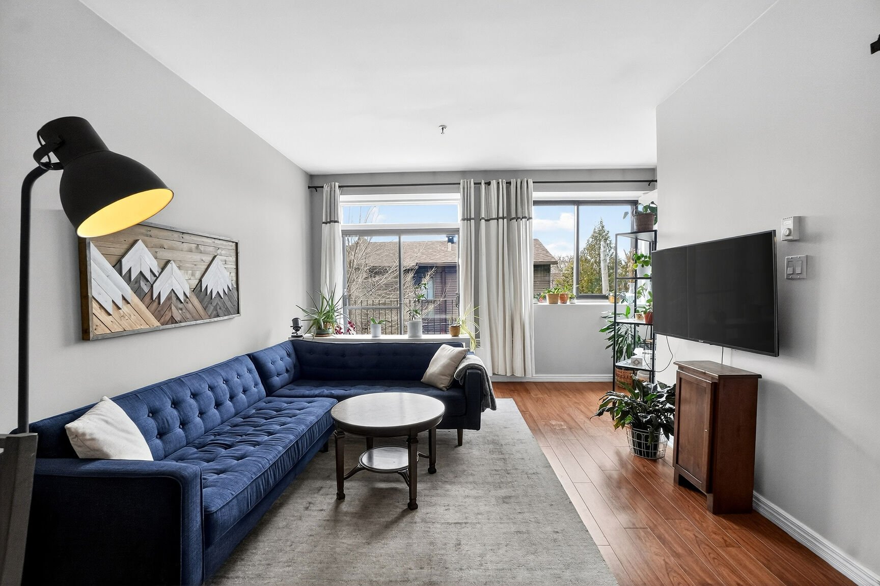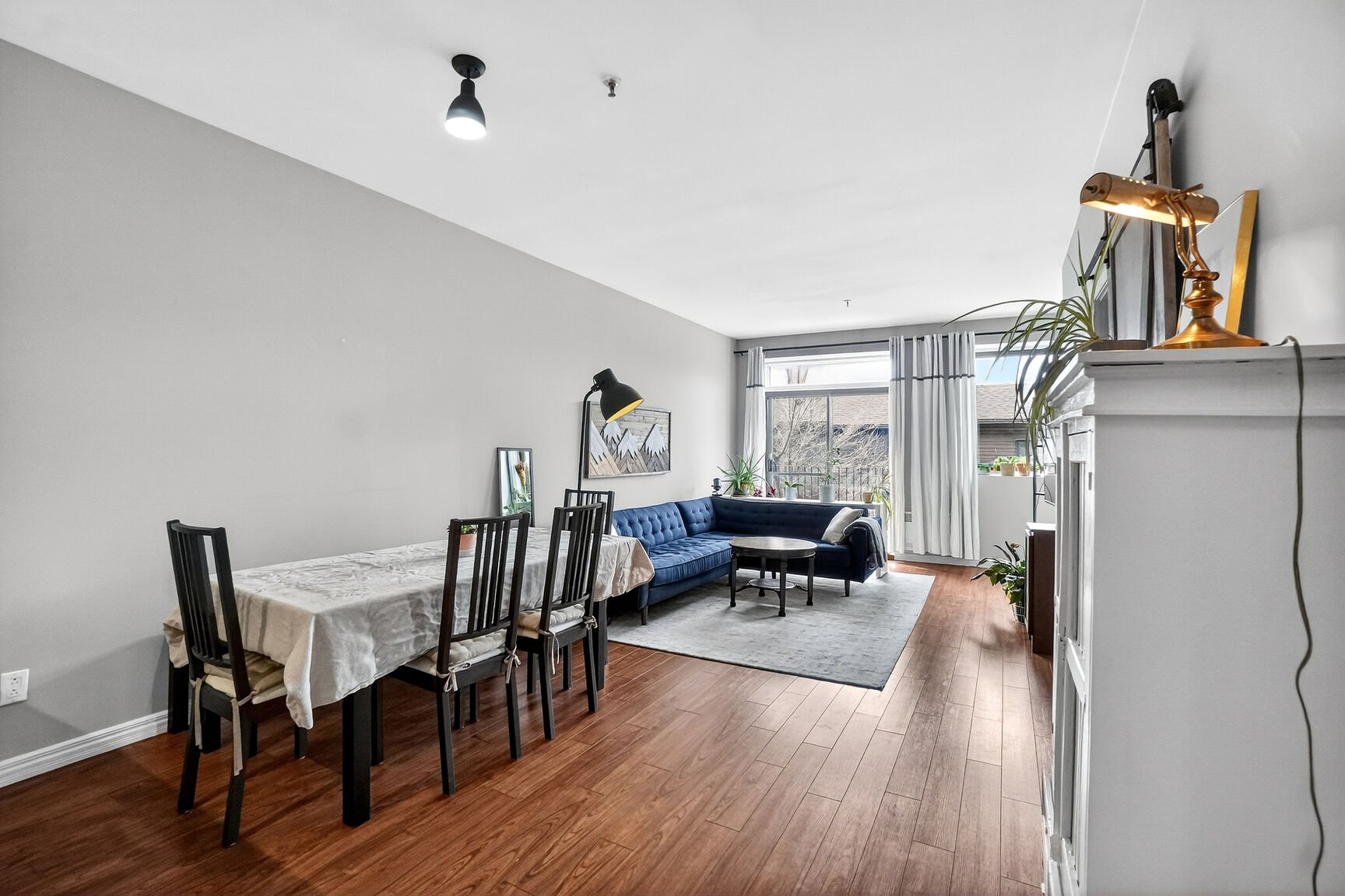 Welcome to 725 10th Avenue #206. Spacious two-bedroom condo in the heart of Lachine. It features hardwood and ceramic flooring, along with an open-concept living area combining the living room and dining room. The kitchen is functional and includes a breakfast bar. Two well-sized bedrooms, including one very spacious, each with its own closet. A full bathroom, a separate laundry room, and two large storage spaces at the entrance. Small private wraparound balcony and outdoor parking included.