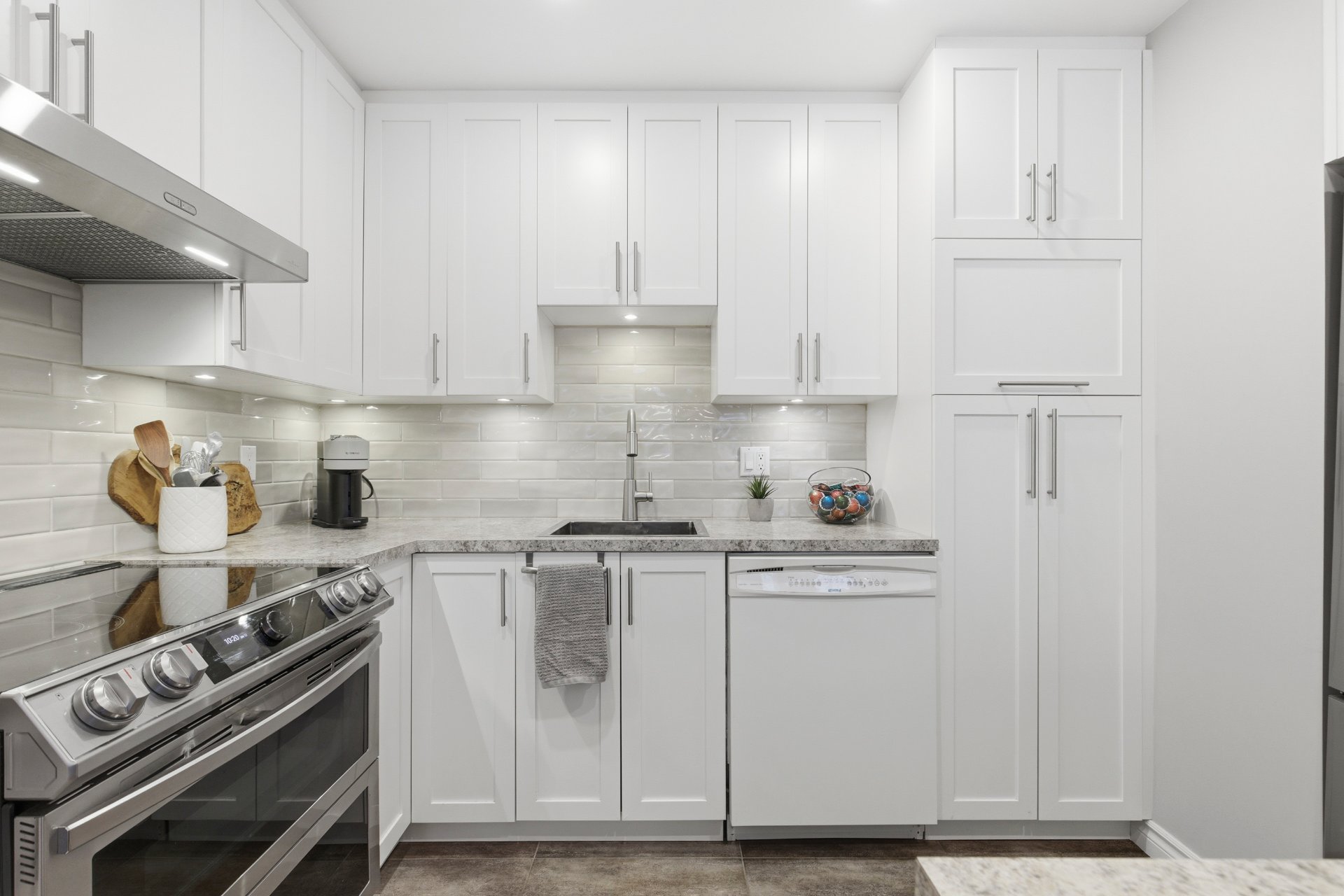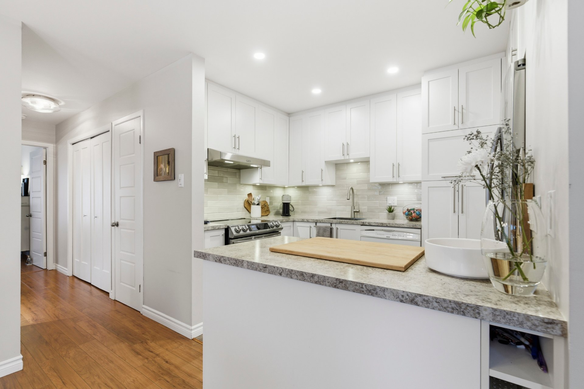 Corner unit with floor to ceiling windows, abundant light stunning corner unit flooded with natural light through expansive floor-to-ceiling windows. Features a beautifully renovated white designer kitchen with sleek finishes and modern spot lighting. Spa-inspired bathroom (2019) with a luxurious shower retreat. Oversized walk-in closet with custom lighting and stylish sliding barn doors. Warm wood paneling adds character to the primary bedroom, while elegant French doors lead to the spare bedroom. Includes a designated outdoor parking space and a private indoor storage locker. Building very well maintained.