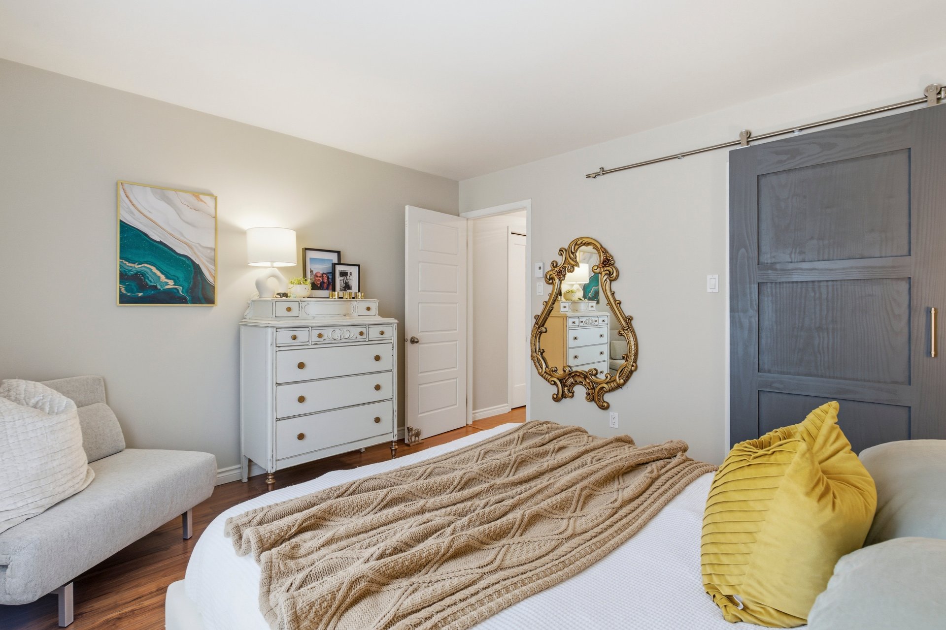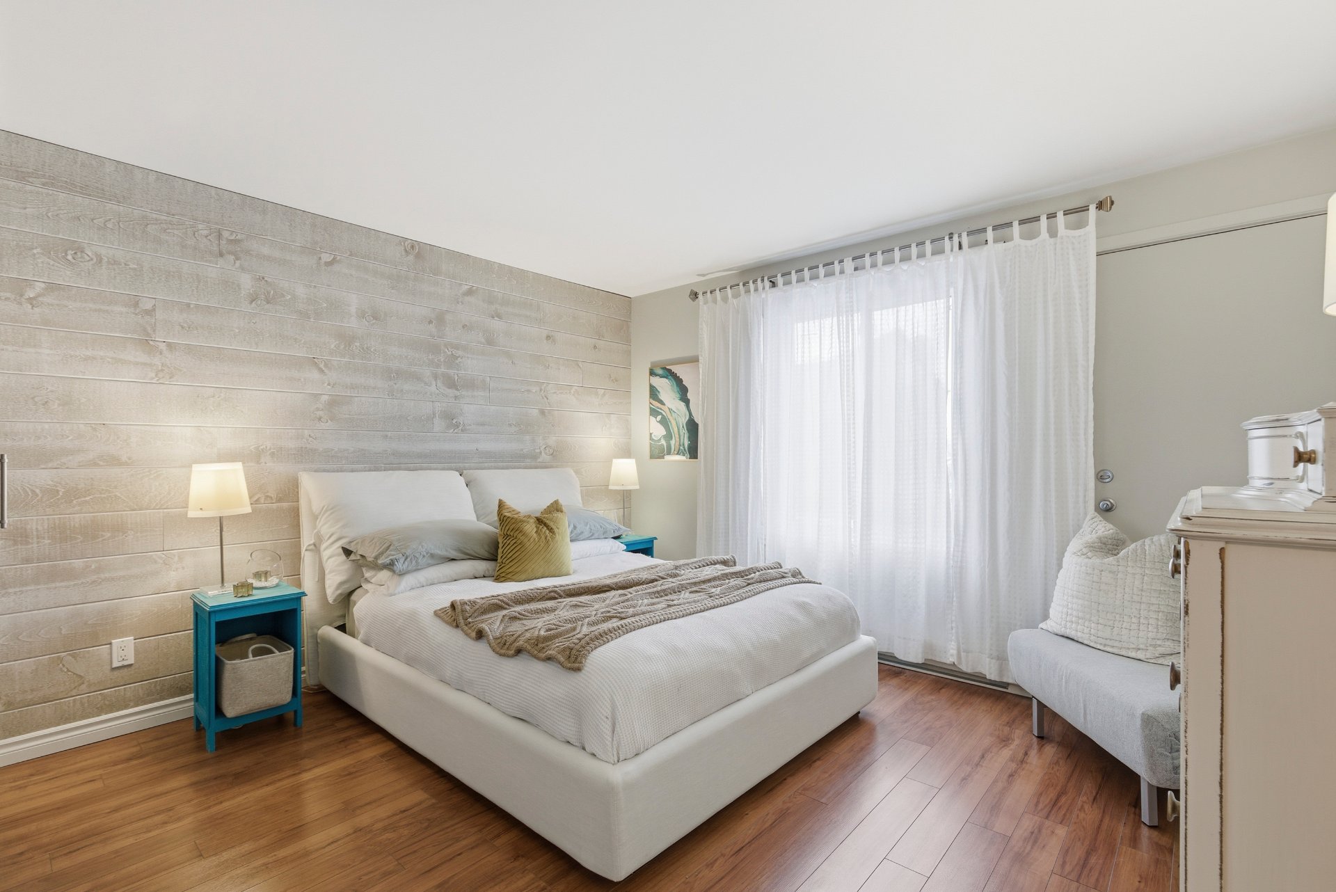 * Master bedroom featuring wood accent wall and sliding