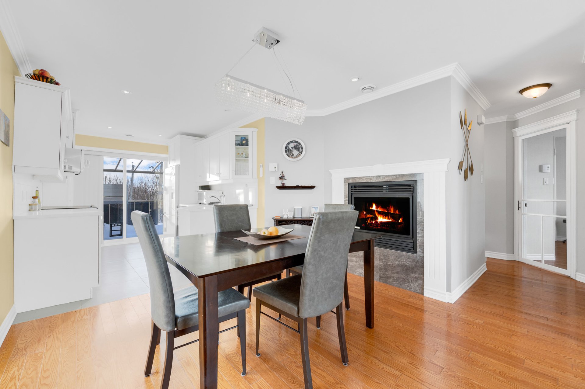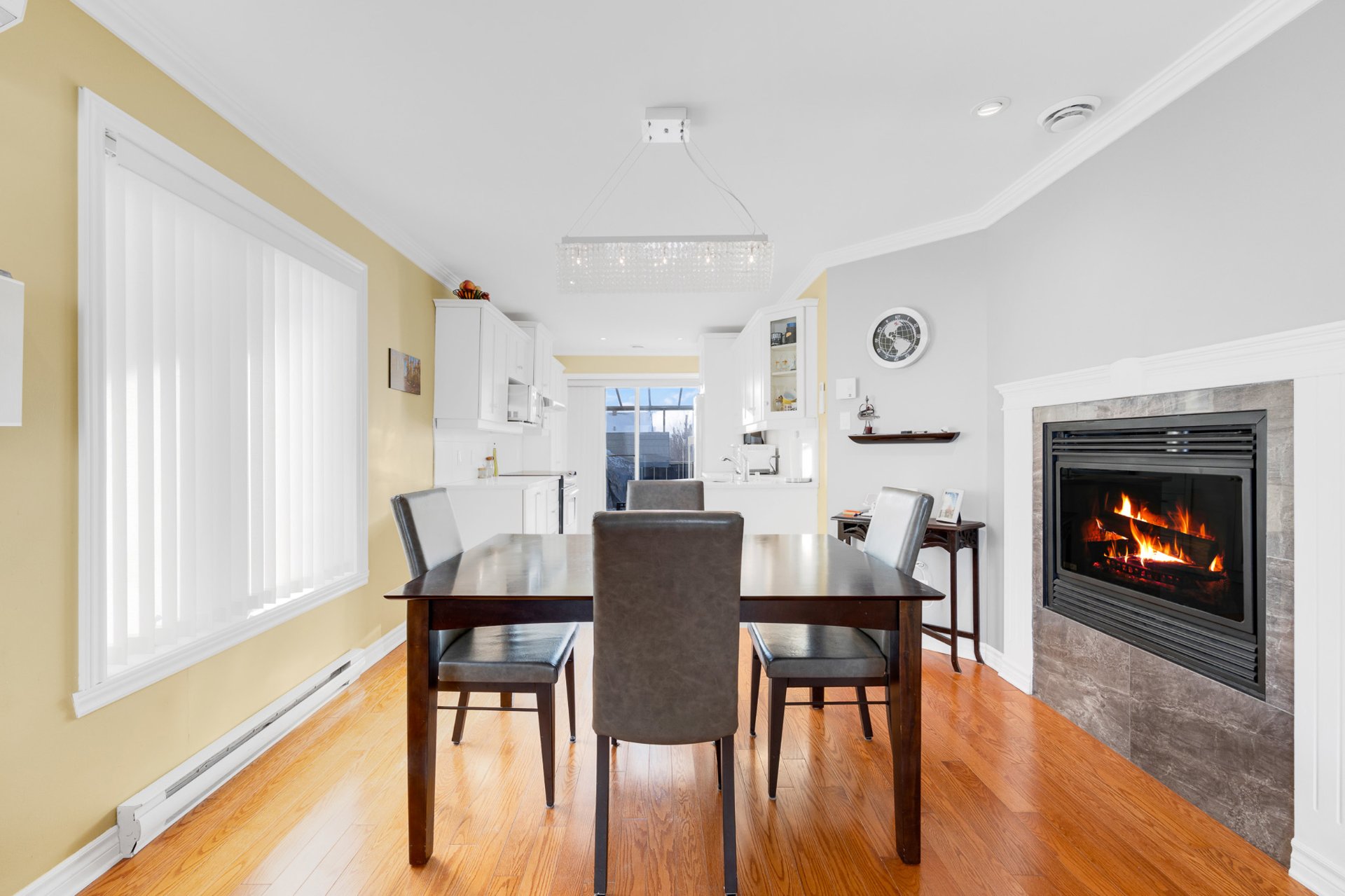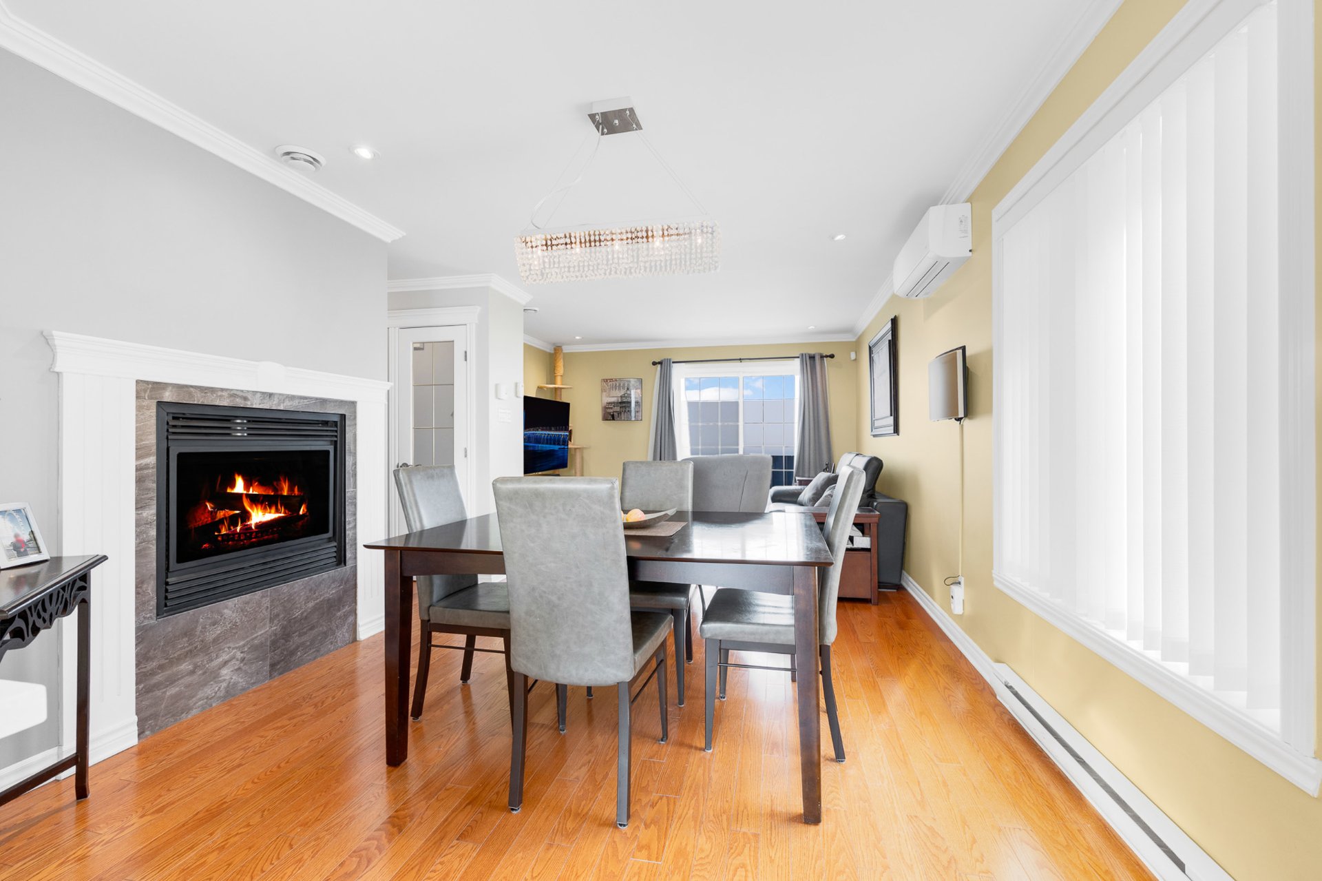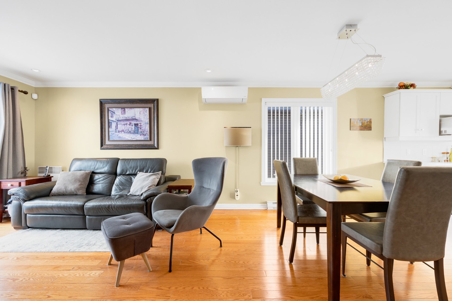 The open-concept living and dining area is enhanced by a