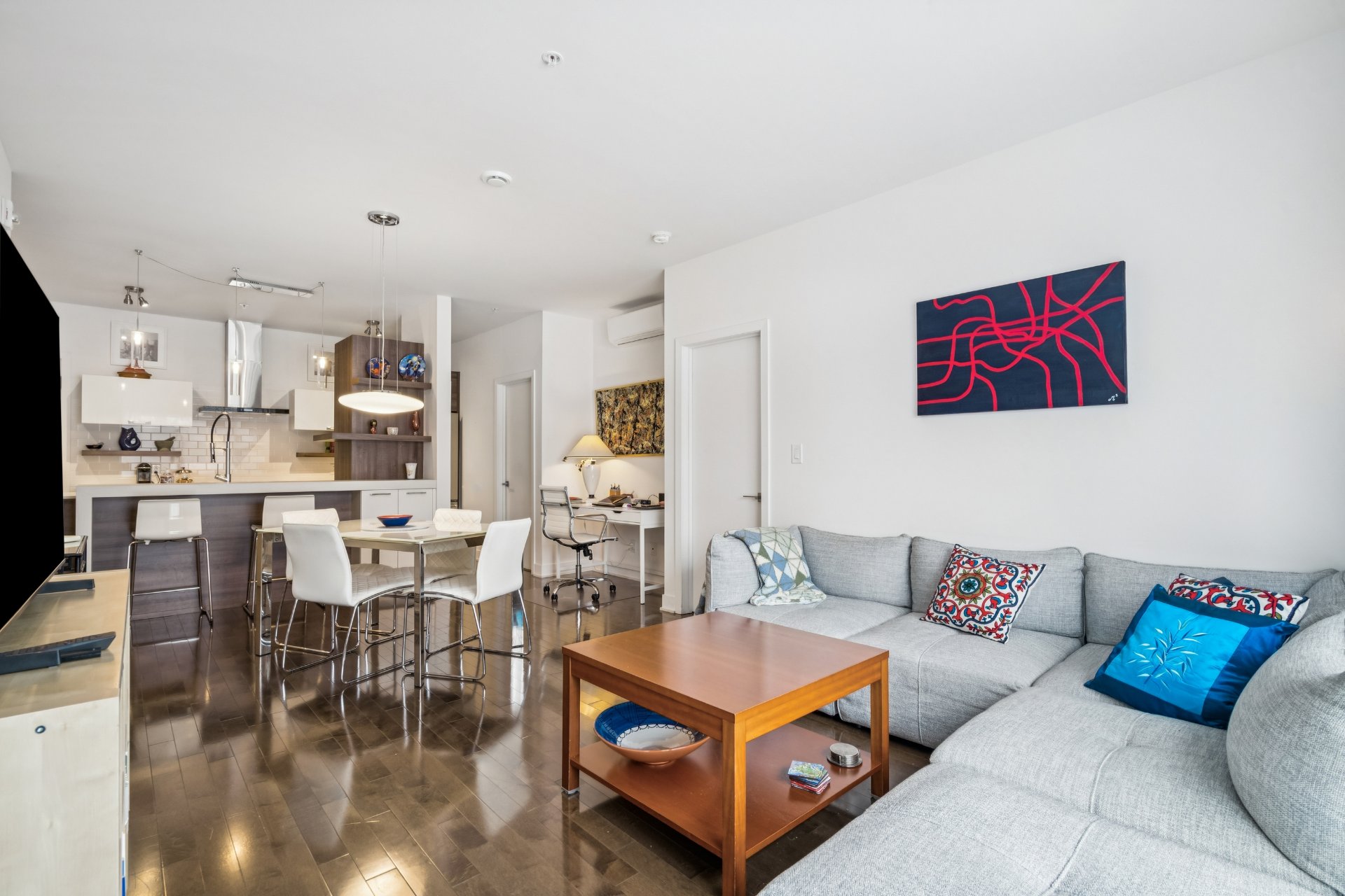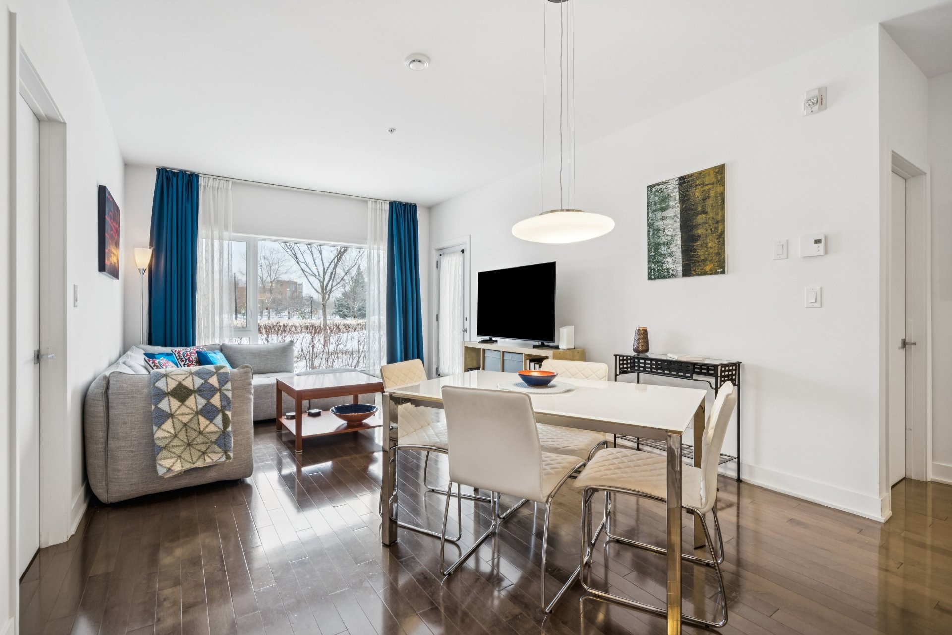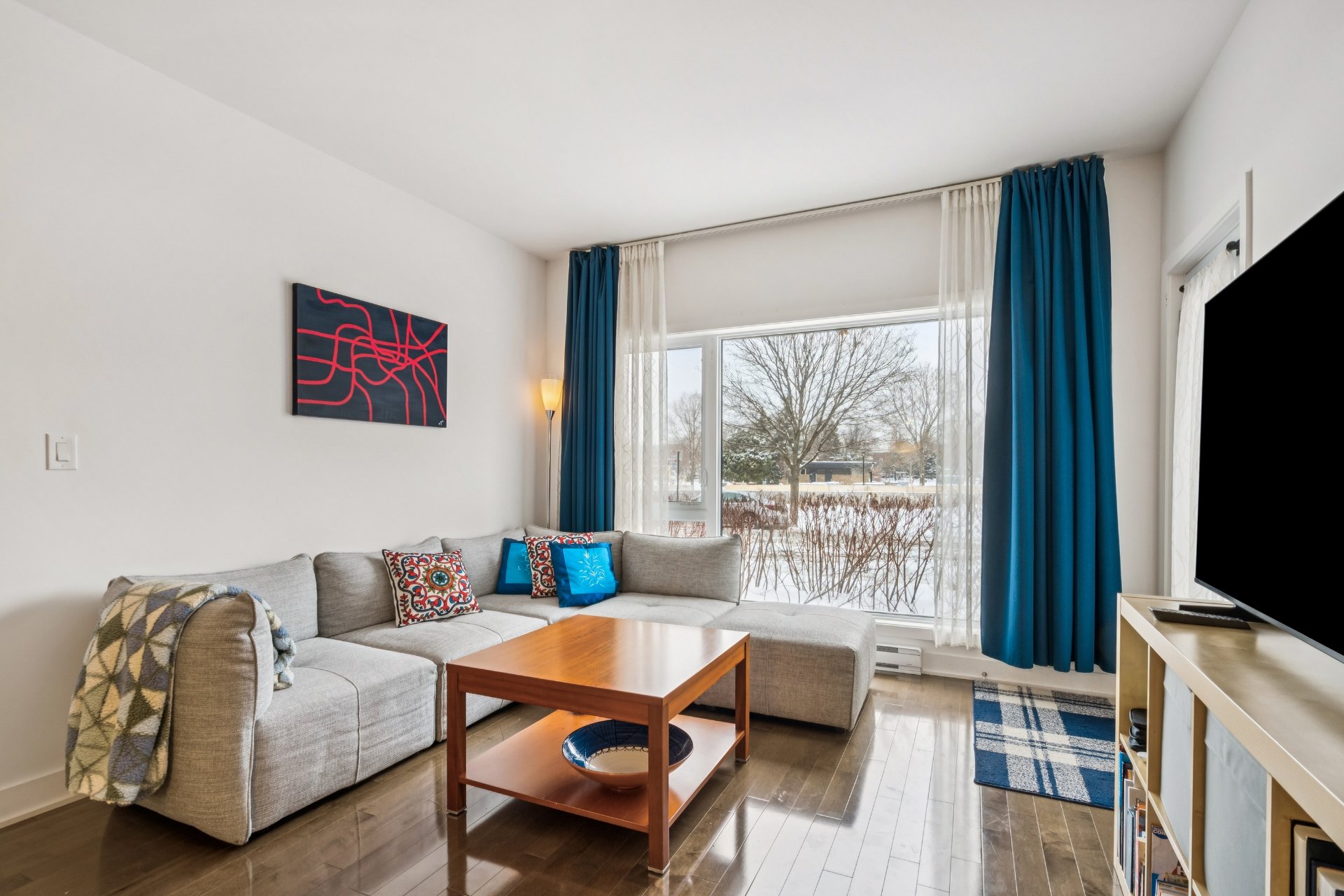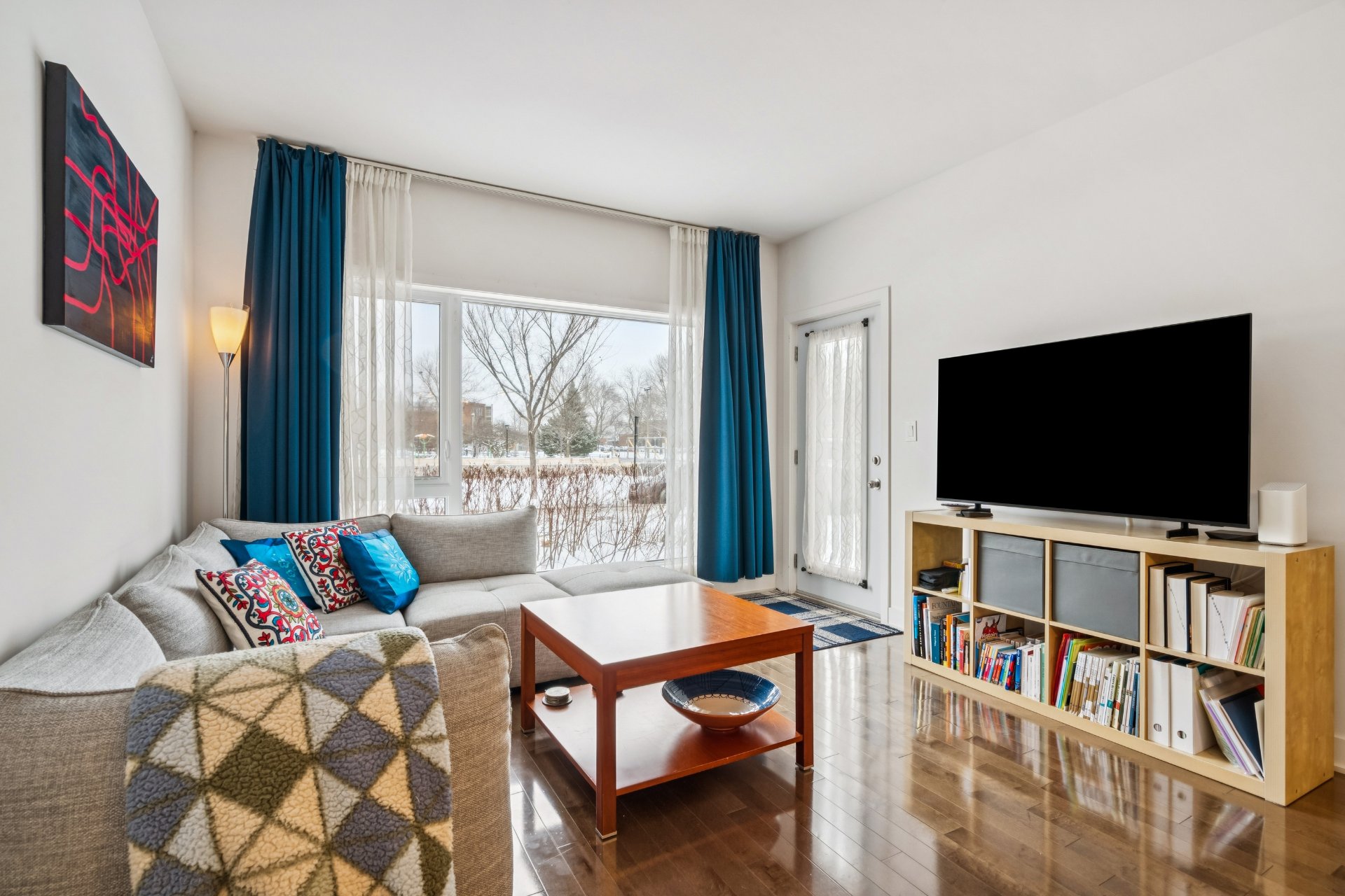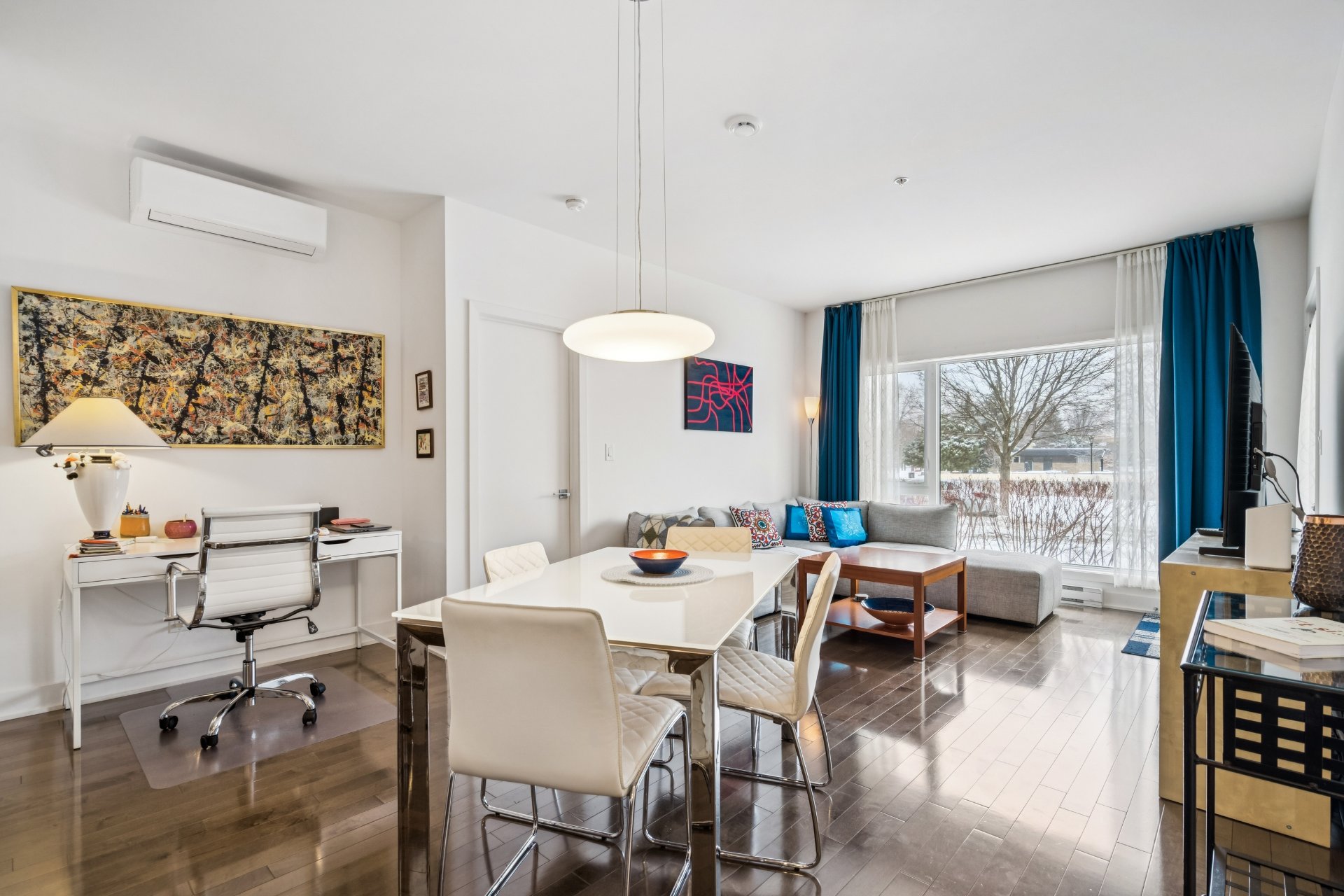 Open-concept living area facing the park