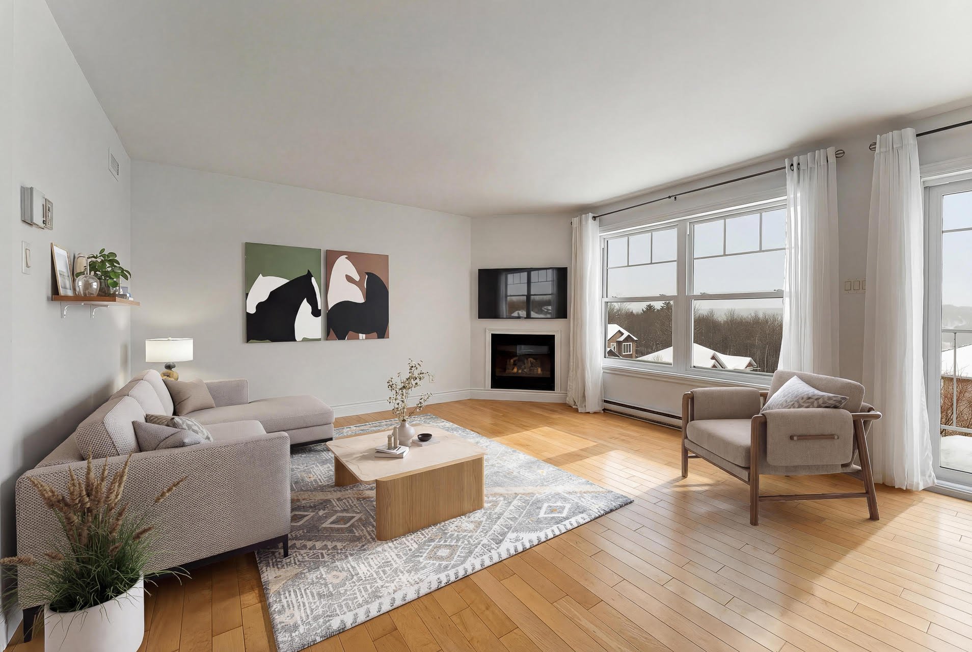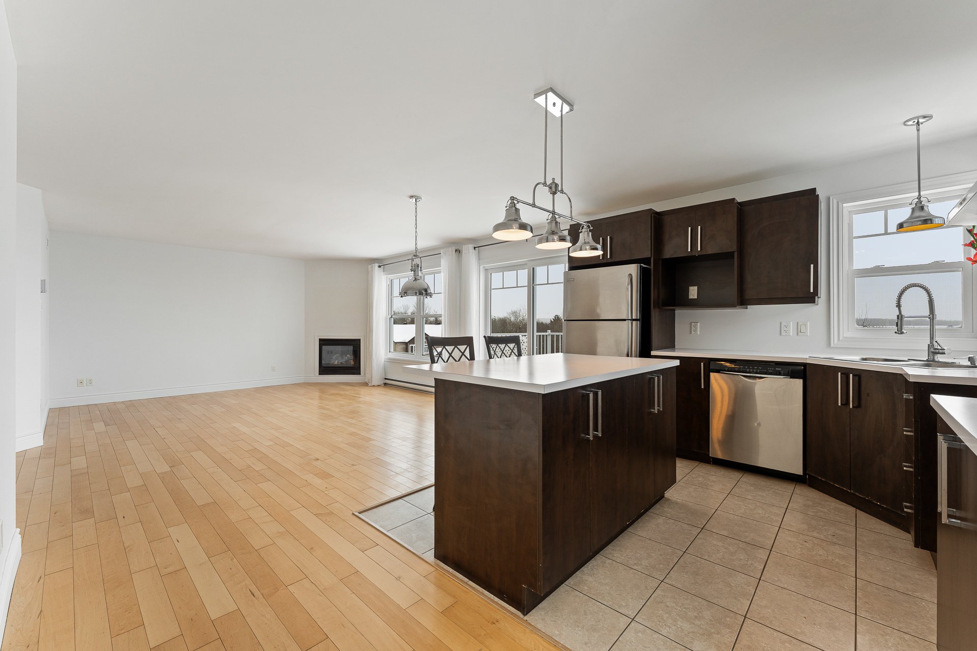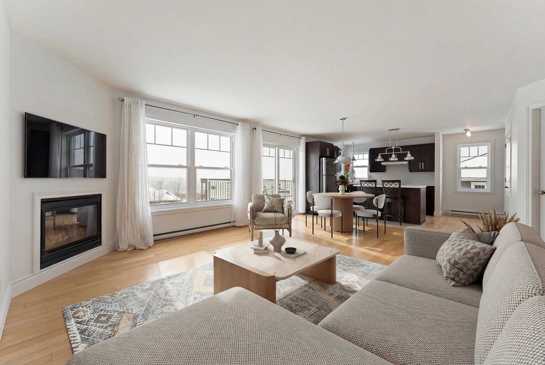 atmosphere. The living room is enhanced by a gas fireplace,