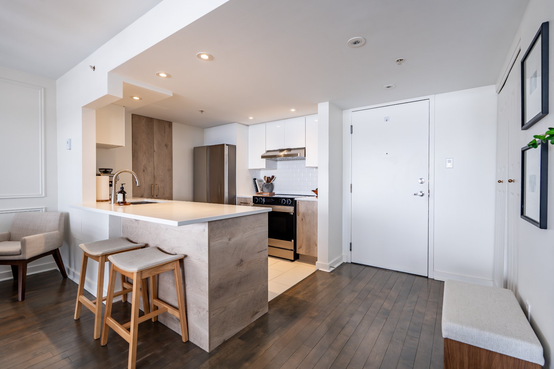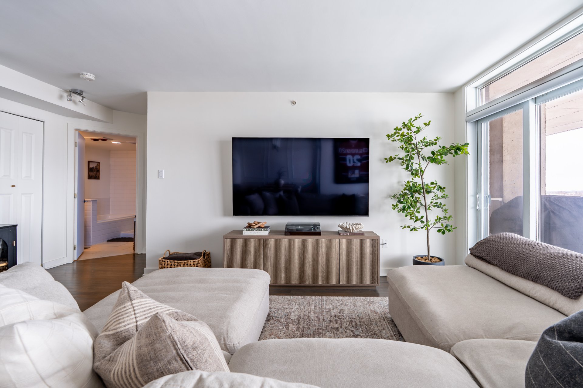 The condo features a spacious open-concept layout filled